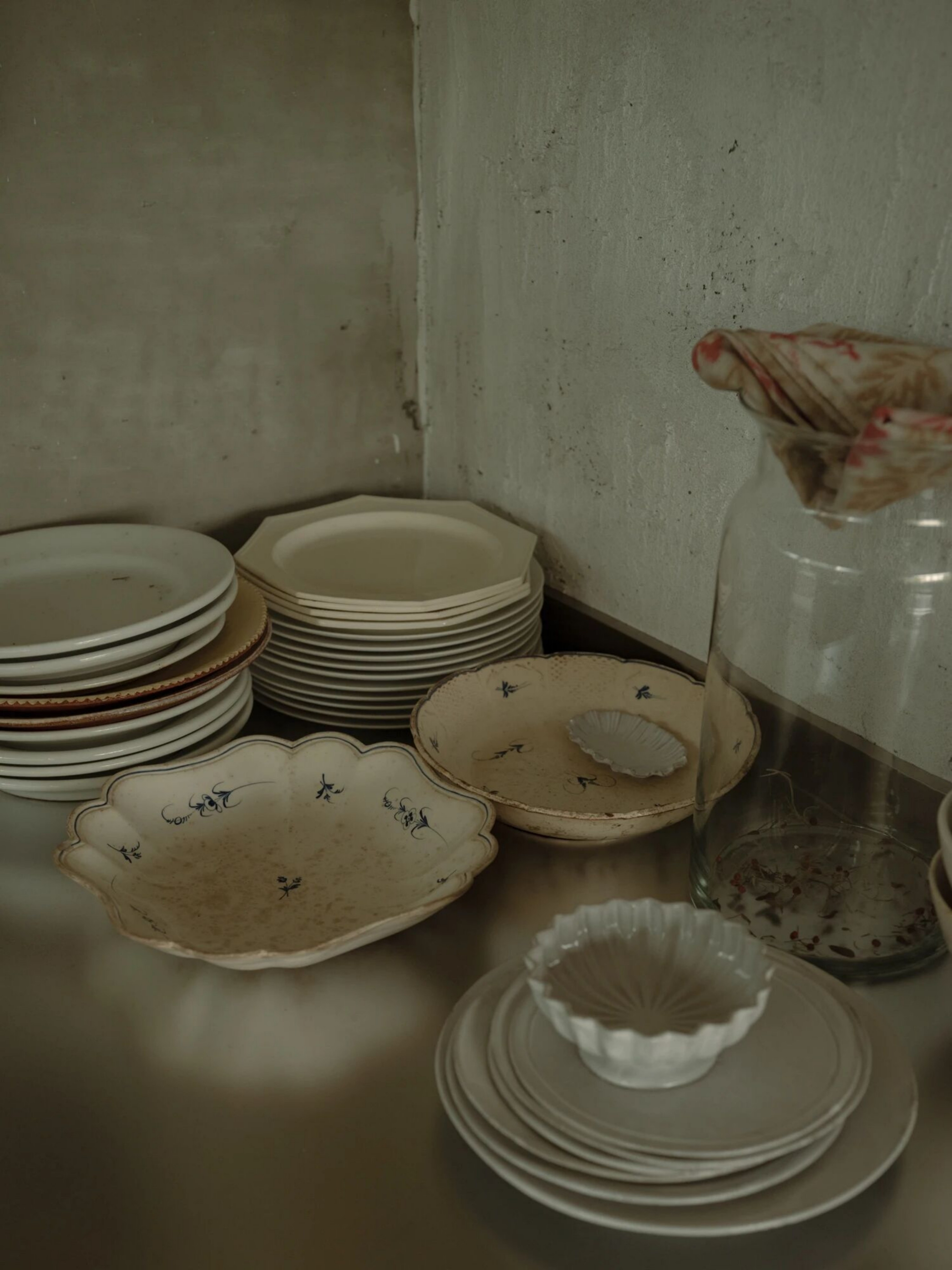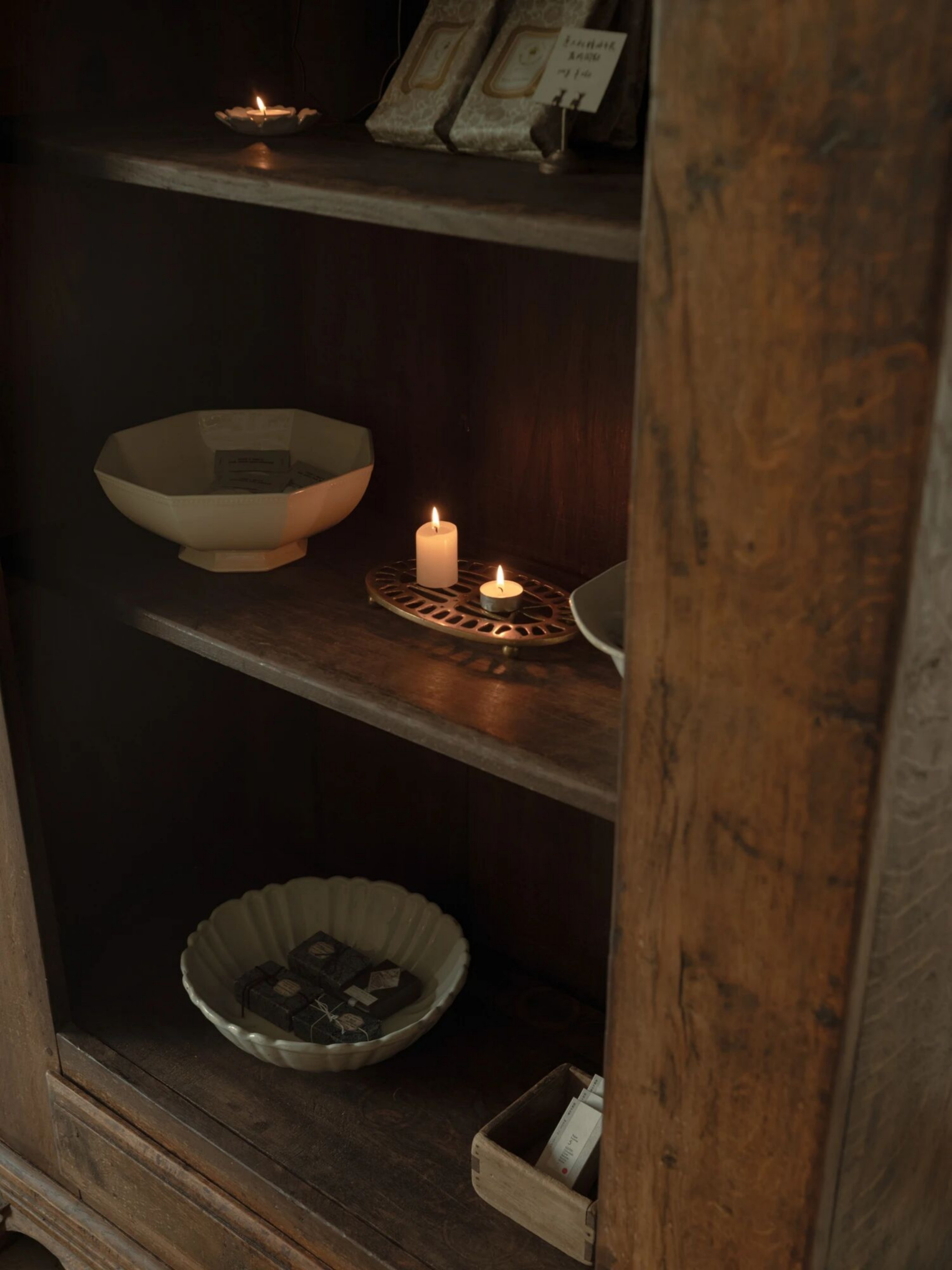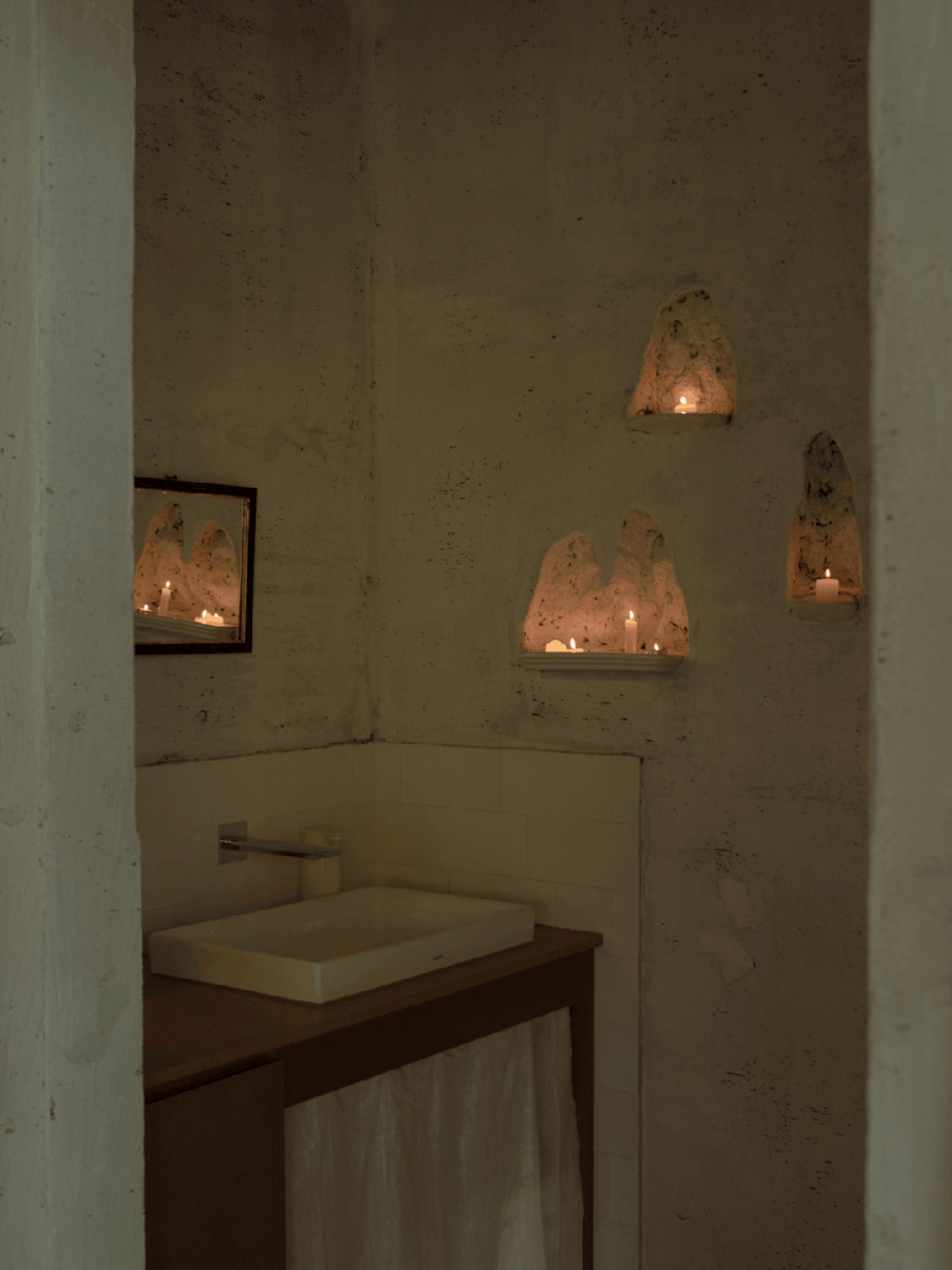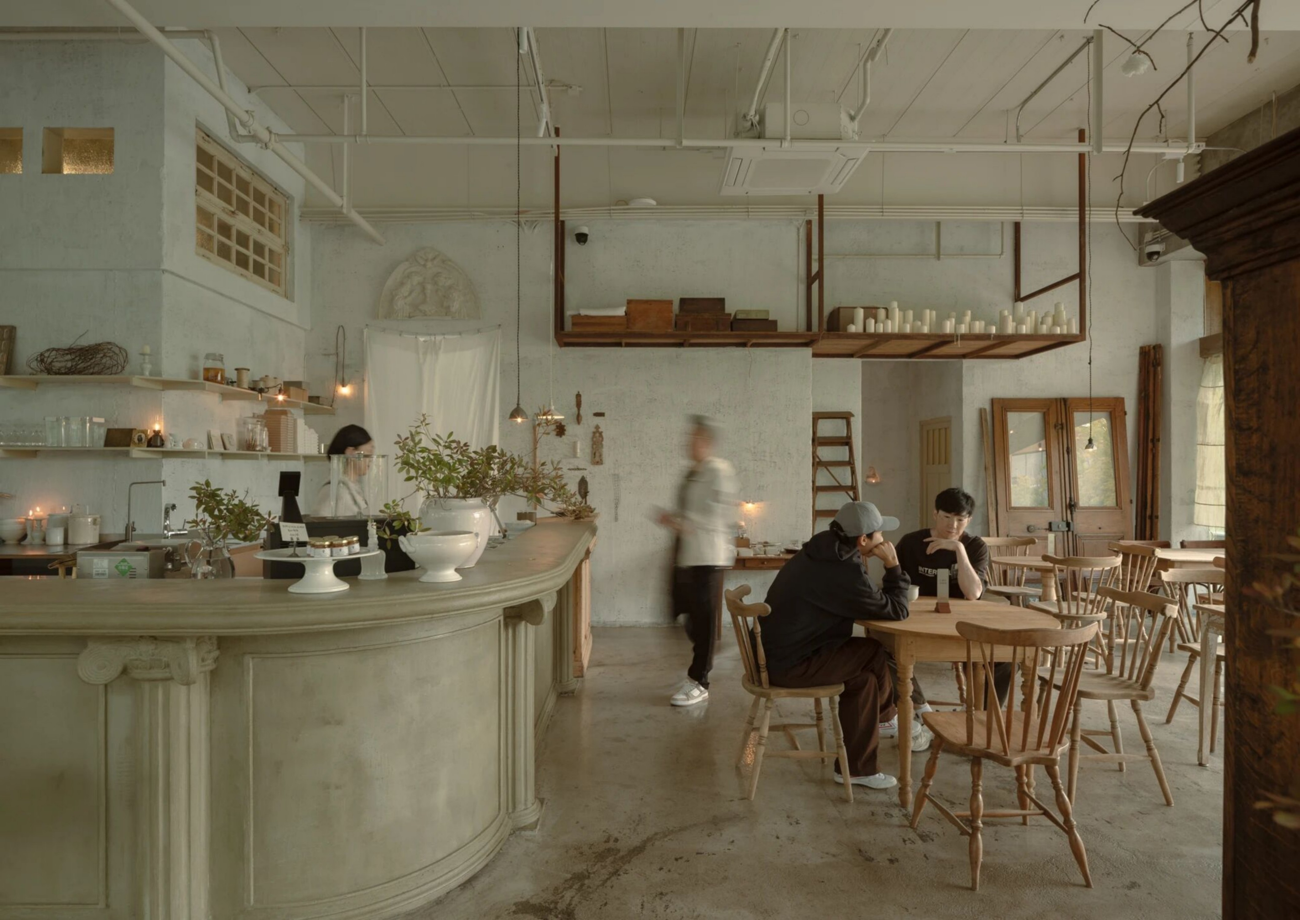 空间意境:空间聚焦到产品的品质,不只是对甜品的精细打磨,更在于整体氛围中传递出的手作气息。从设计伊始,我们便希望以一种沉着克制的语气,让时间沉淀的质感发声。空间不强调“装修”的存在感,而是以物件为主角展开。我们将室内的表达留给器物、机理与材质,构建出一个由物件语言组成的氛围场域。主理人在世界各地淘来了精美的器物,我们共同将其融入在空间里,让每一位到访者都能在使用中触碰到生活美学的细腻感知。