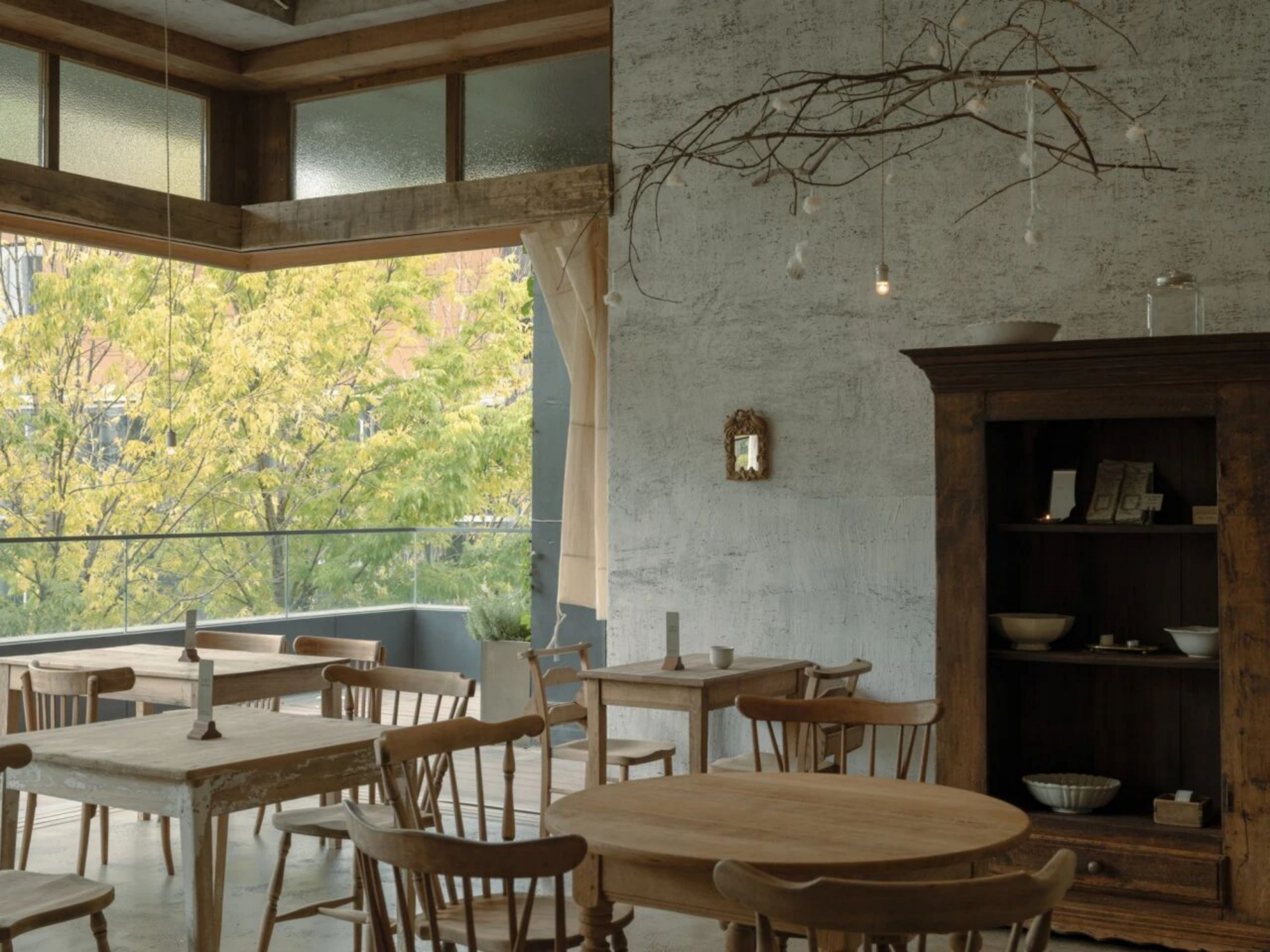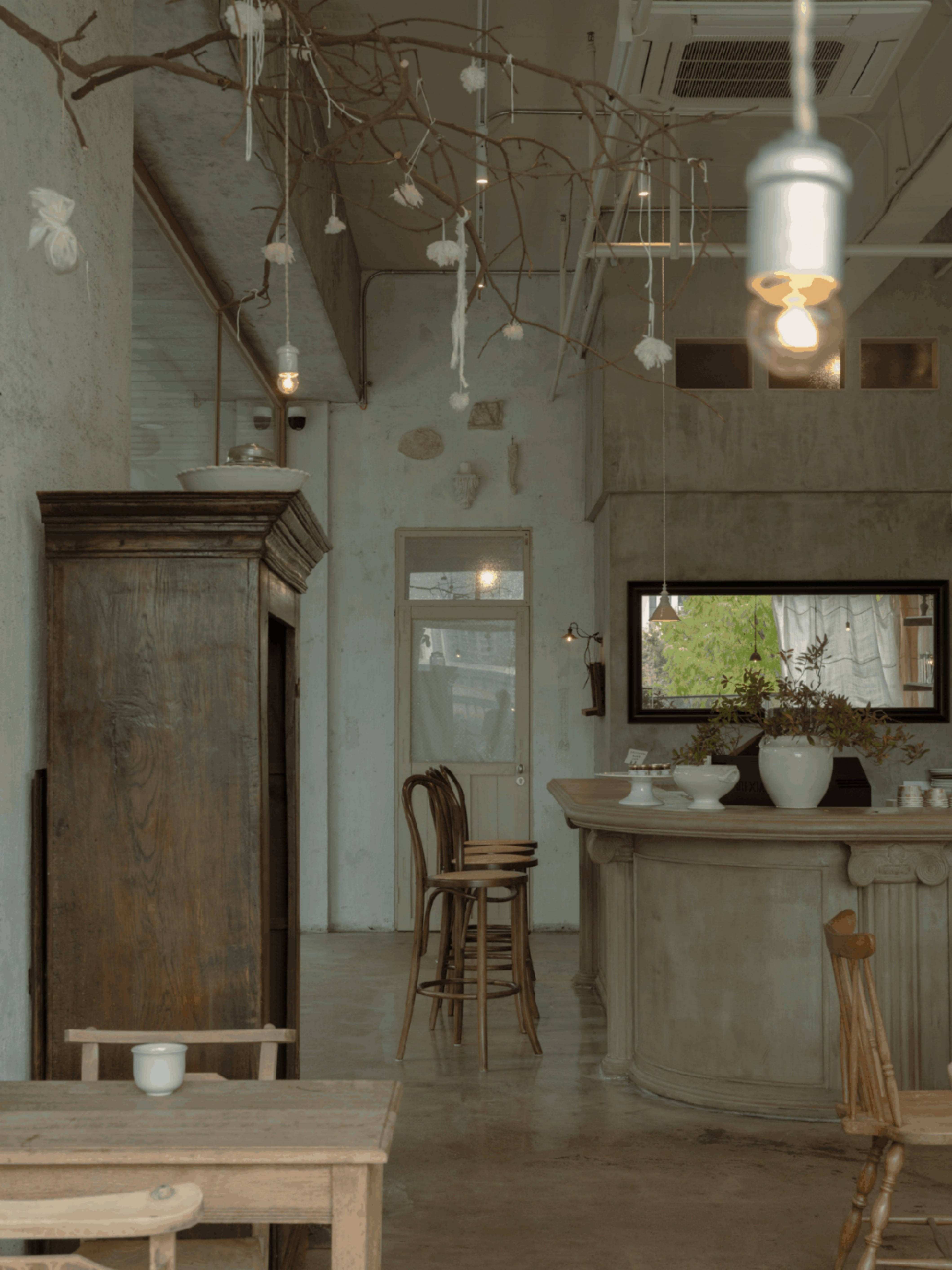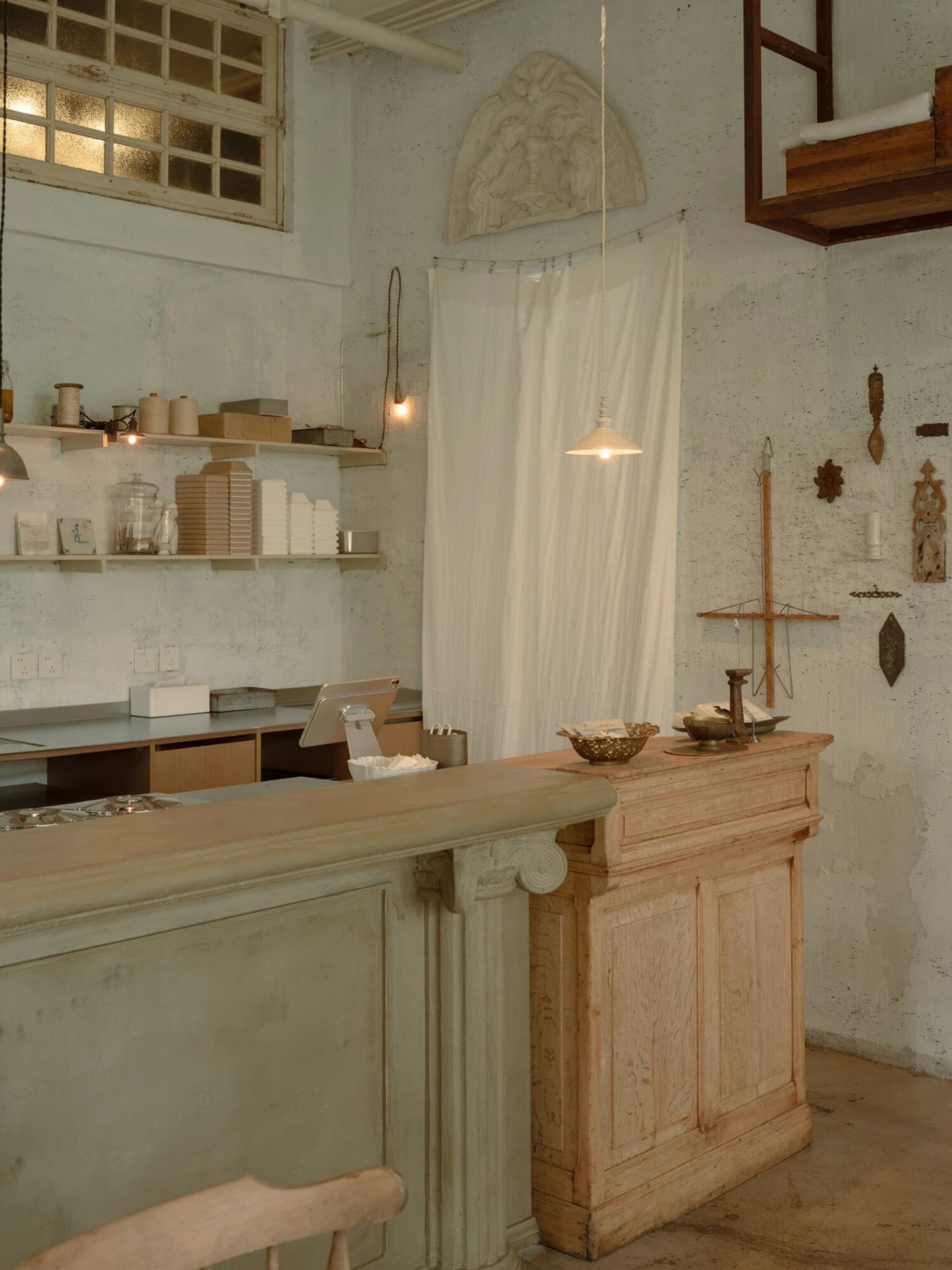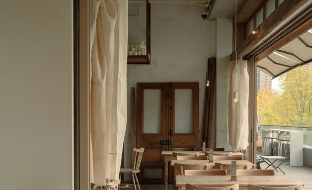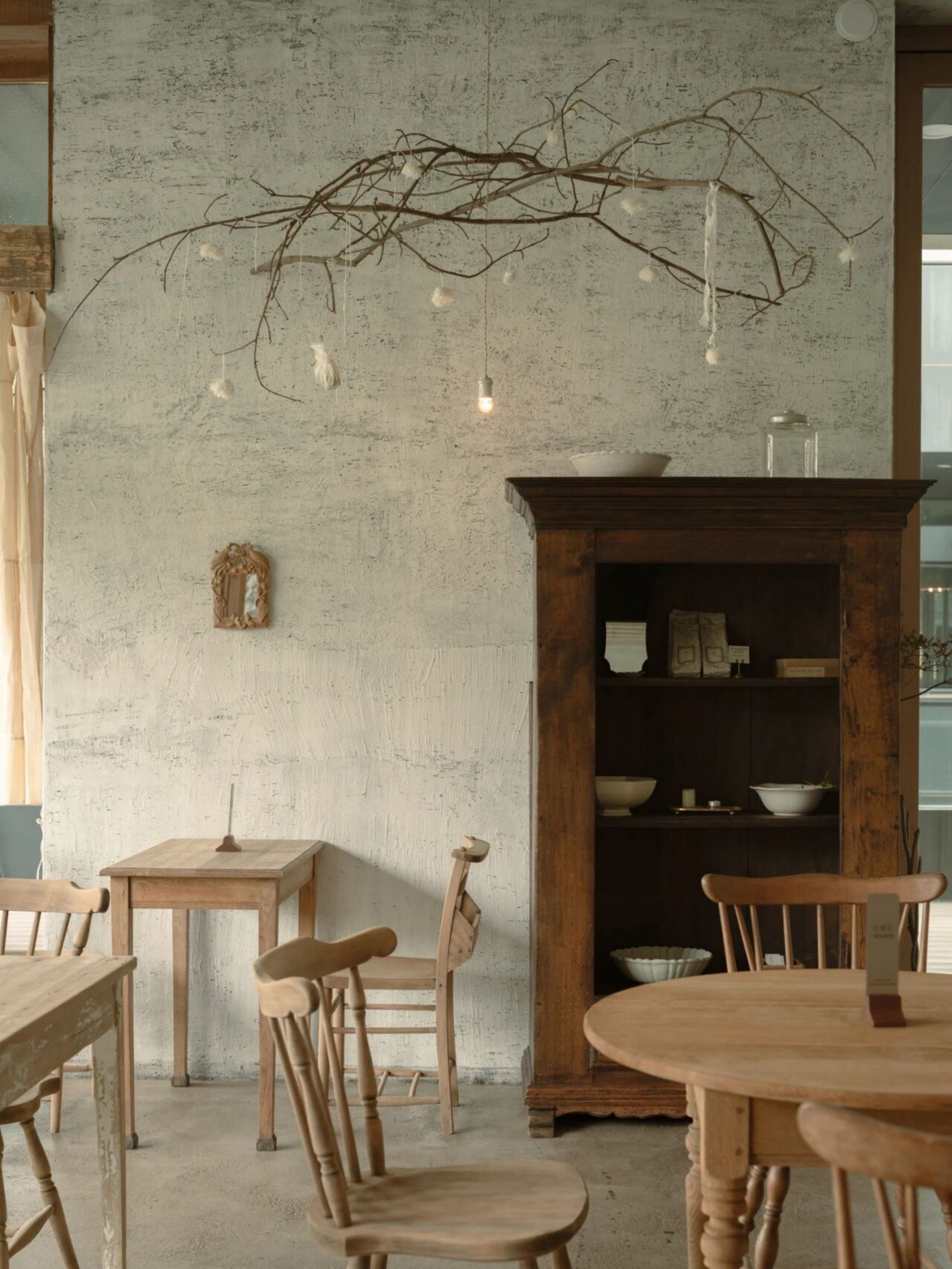 设计选材:空间的每一个细节都蕴含着美学思考。从桌椅、器皿到窗帘、摆件,都是对“日常中的温柔”所作的回应。我们希望人们在不经意间被某个细节轻轻打动。大量原木材质被使用于家具和装置中,每一块木板都经过精挑细选,保留了天然的肌理。墙面采用自然肌理的处理方式,与布帘交叠出柔软安静的气息。手作的产品是时间的产物,时光积累形成温度,我们希望人能感受到,不需要用言语表达的品质。