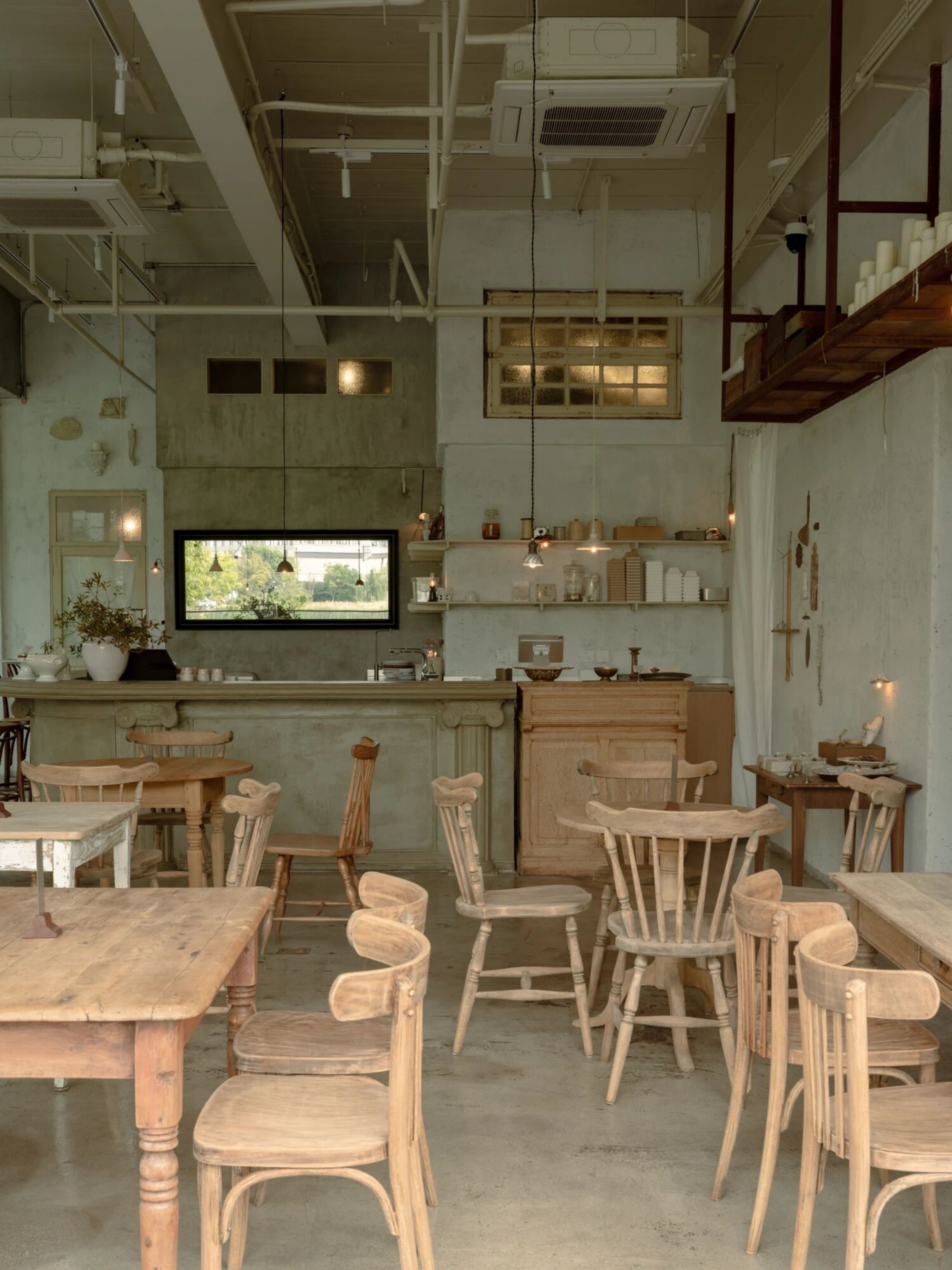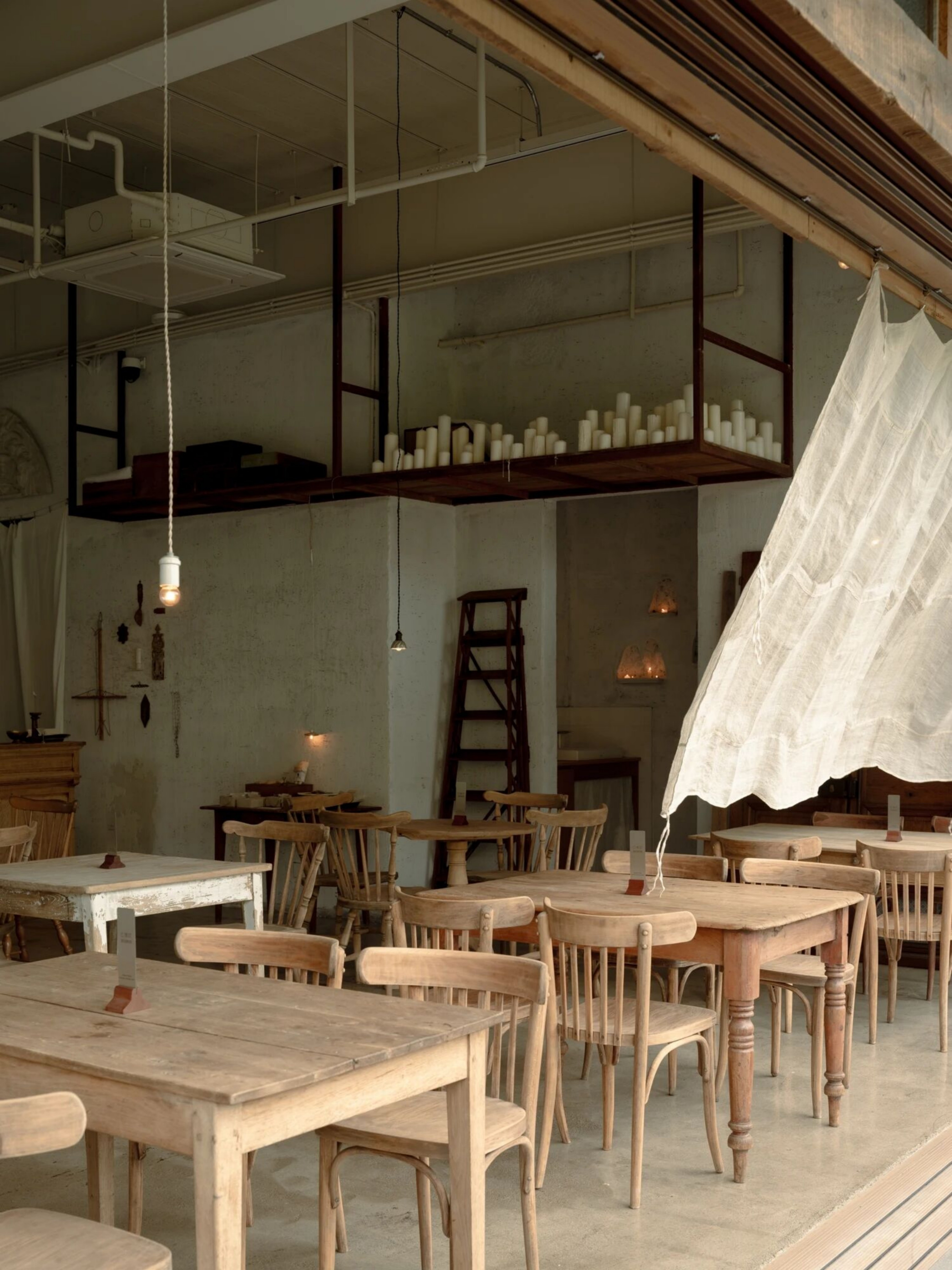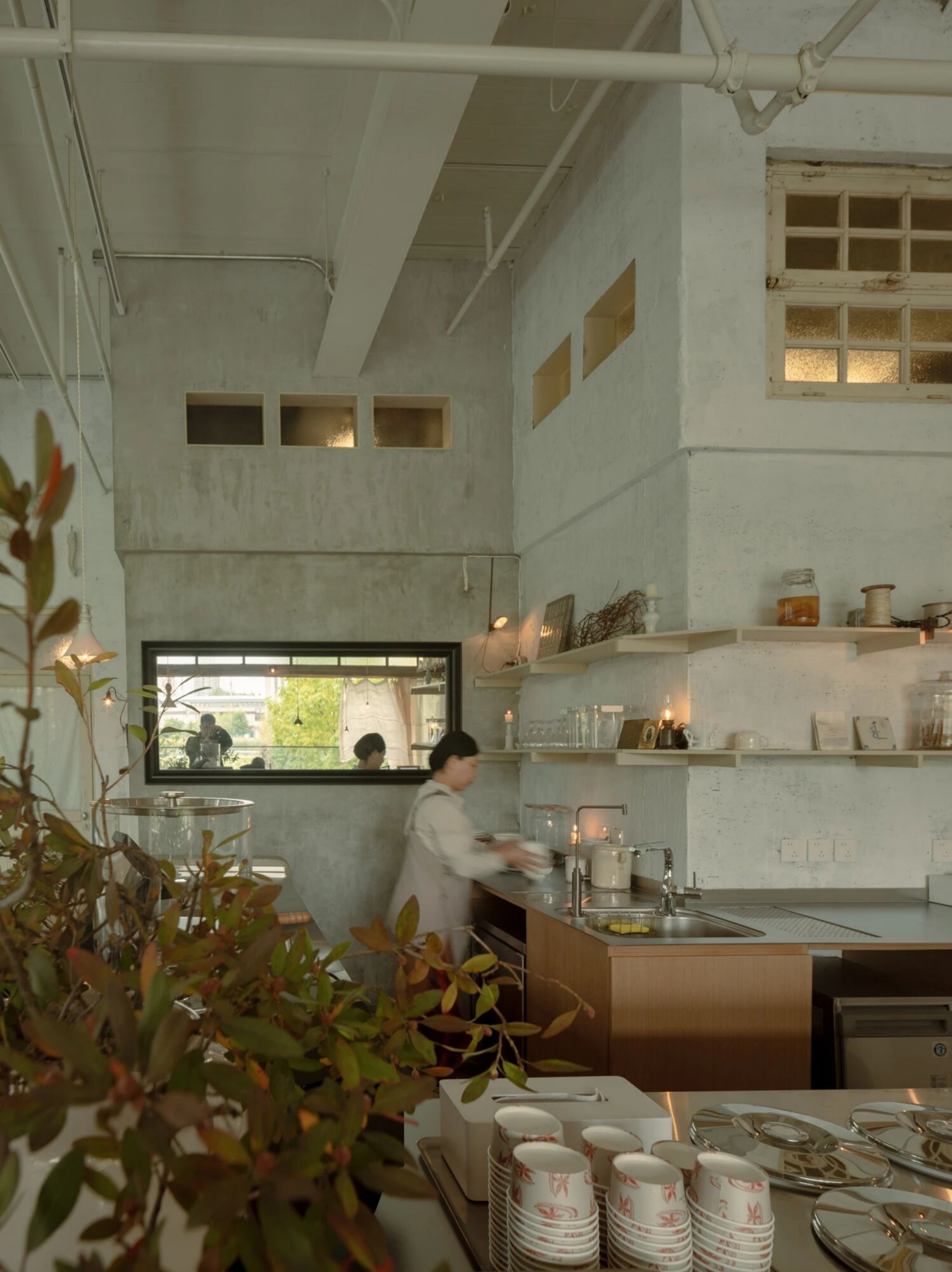 设计选材:空间的每一个细节都蕴含着美学思考。从桌椅、器皿到窗帘、摆件,都是对“日常中的温柔”所作的回应。我们希望人们在不经意间被某个细节轻轻打动。大量原木材质被使用于家具和装置中,每一块木板都经过精挑细选,保留了天然的肌理。墙面采用自然肌理的处理方式,与布帘交叠出柔软安静的气息。手作的产品是时间的产物,时光积累形成温度,我们希望人能感受到,不需要用言语表达的品质。