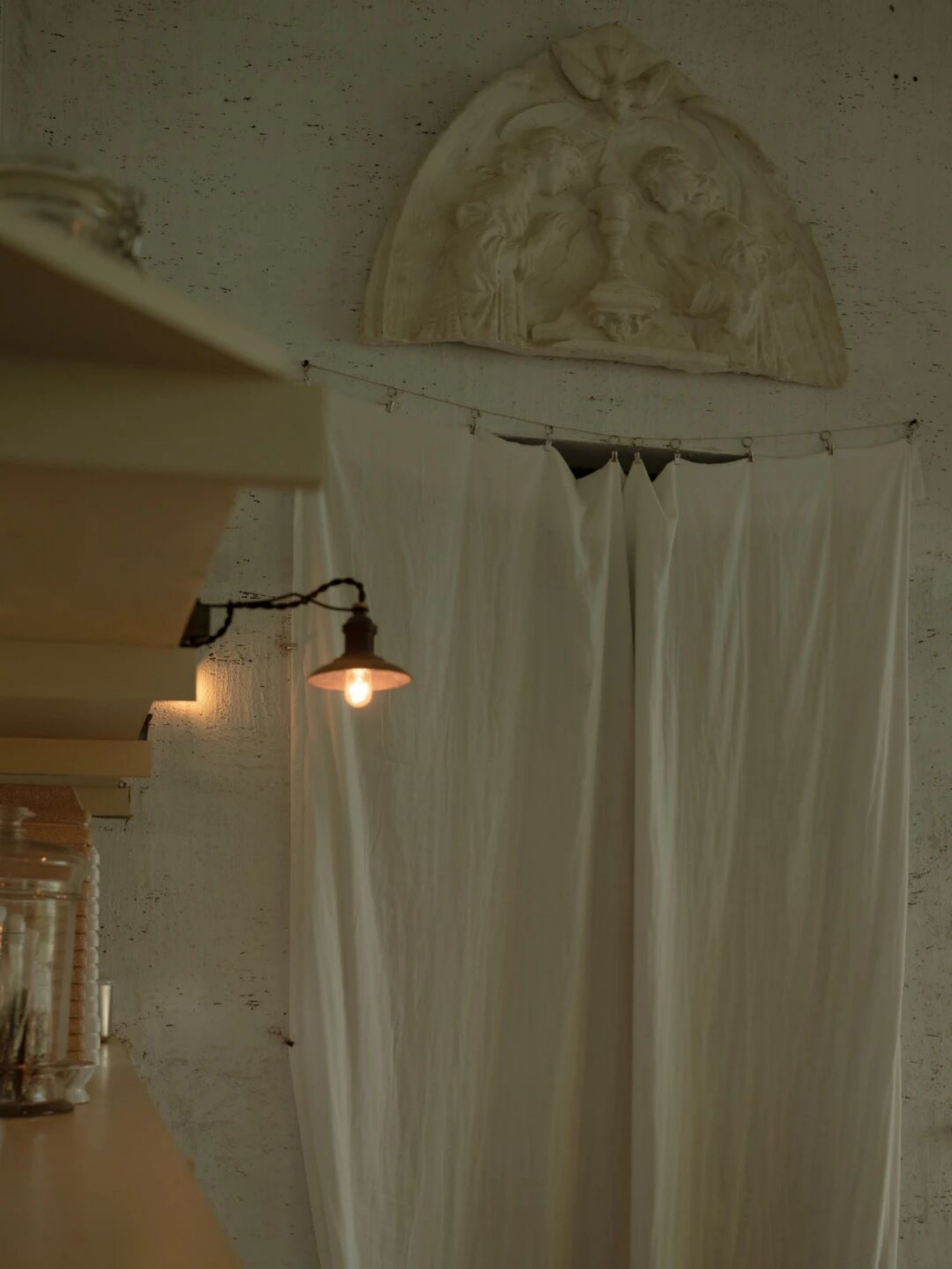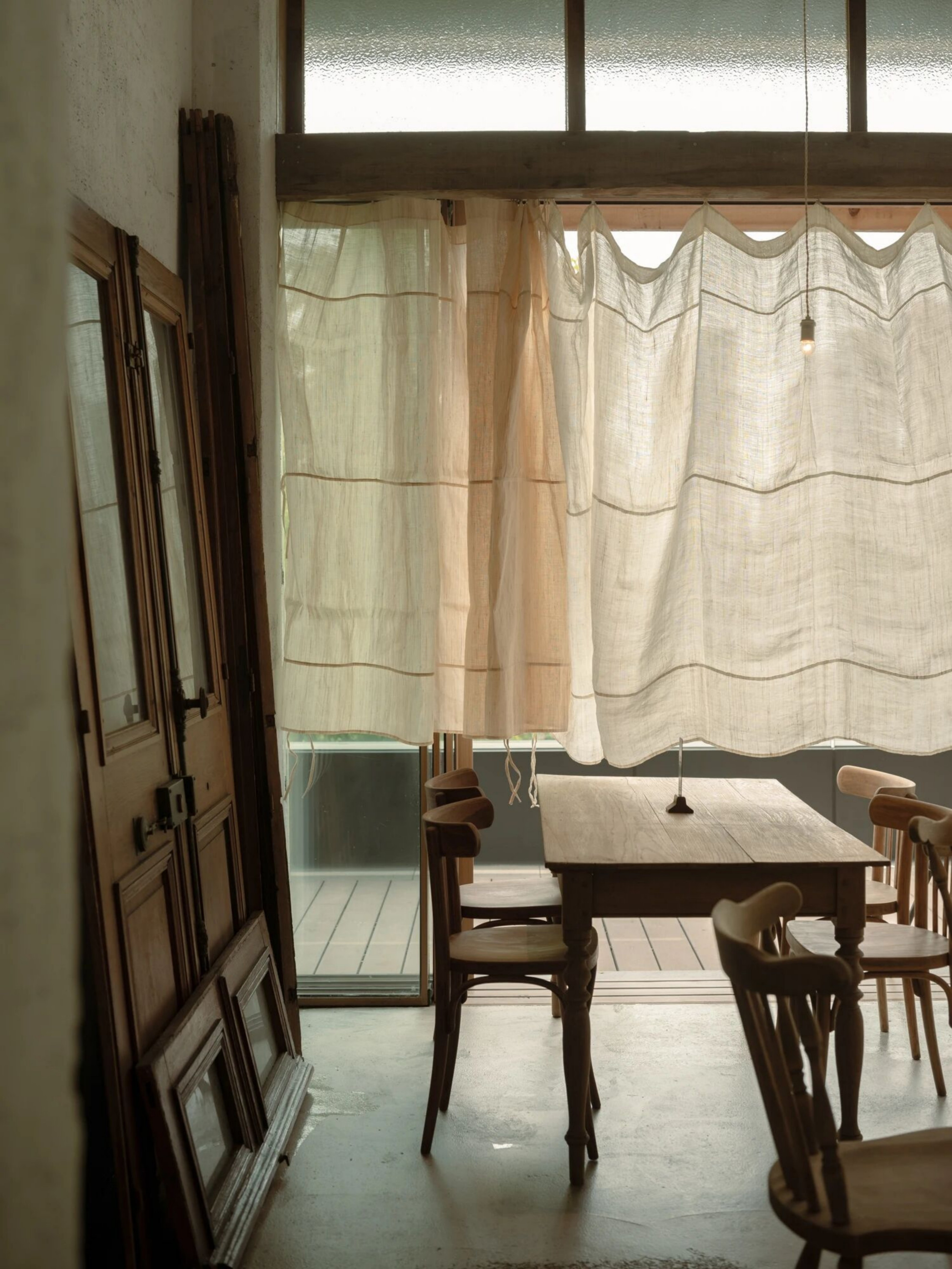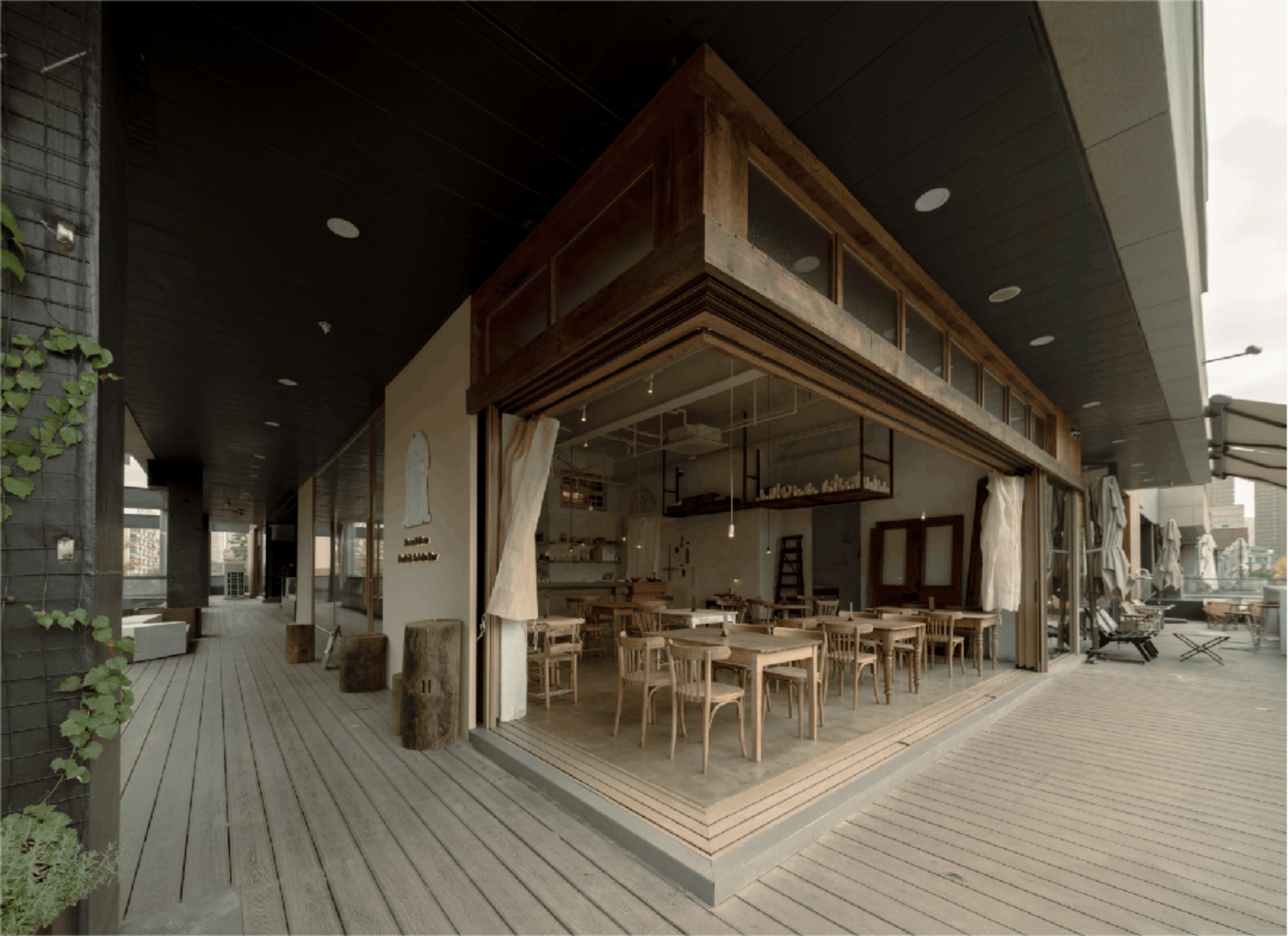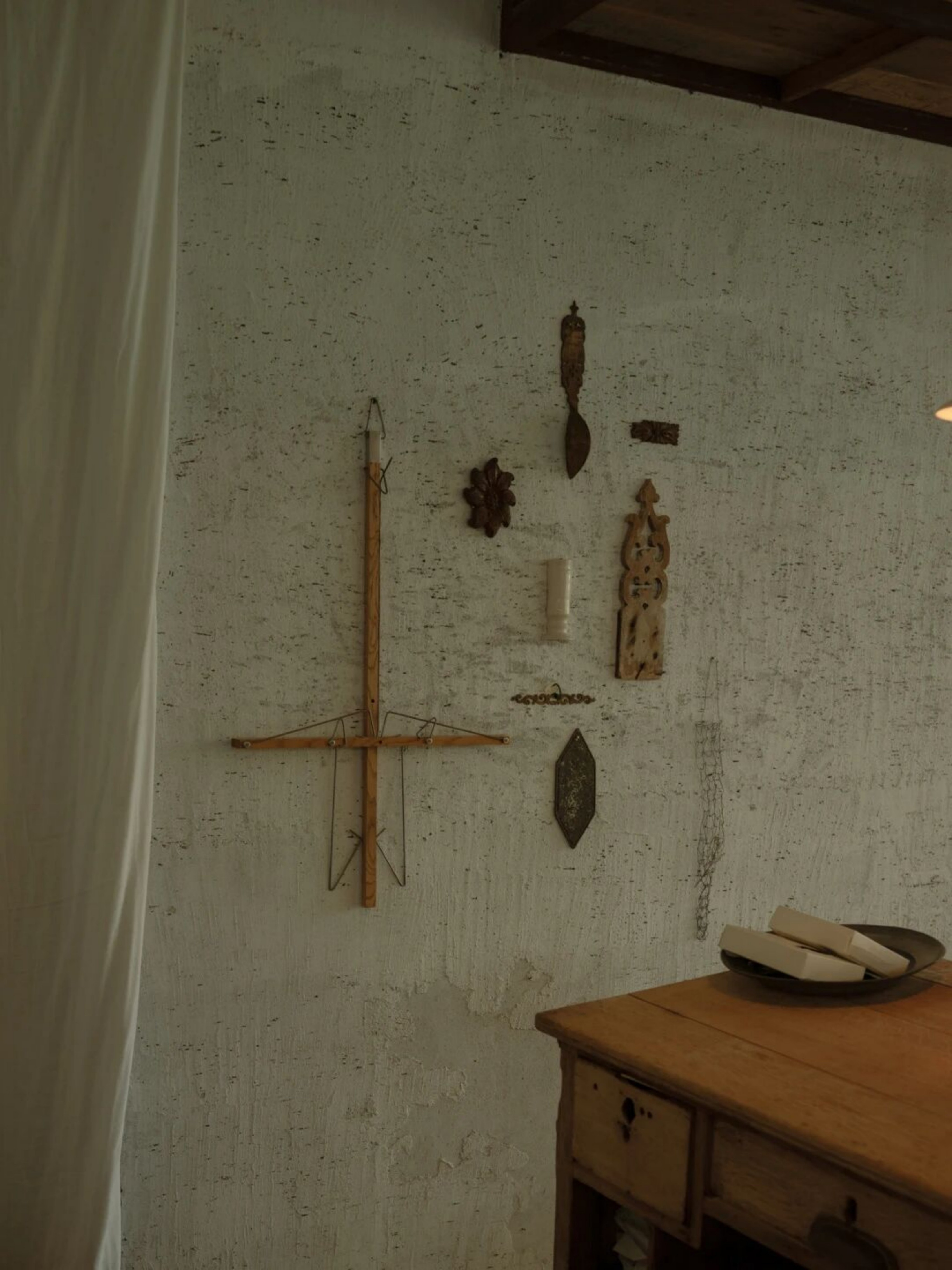 设计选材:空间的每一个细节都蕴含着美学思考。从桌椅、器皿到窗帘、摆件,都是对“日常中的温柔”所作的回应。我们希望人们在不经意间被某个细节轻轻打动。大量原木材质被使用于家具和装置中,每一块木板都经过精挑细选,保留了天然的肌理。墙面采用自然肌理的处理方式,与布帘交叠出柔软安静的气息。手作的产品是时间的产物,时光积累形成温度,我们希望人能感受到,不需要用言语表达的品质。