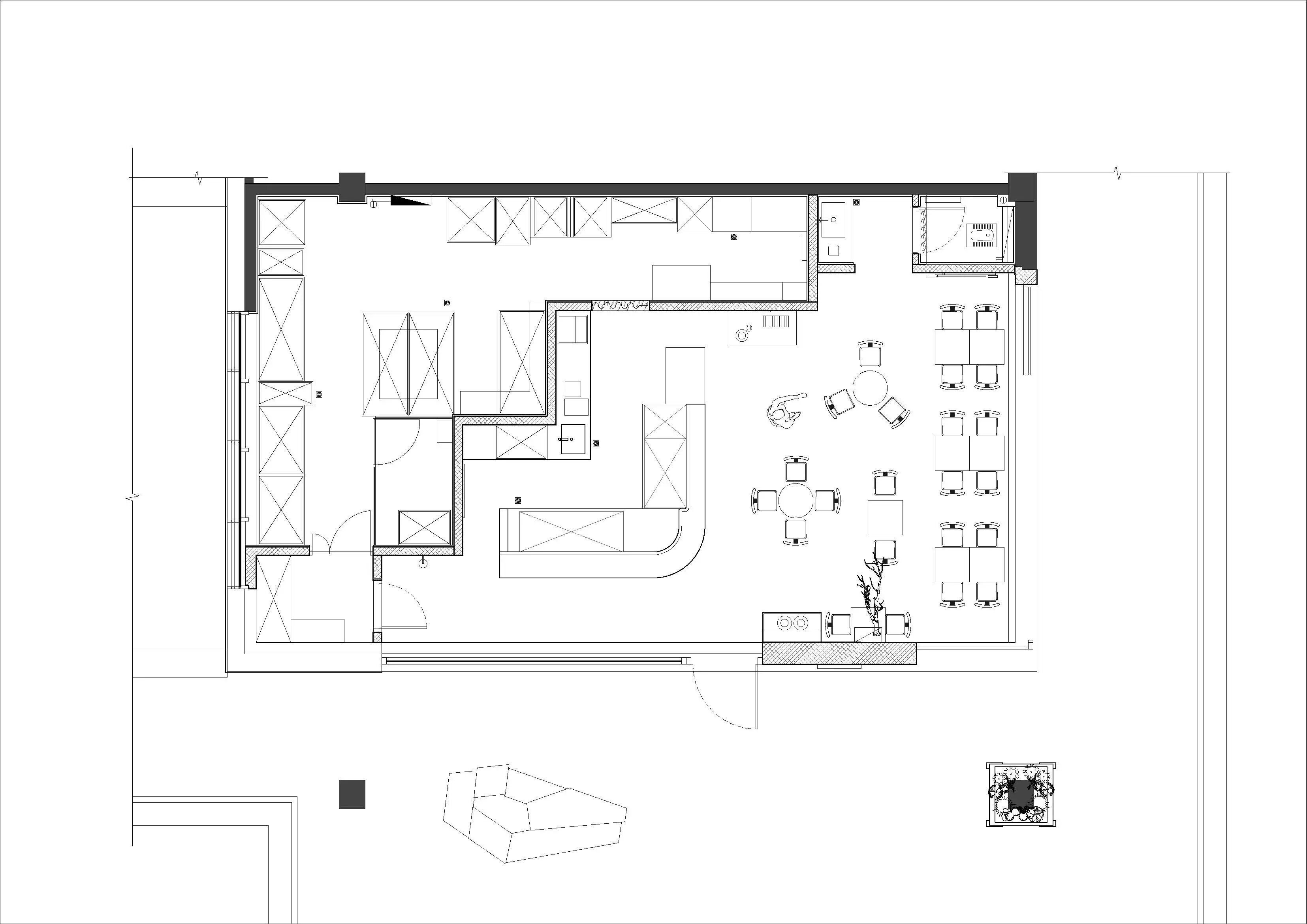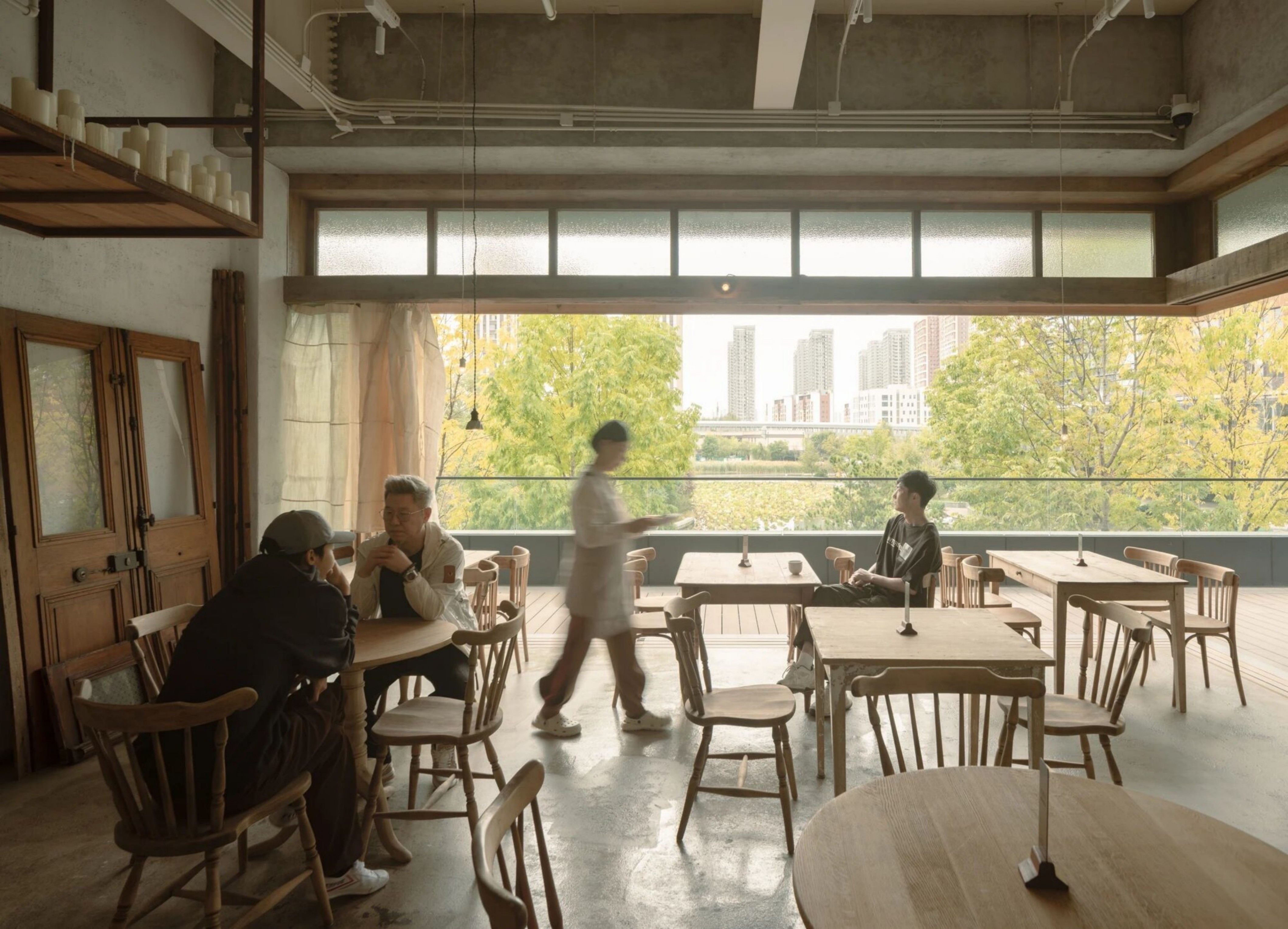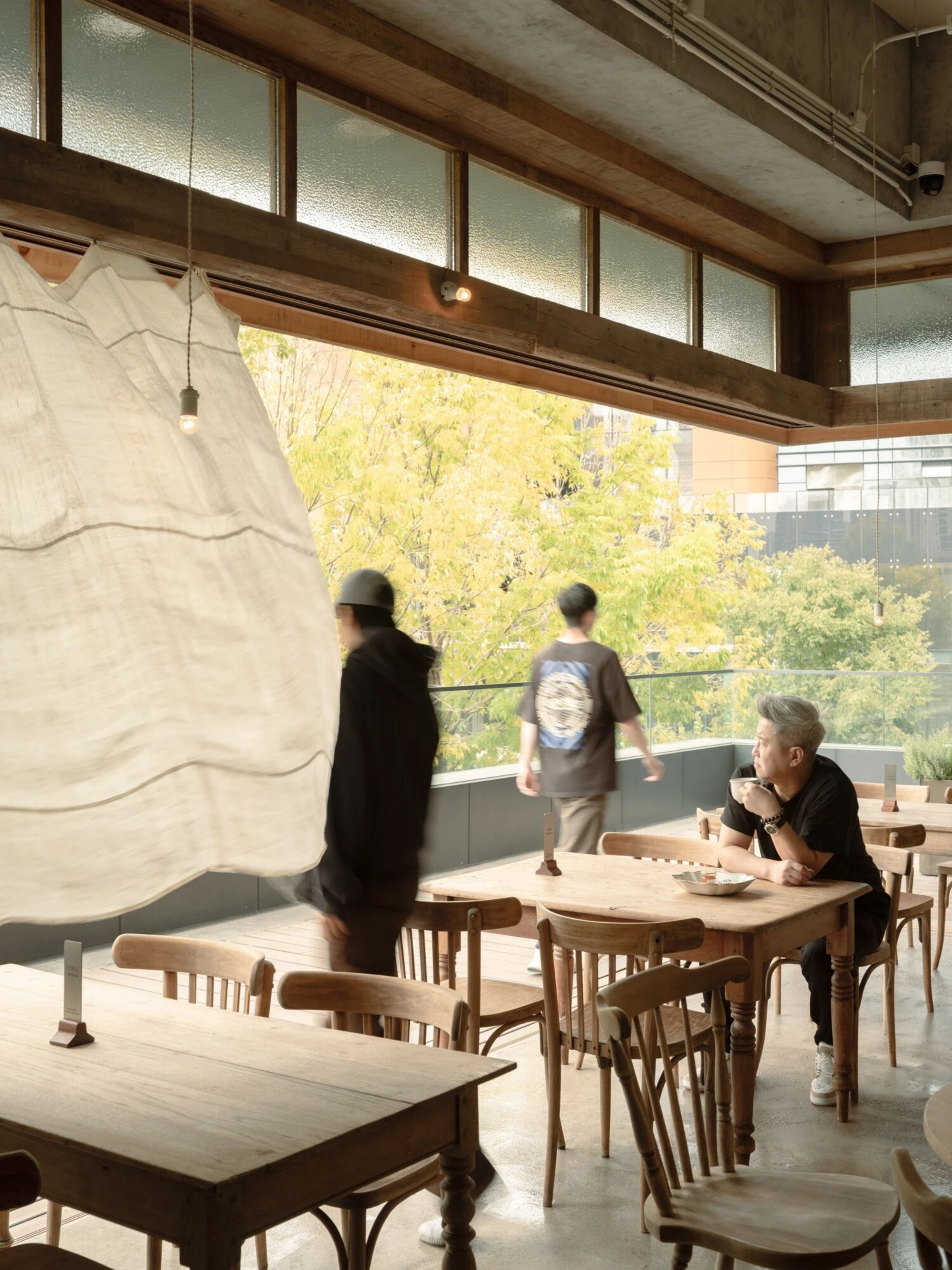 空间布局:空间位于一个低密度商业二层,朝向大片绿意。我们顺应原始结构,将窗景完全打开。阳光穿过绿荫进入屋内,满是自然的色彩。