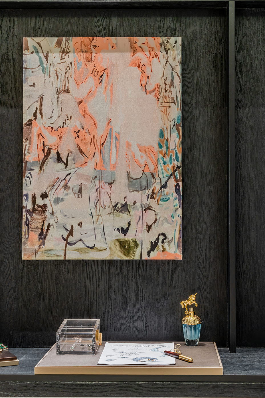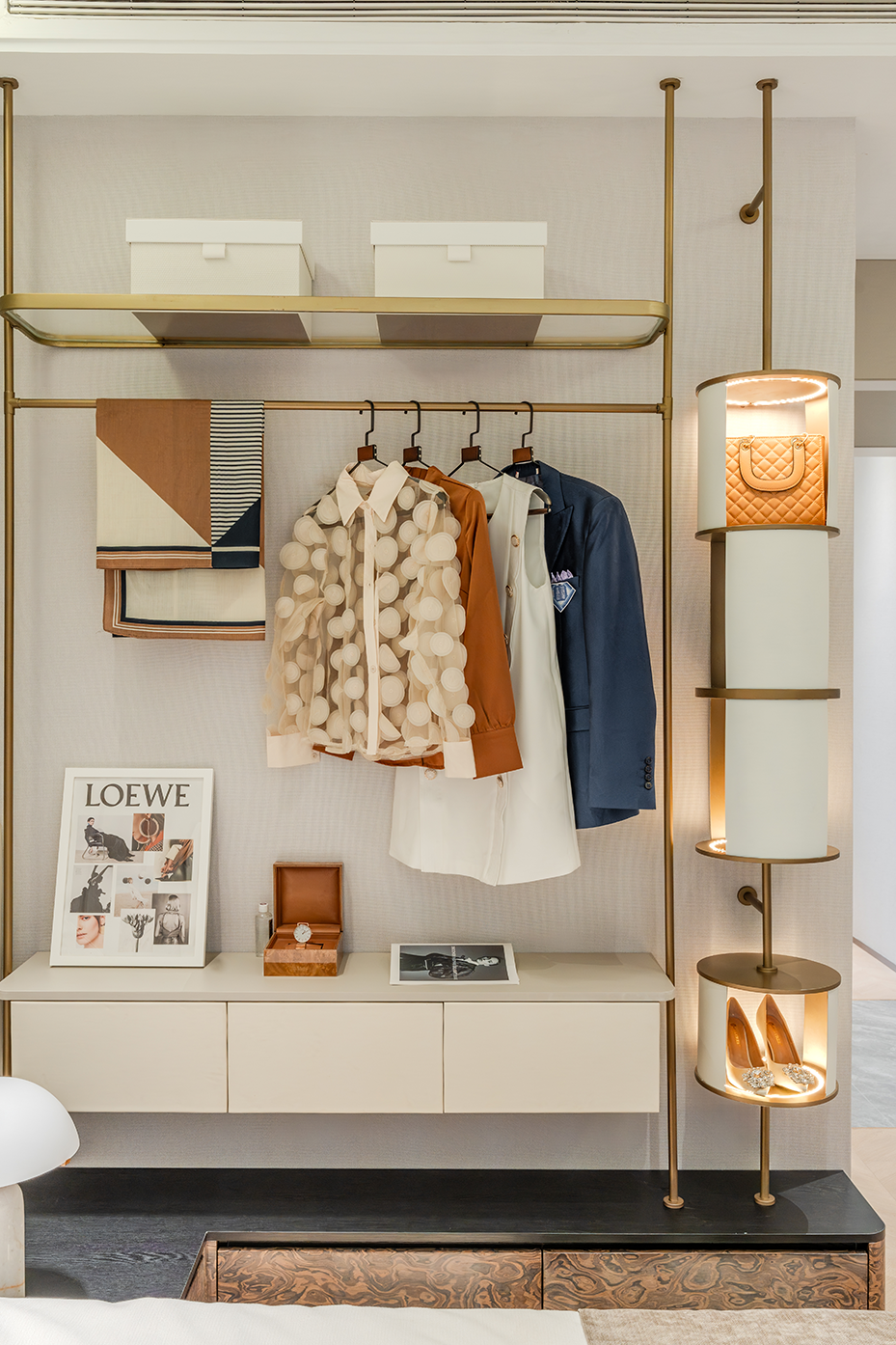 空间布局:温暖色调的墙面和家具搭配柔和的灯光,形成休闲展示空间布局。造型独特的灯具和展示架陈列的包包等商品错落有致,整体布局注重细节与氛围的营造。