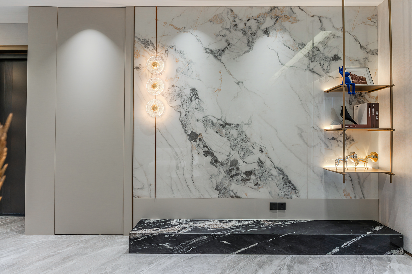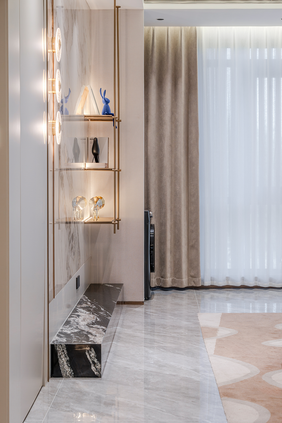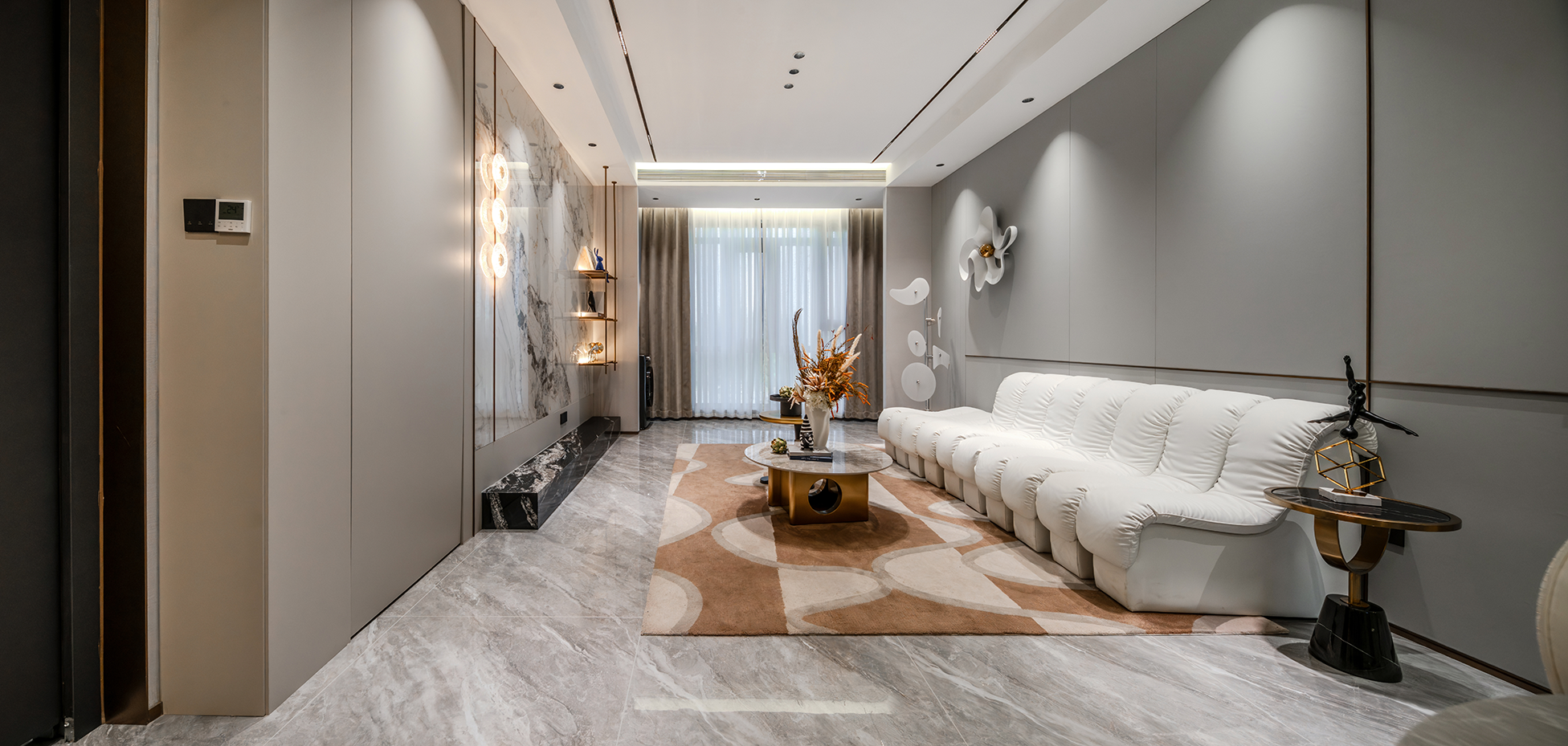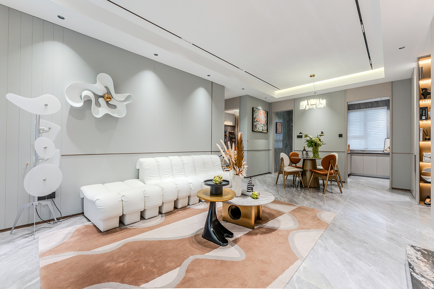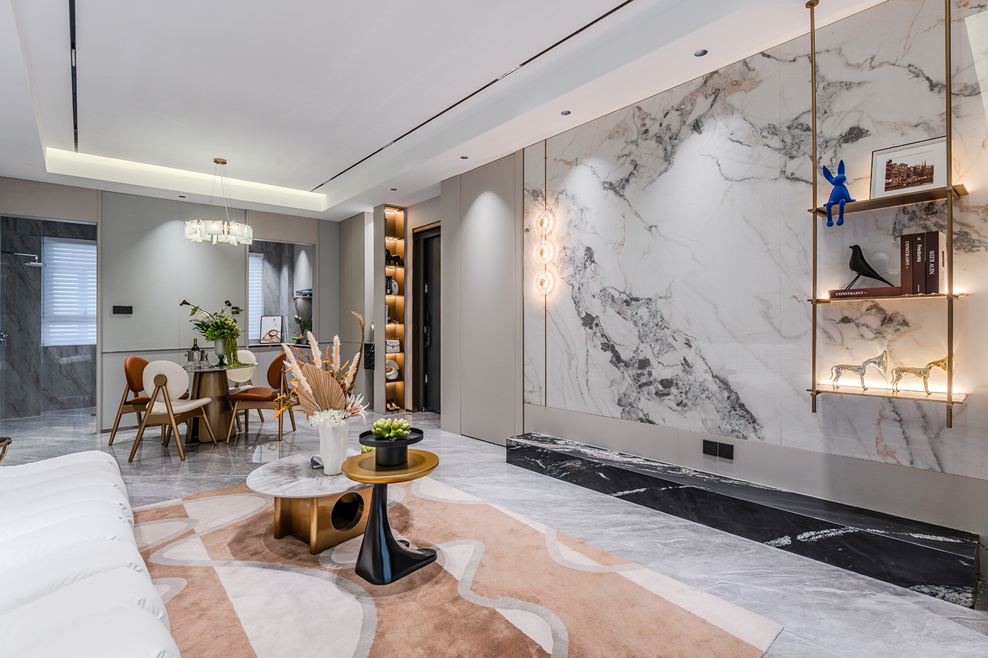 空间意境:浅灰色调为主的空间中,白色模块化沙发搭配几何图案地毯,营造出现代而舒适的氛围。独特的嵌入式照明和艺术装置提升了空间的格调,整体布局合理且充满设计感;大理石纹理墙面搭配金属壁灯,营造出奢华精致的空间氛围;开放式货架陈列的书籍和装饰品增添了艺术感,整体空间简约却极具质感。
