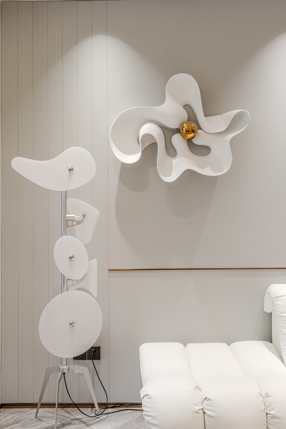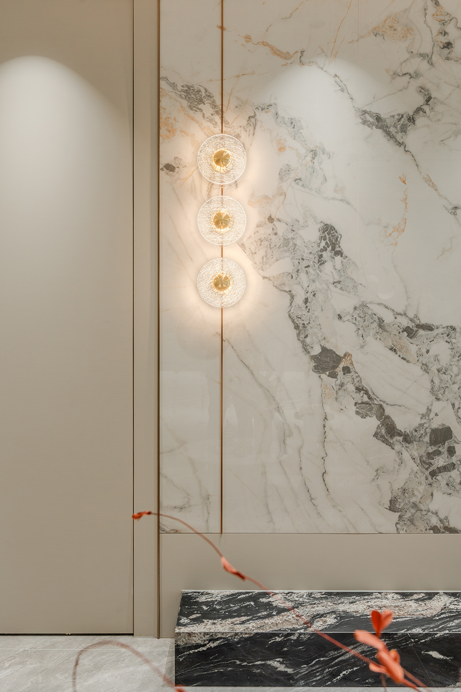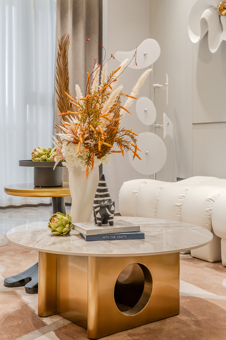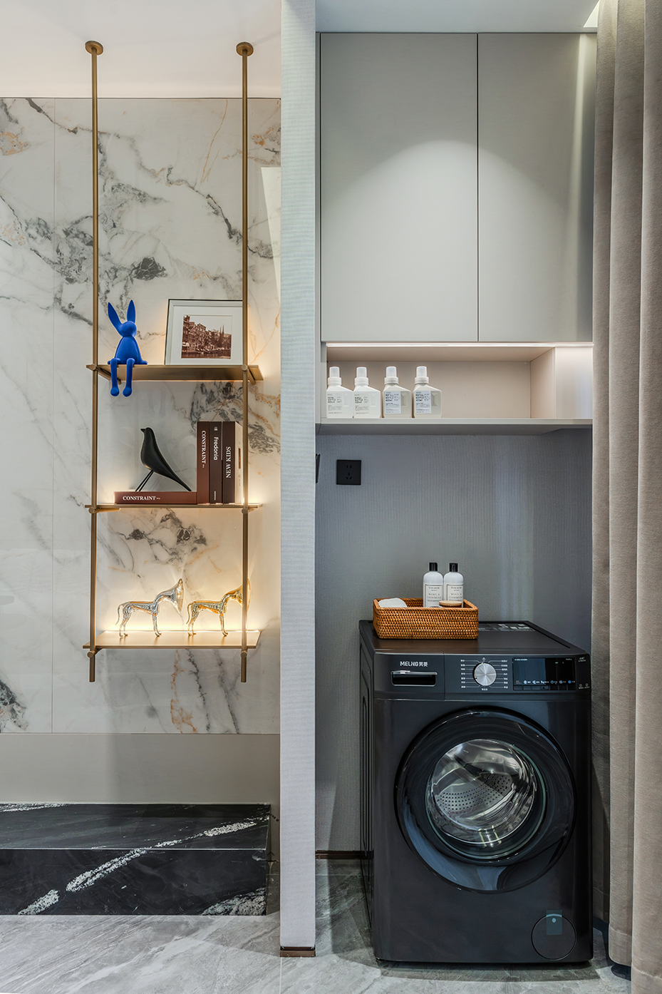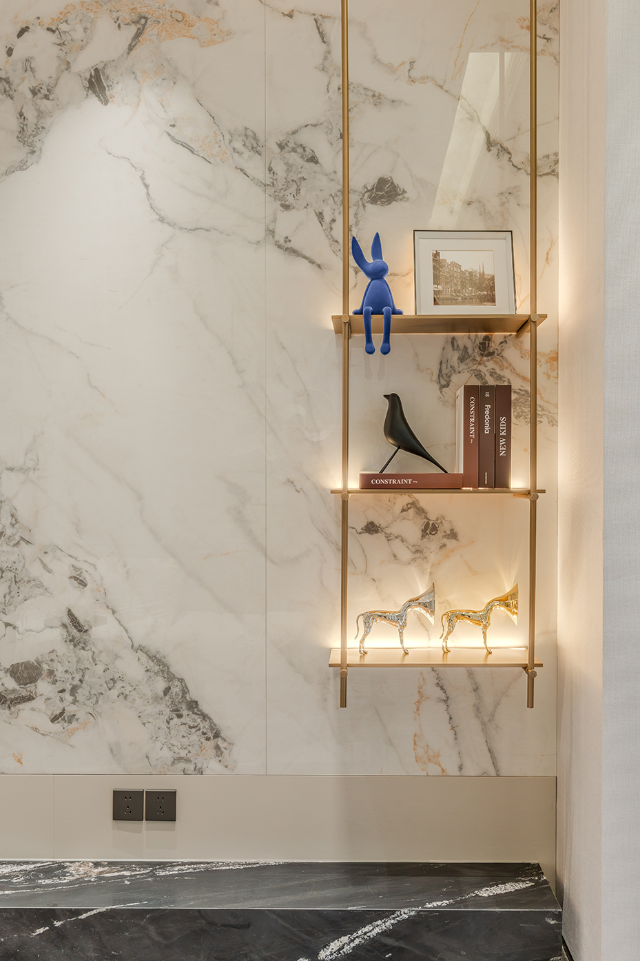 空间意境:浅灰色调为主的空间中,白色模块化沙发搭配几何图案地毯,营造出现代而舒适的氛围。独特的嵌入式照明和艺术装置提升了空间的格调,整体布局合理且充满设计感;大理石纹理墙面搭配金属壁灯,营造出奢华精致的空间氛围;开放式货架陈列的书籍和装饰品增添了艺术感,整体空间简约却极具质感。