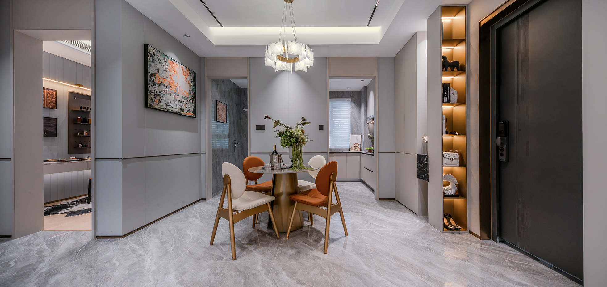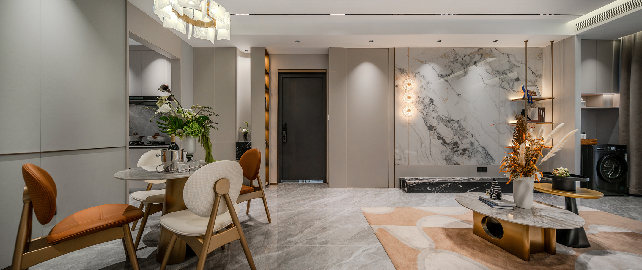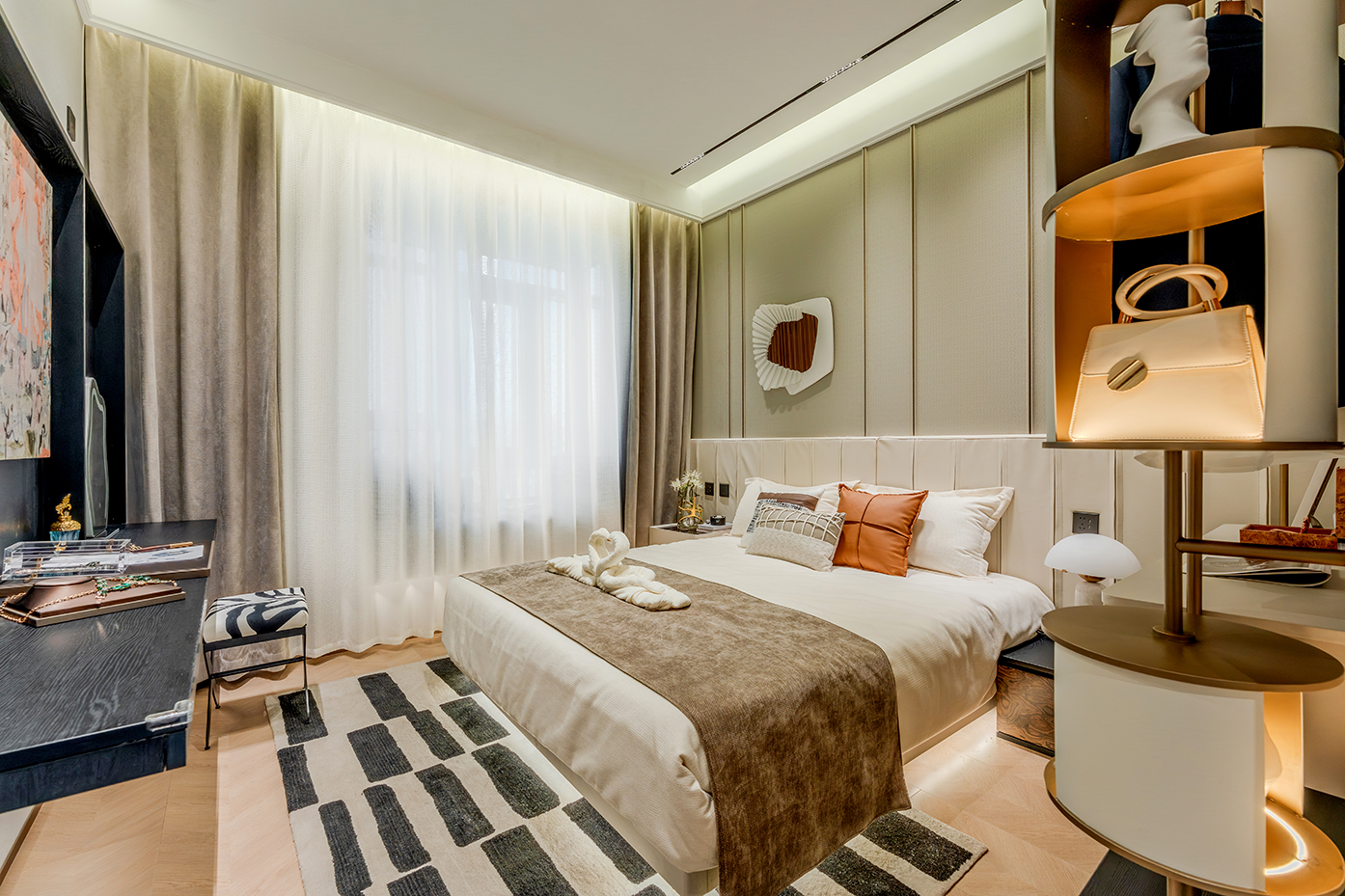 项目定位:以现代轻奢风为核心理念,通过浅灰、米白等中性色调搭配棕色、橙色等暖色点缀,打造兼具功能性与艺术感的空间。设计强调个性化与实用性,为用户呈现一个既时尚又舒适的居住或展示环境,满足现代都市人对高品质生活的追求。