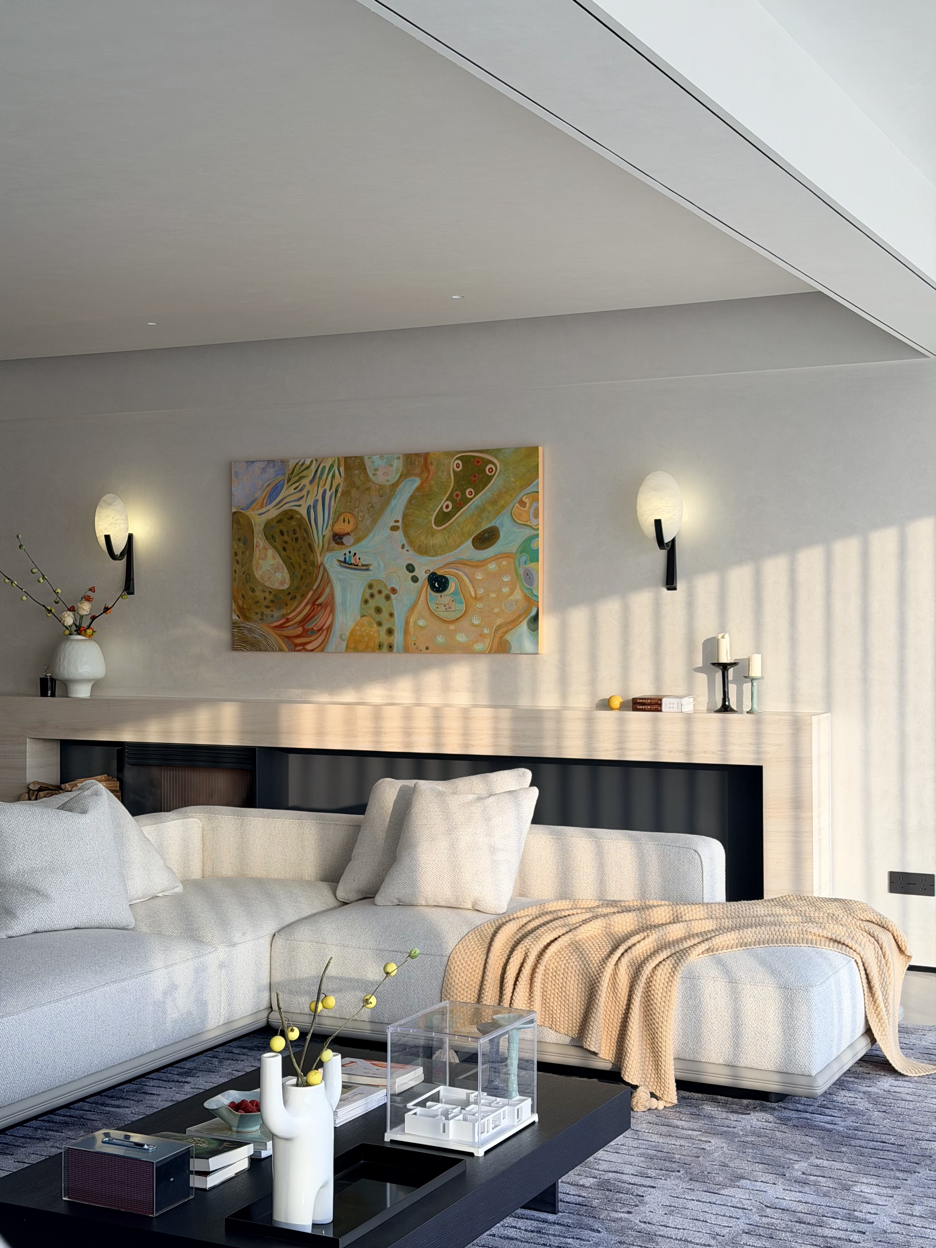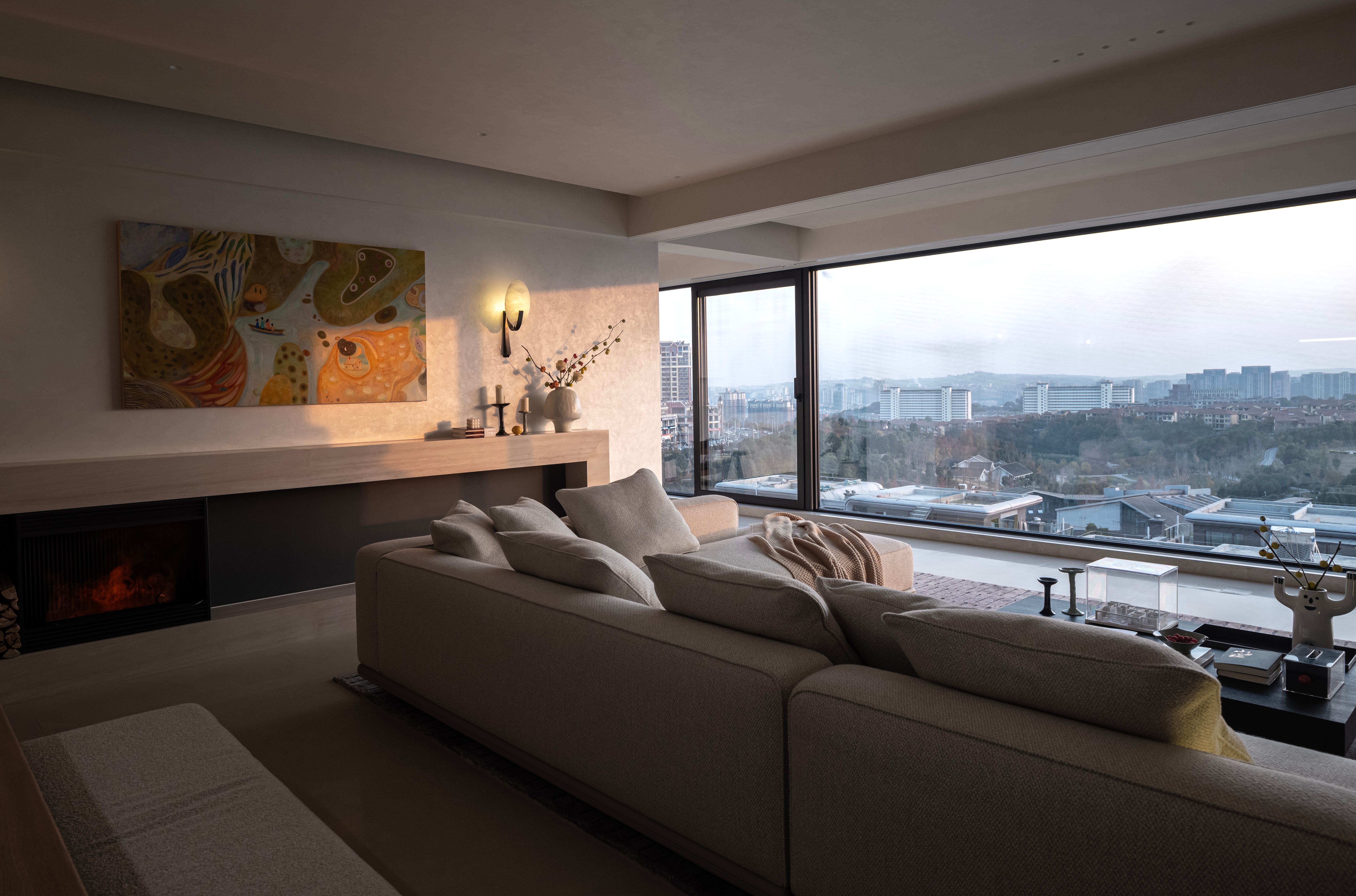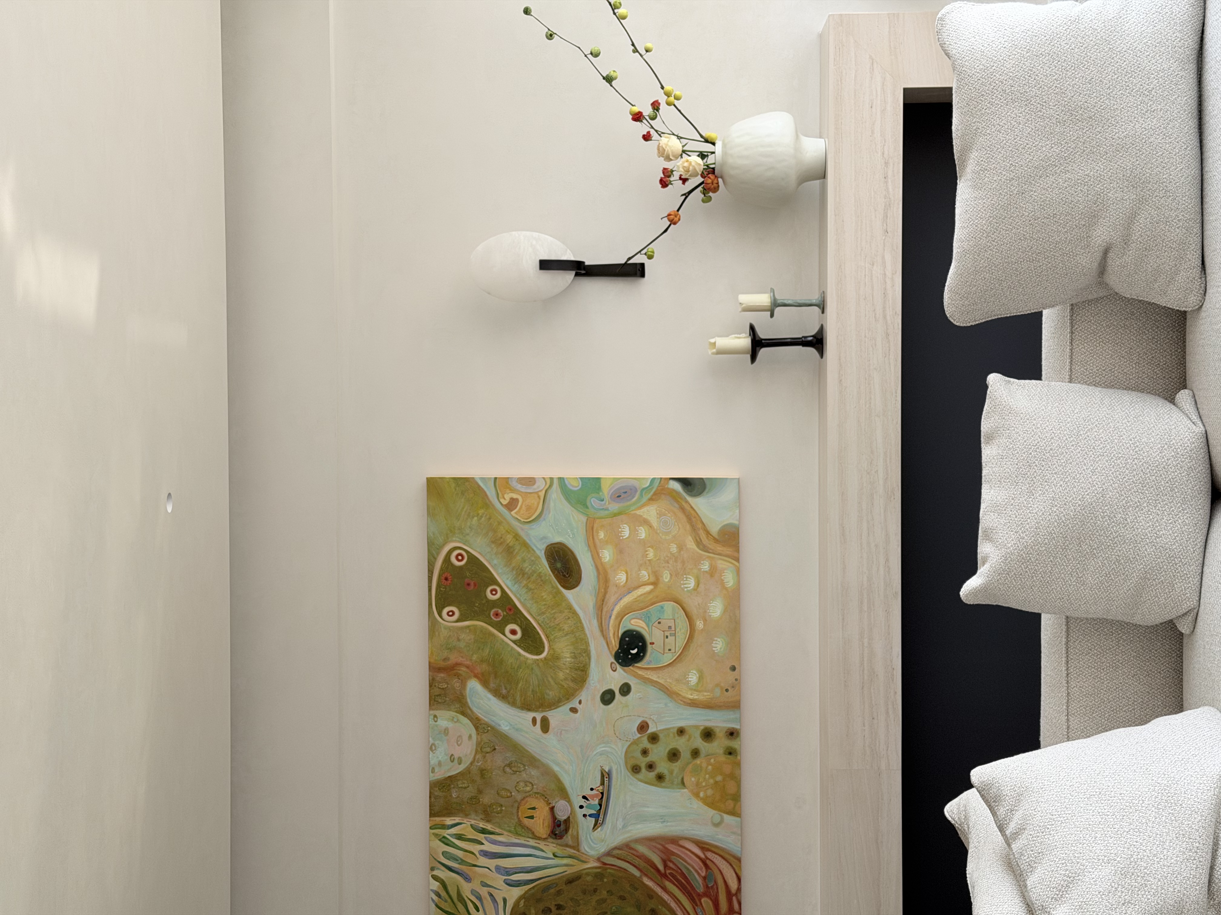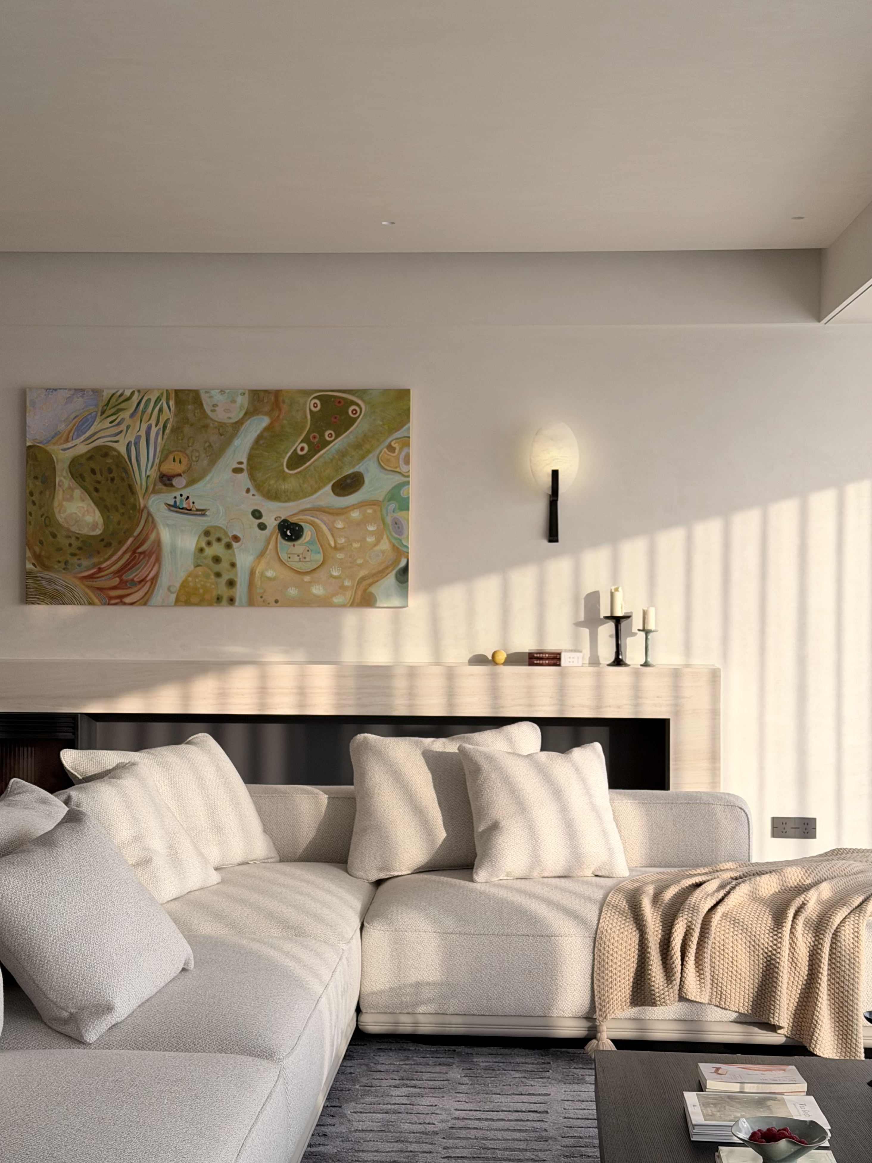 空间意境:本案不追求潮流的审美,亦没有明显的风格,根据前期对业主一家充分的了解剖析,打造出一种符合业主的调性空间。从第一眼看到女业主,在我心里,“温柔”就成了她代名词,男业主也是充分尊重家人,在整个设计前期到全案落地的过程,始终追求营造出要能体现她的气质。最特别的是,客厅中心位置的那副油画,是根据业主一家的愿望来进行创作的,灵感来源就是爸爸是掌舵者,妈妈是副手,在爸爸妈妈的保护下,两个小朋友一起去探险,寓意着这艘家的小船,一路远行,冲破各种艰难险阻,到达胜利的理想的乌托邦。这是什么也代替不了的,完工后,也确实做到了,独属于她们一家人的风格。