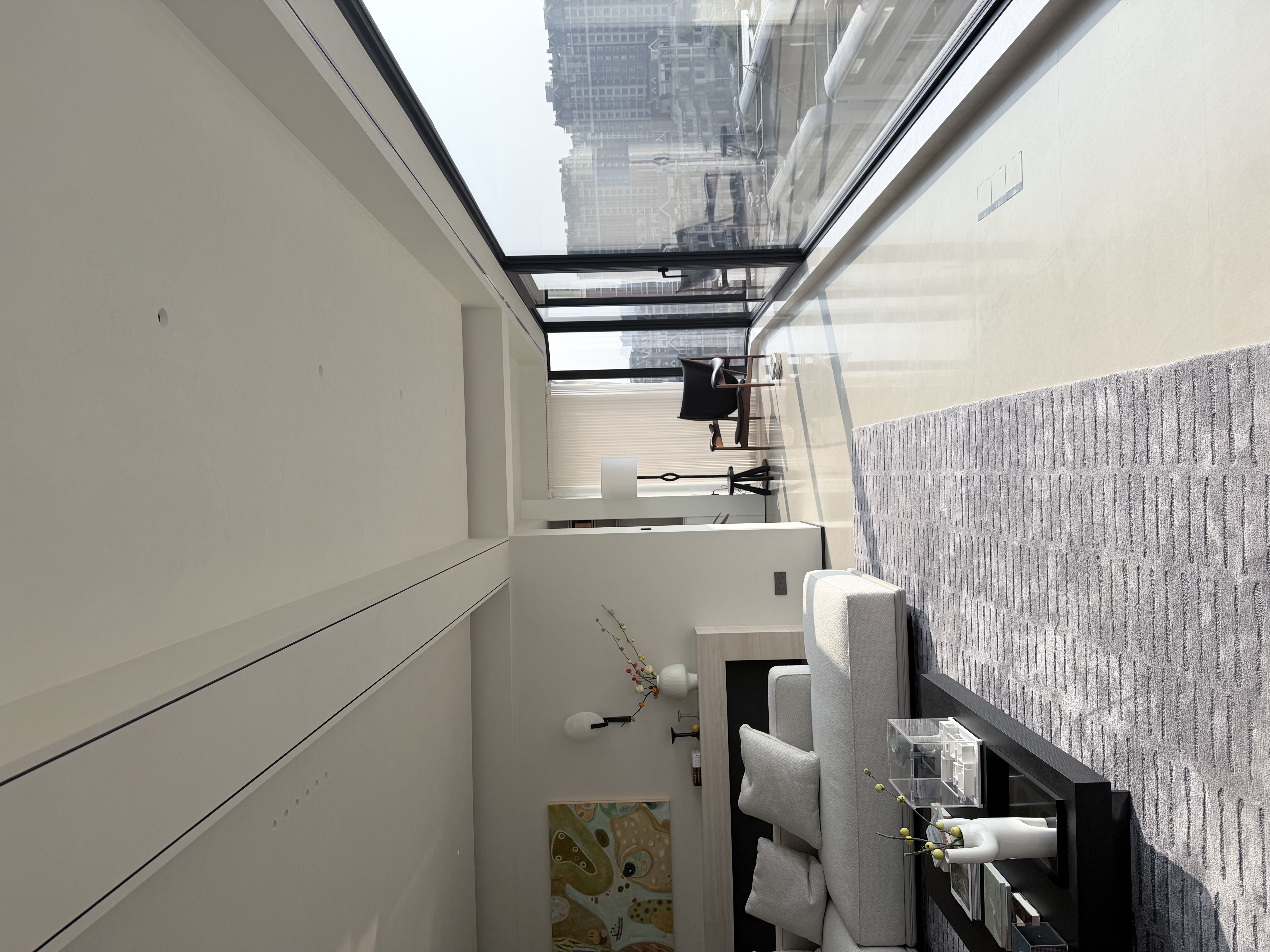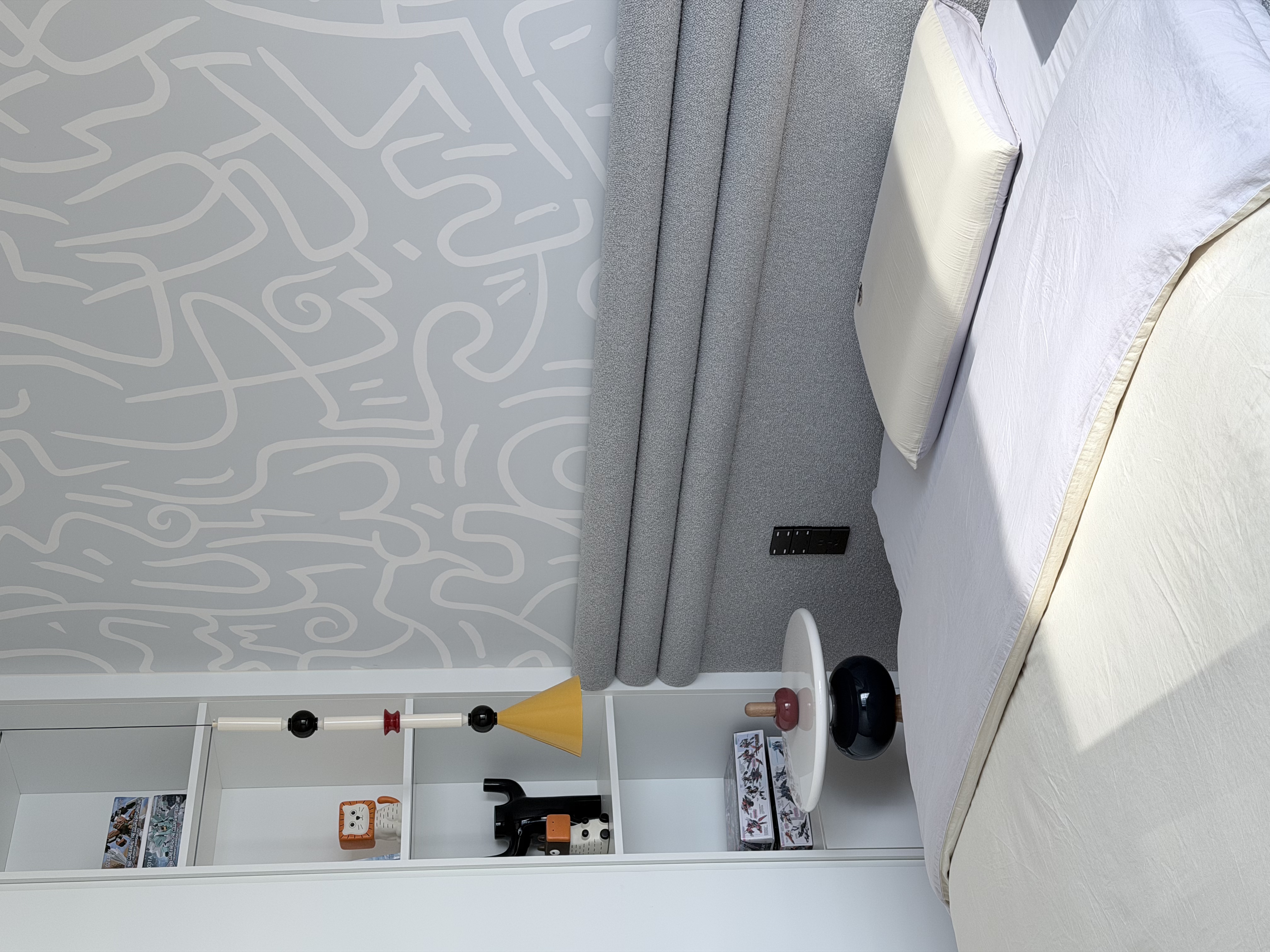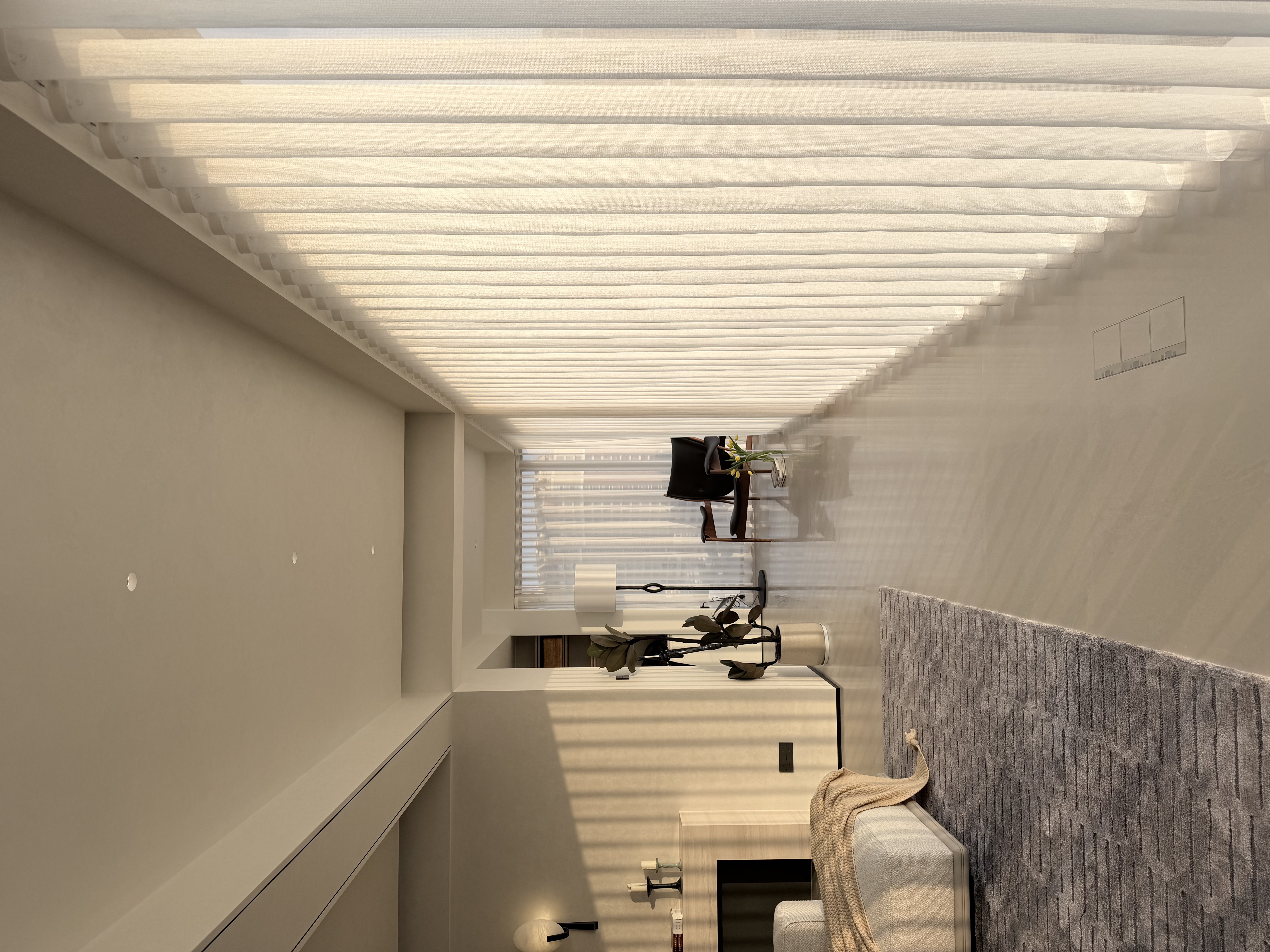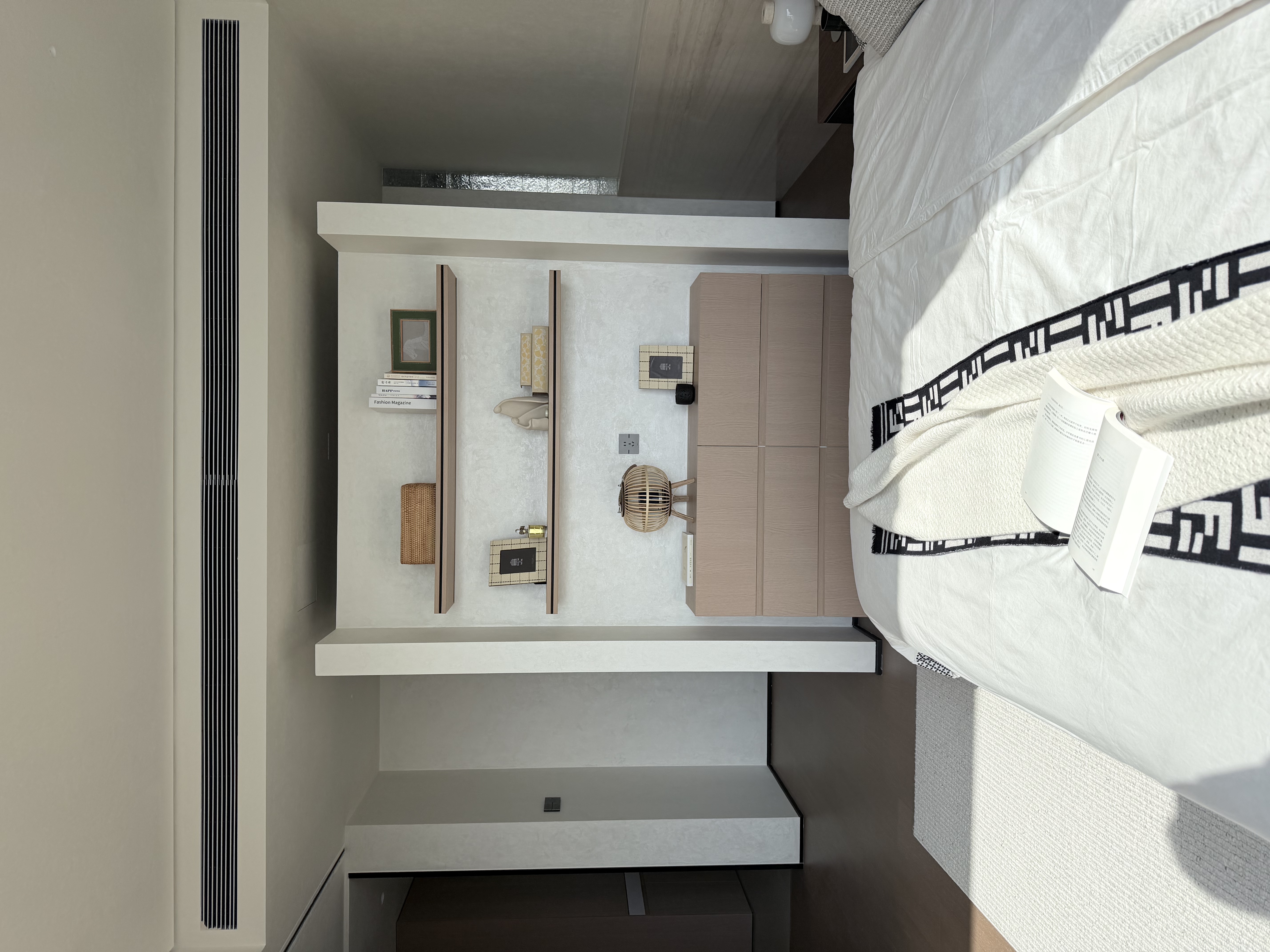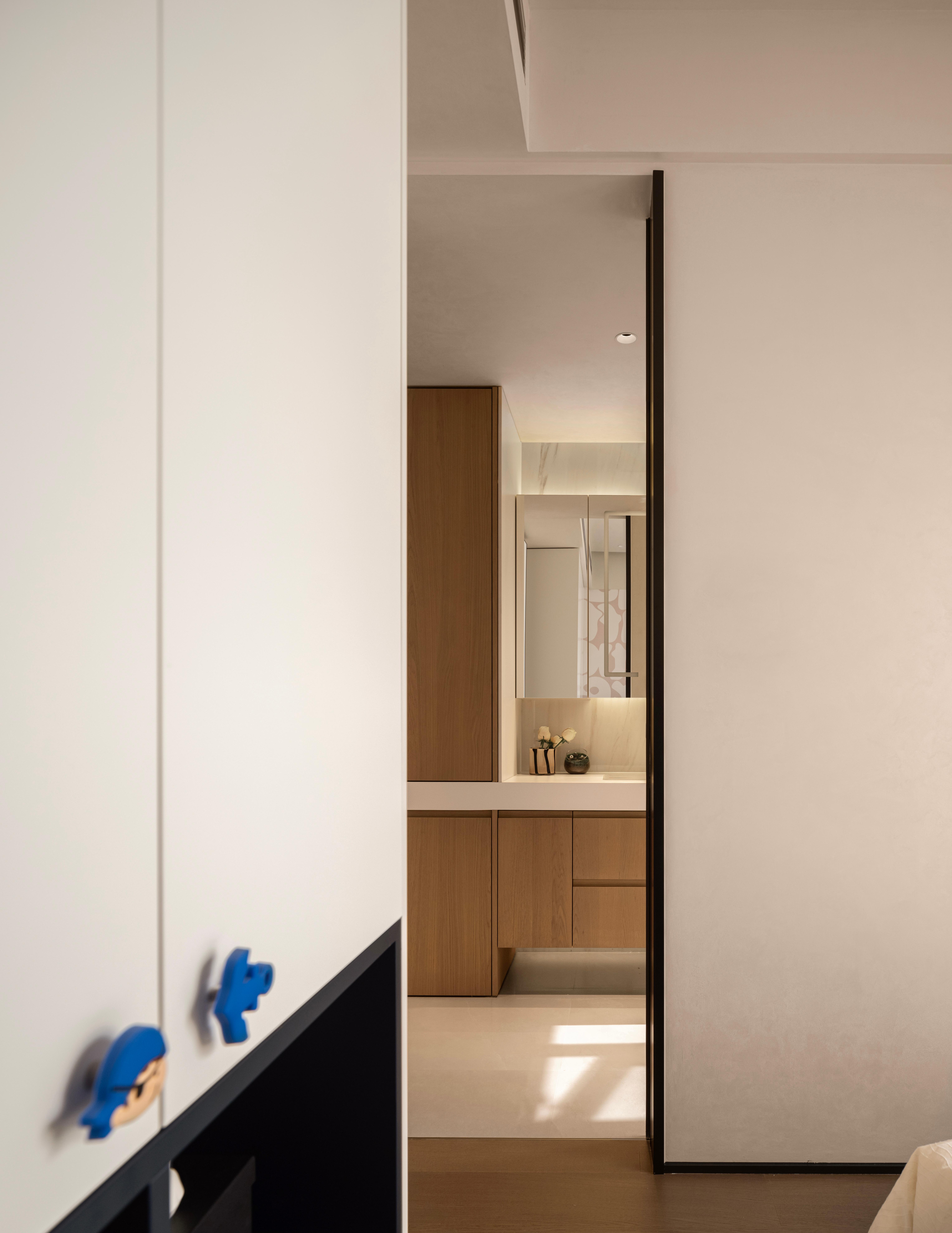 主卧空间,想做的比较有围合感,男女业主都是睡眠困难户,所以不仅对光有着超强控制,以及卫生间的三区分离,衣帽间的可开可合,功能动线方便的同时,还保留了空间的安全感。 -