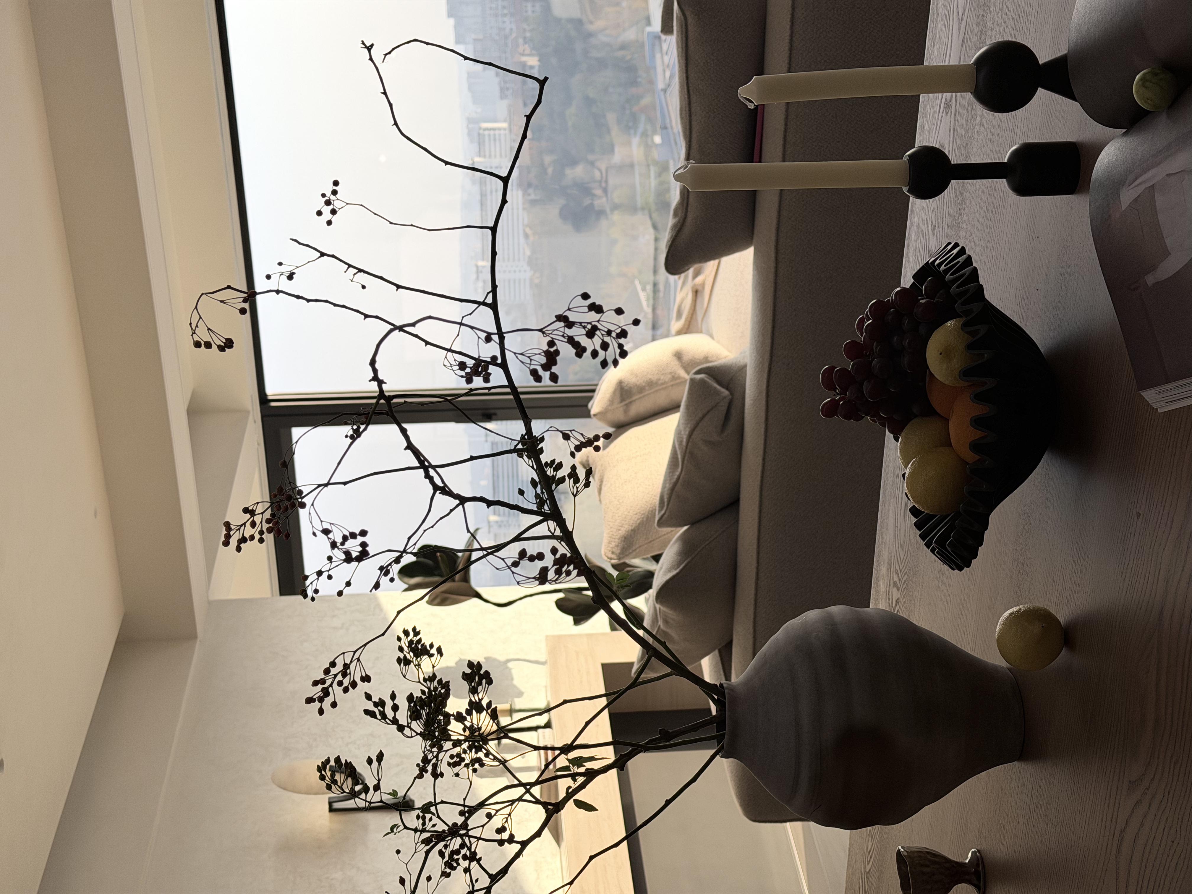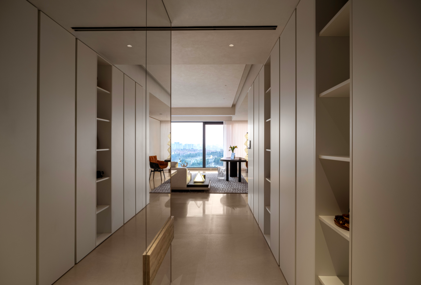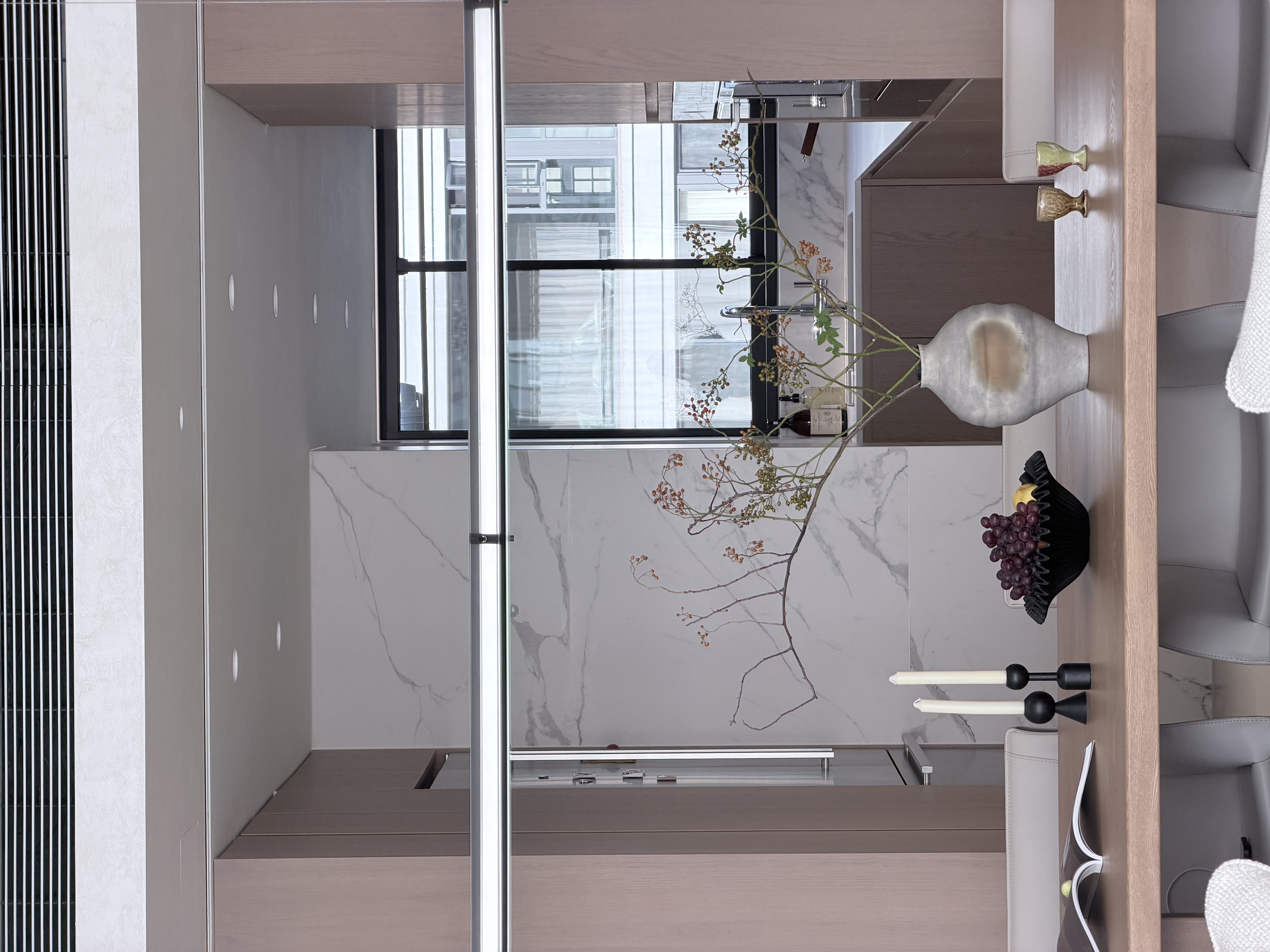 空间布局:公区我想打造无界限的亲子空间,客餐厅,厨房,还有女主人的功能间,都是可以流动开放的。摒弃传统的电视墙,沙发摆放形式,根据房子自身以及业主的情况,我们把空间大面积留白,把沙发的主要视线留给超大的落地玻璃窗,外面就是当地的公园,这样可以一年四季欣赏窗外的美景,把景色写成三餐四季的诗歌,在这个空间,妈妈可以在厨房做着美食的同时,孩子们可以玩玩具,读绘本,一家人可以没有任何阻挡的沟通交流。家人们在这个空间是紧密在一起的。