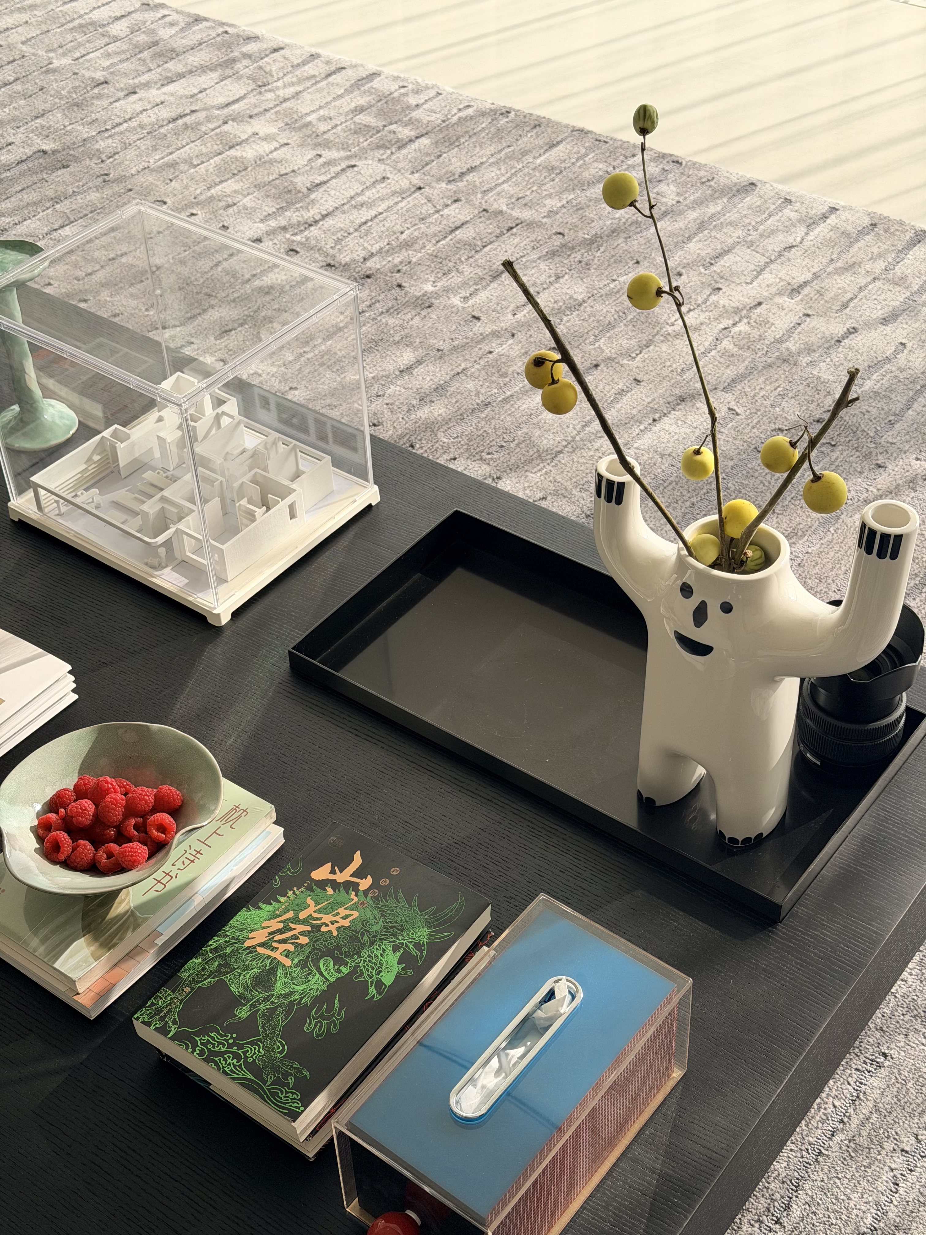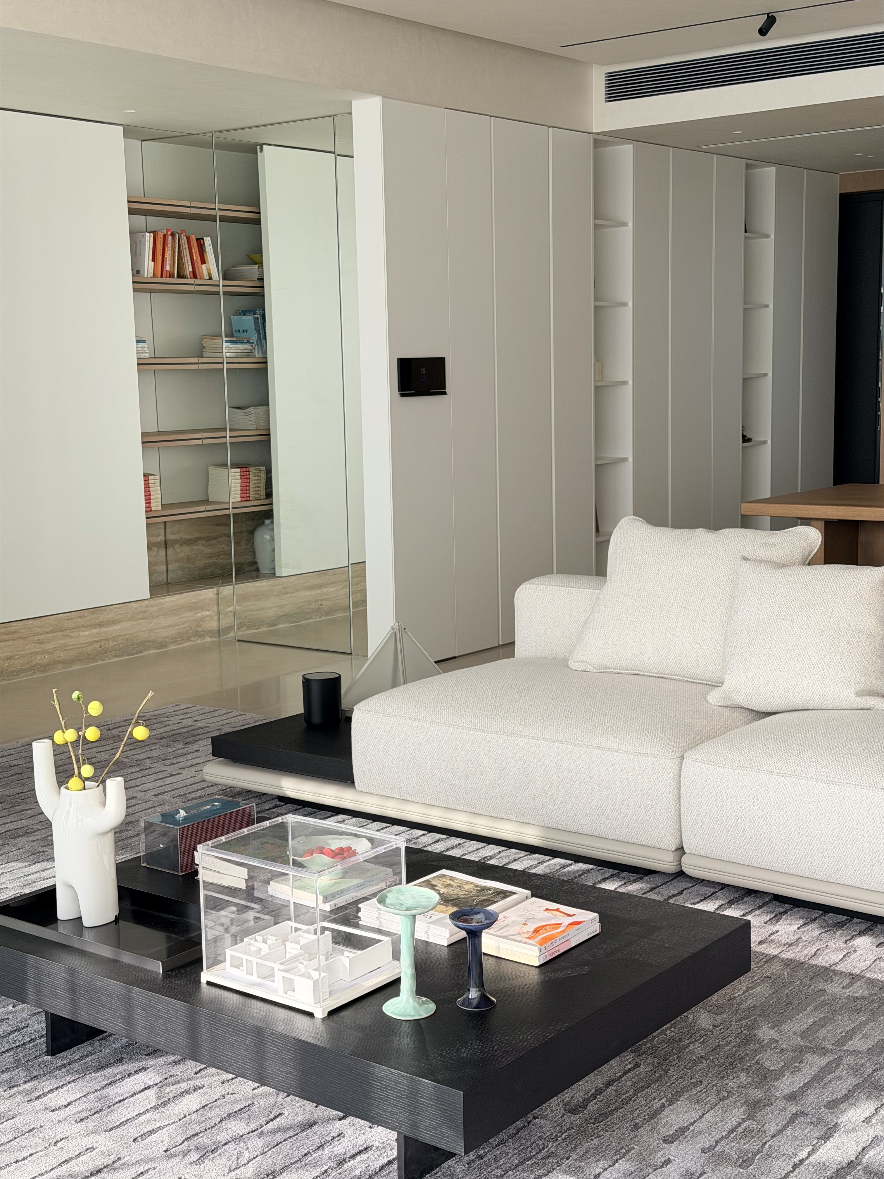 设计选材:本案选材提倡低调、自然,也和我们的核心点呼应。空间以黑白中性色为主色调,