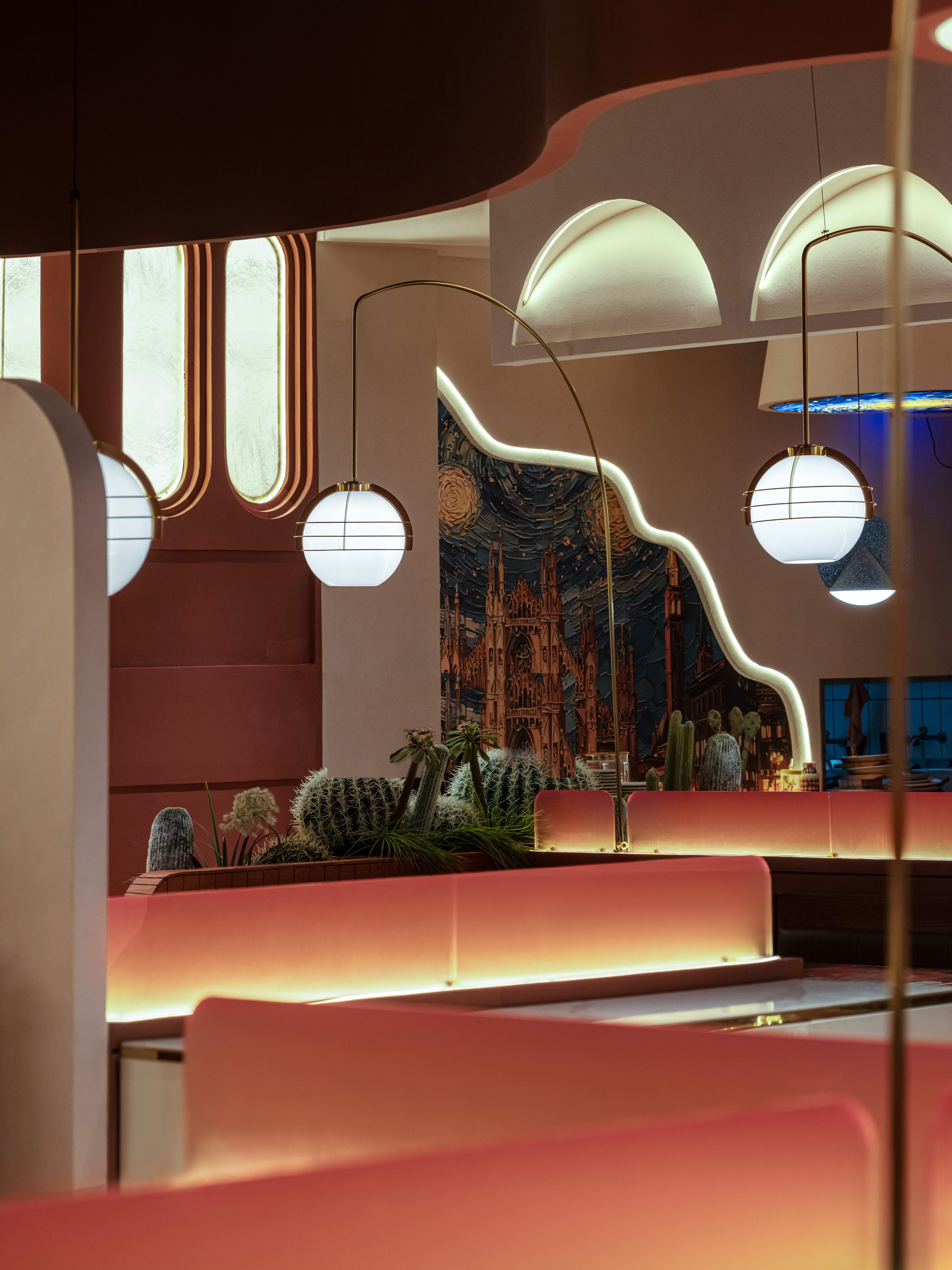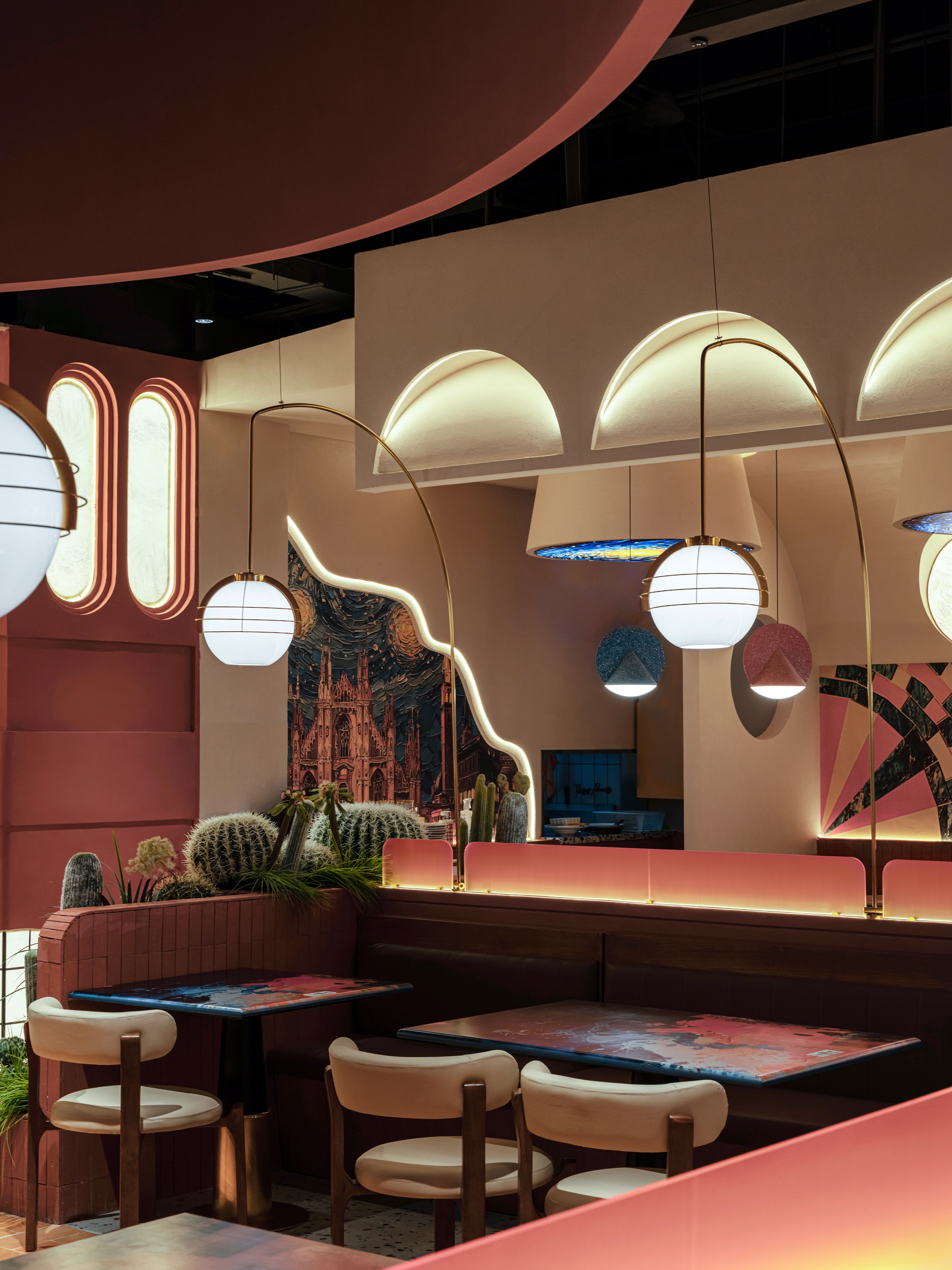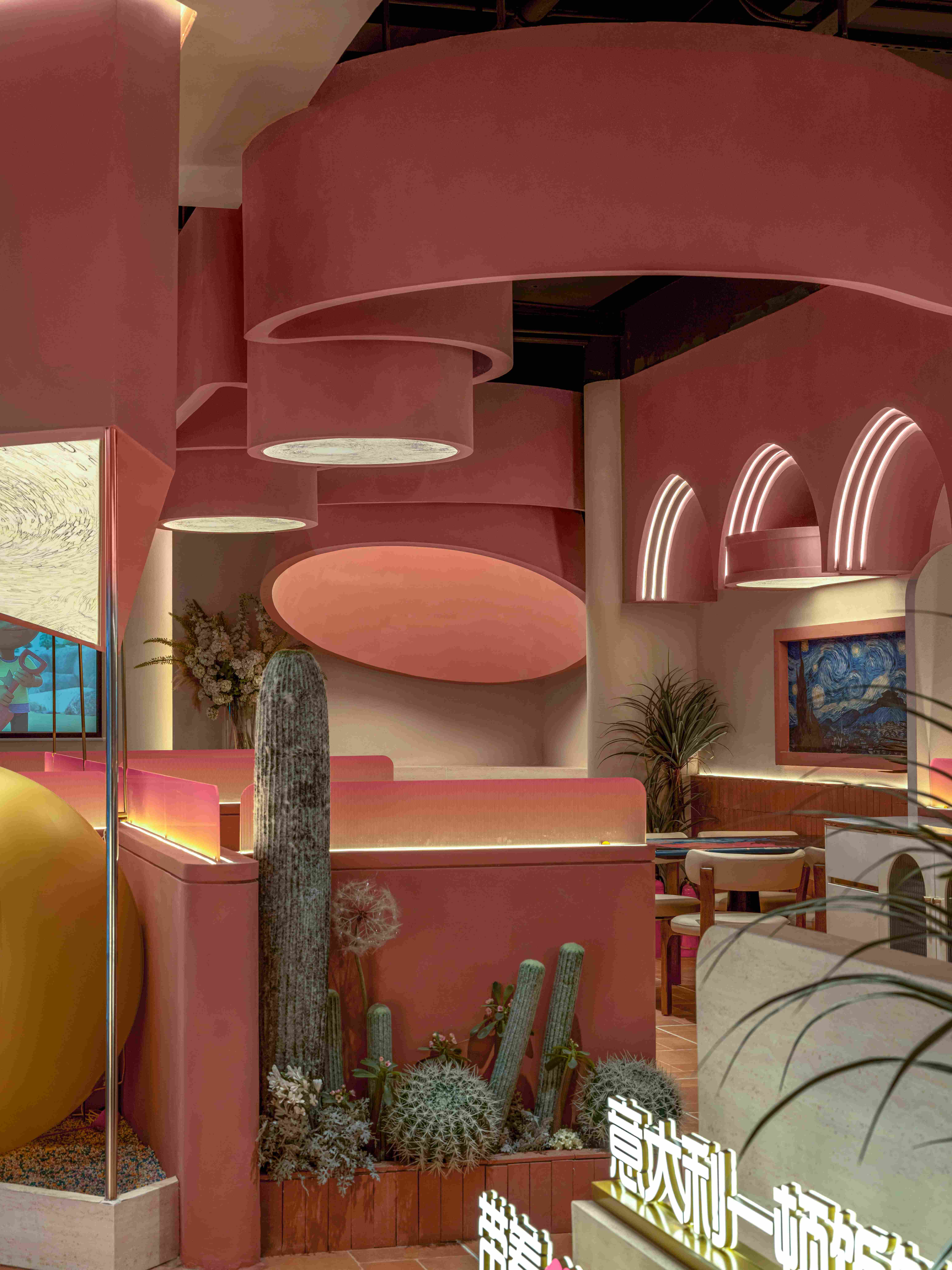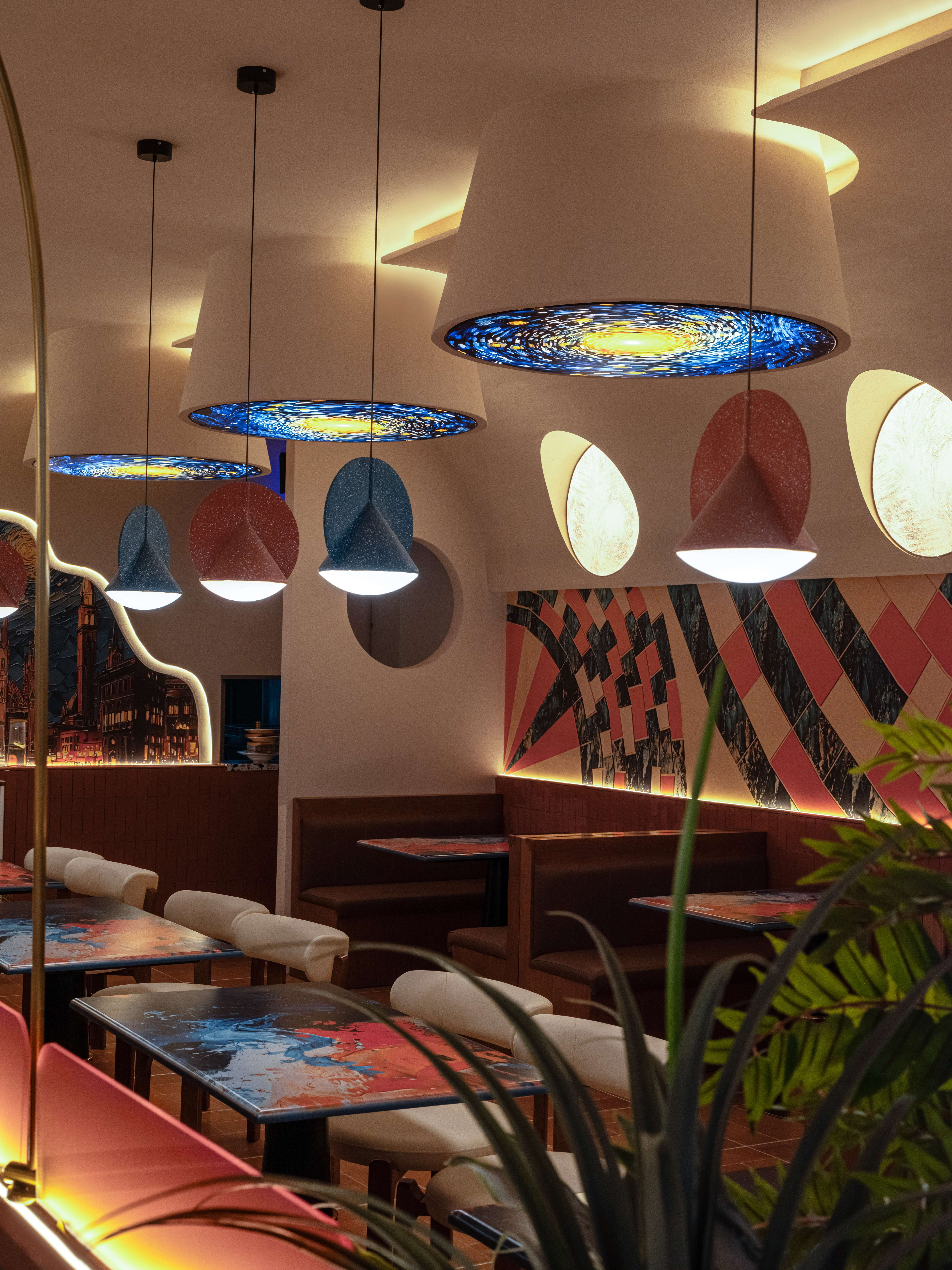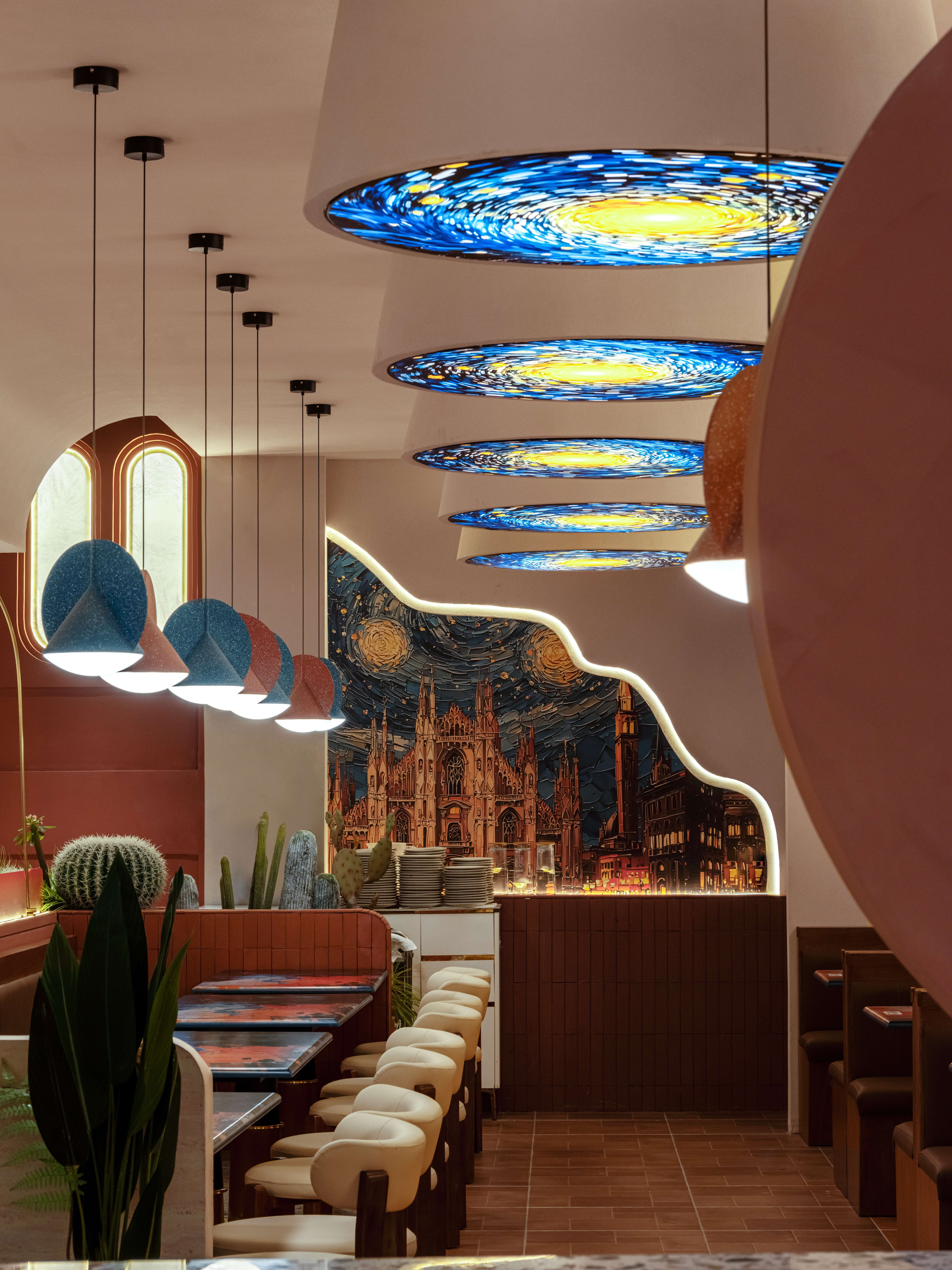 空间意境:借用《星空》中的流动感、色彩对比和情感表达,赋予餐厅一种梦幻、浪漫的艺术气息,仿佛置身于意大利小镇的夜空下。