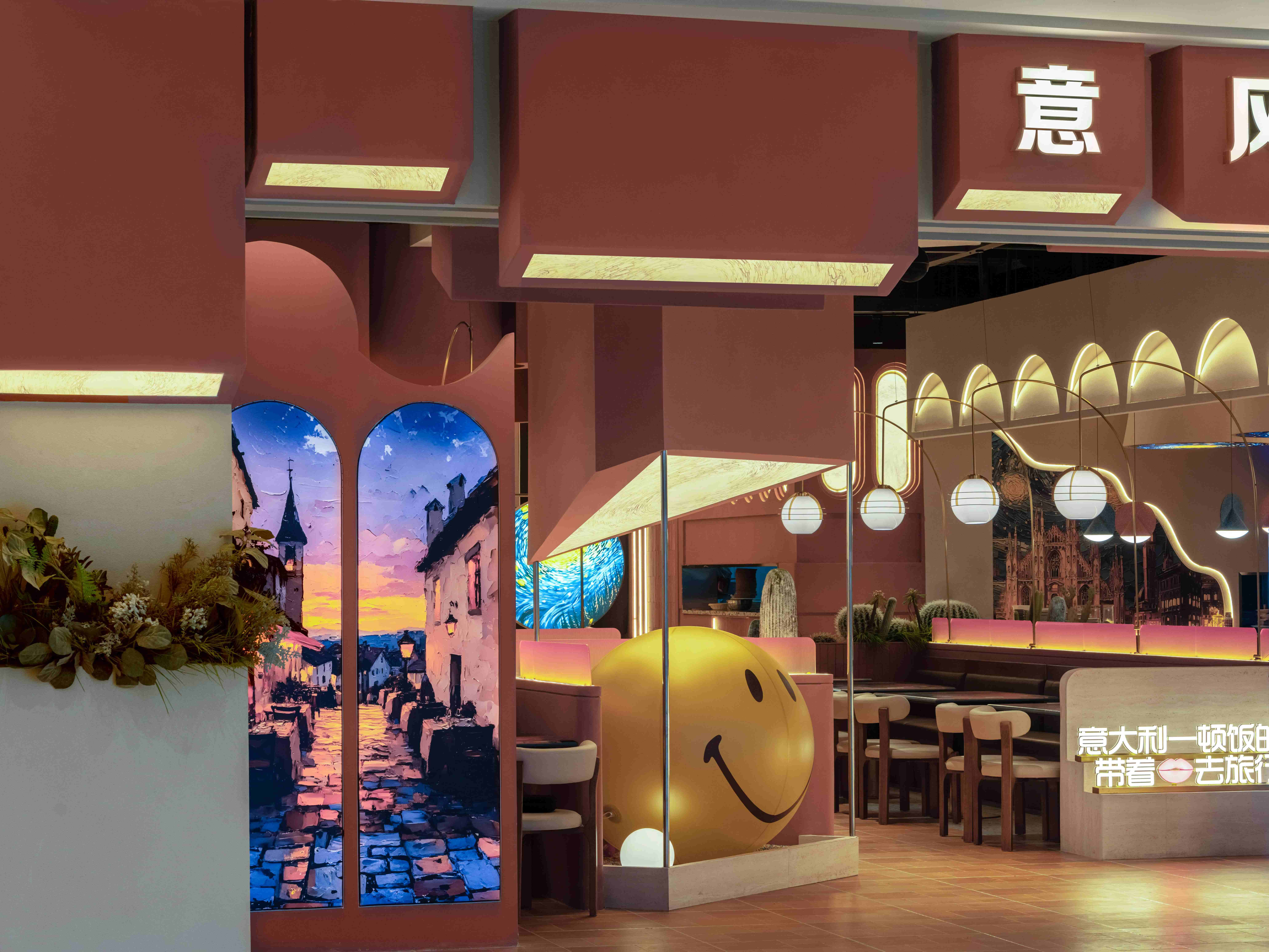 餐厅的整体设计以意大利小镇的悠闲、浪漫氛围为核心,通过油画作品展现小镇的街道、建筑、田园风光等元素,营造出浓厚的意大利文化氛围。