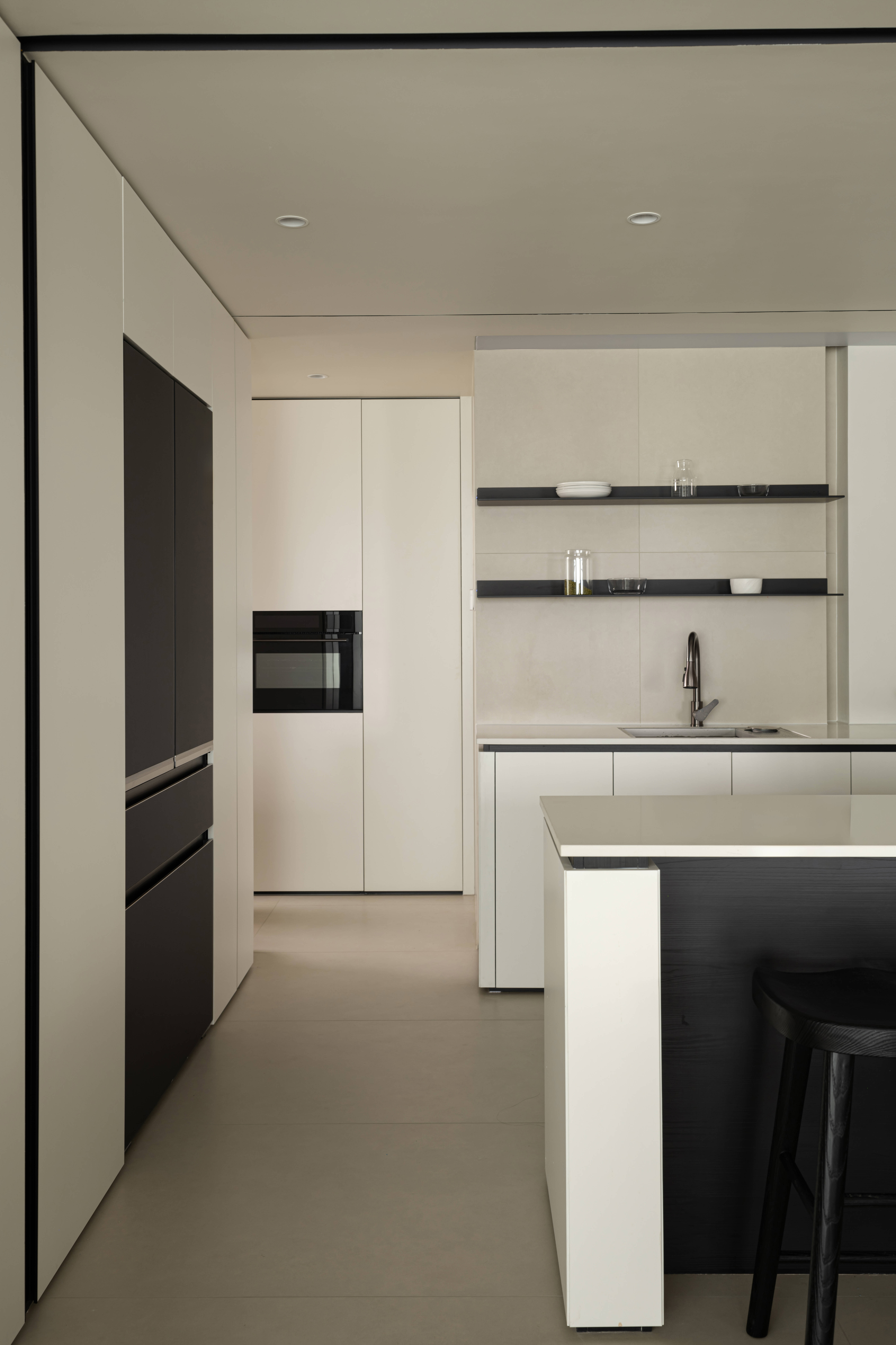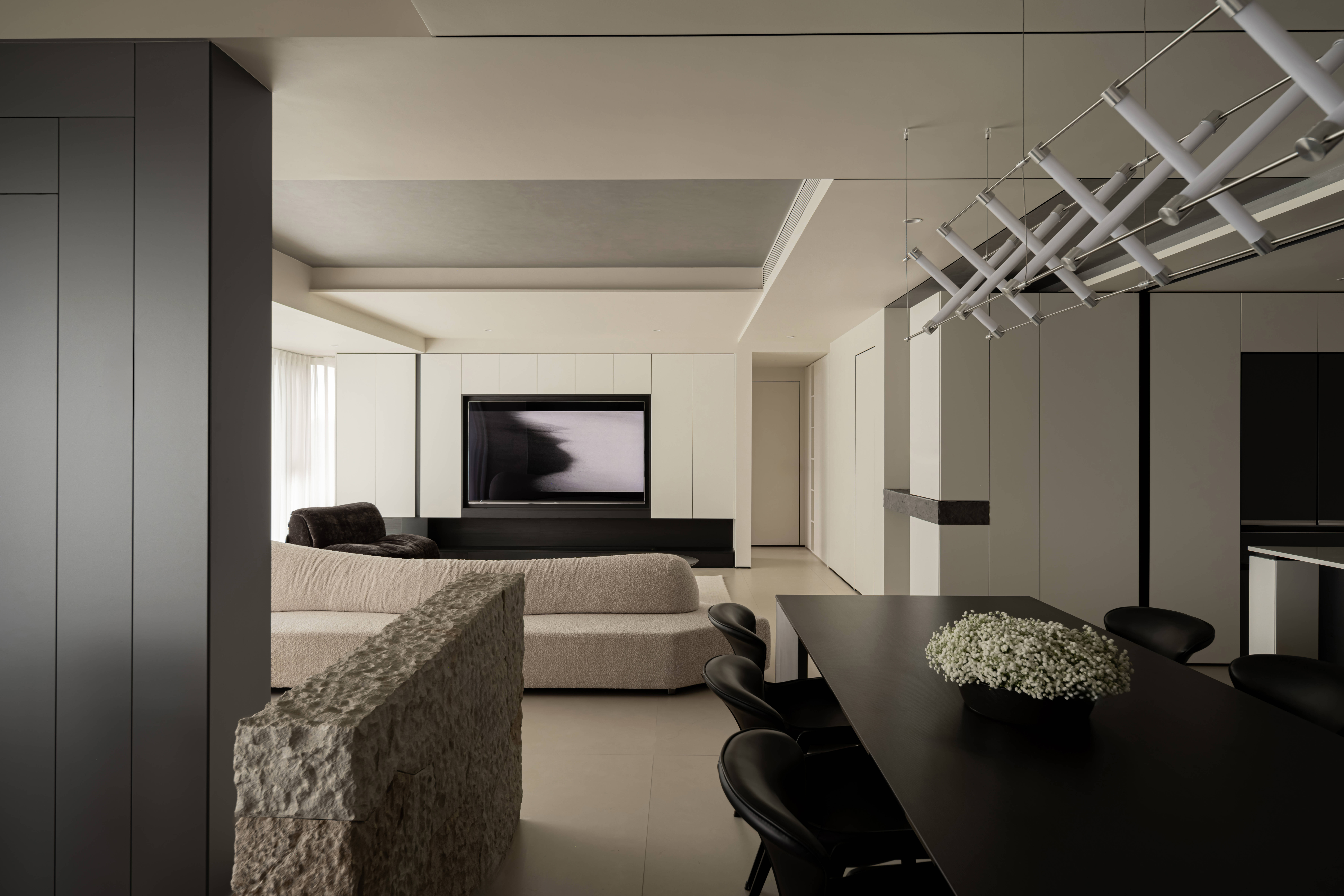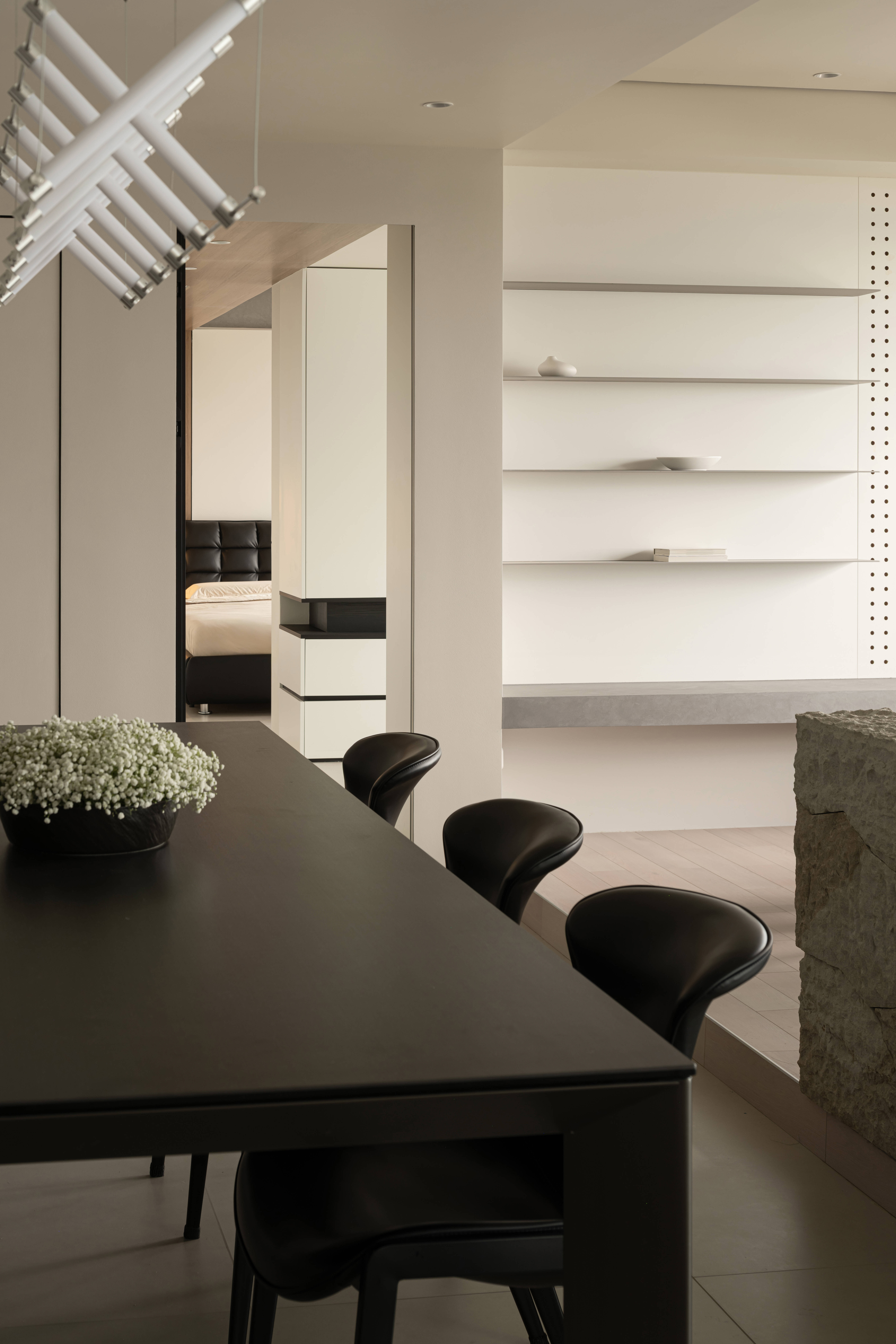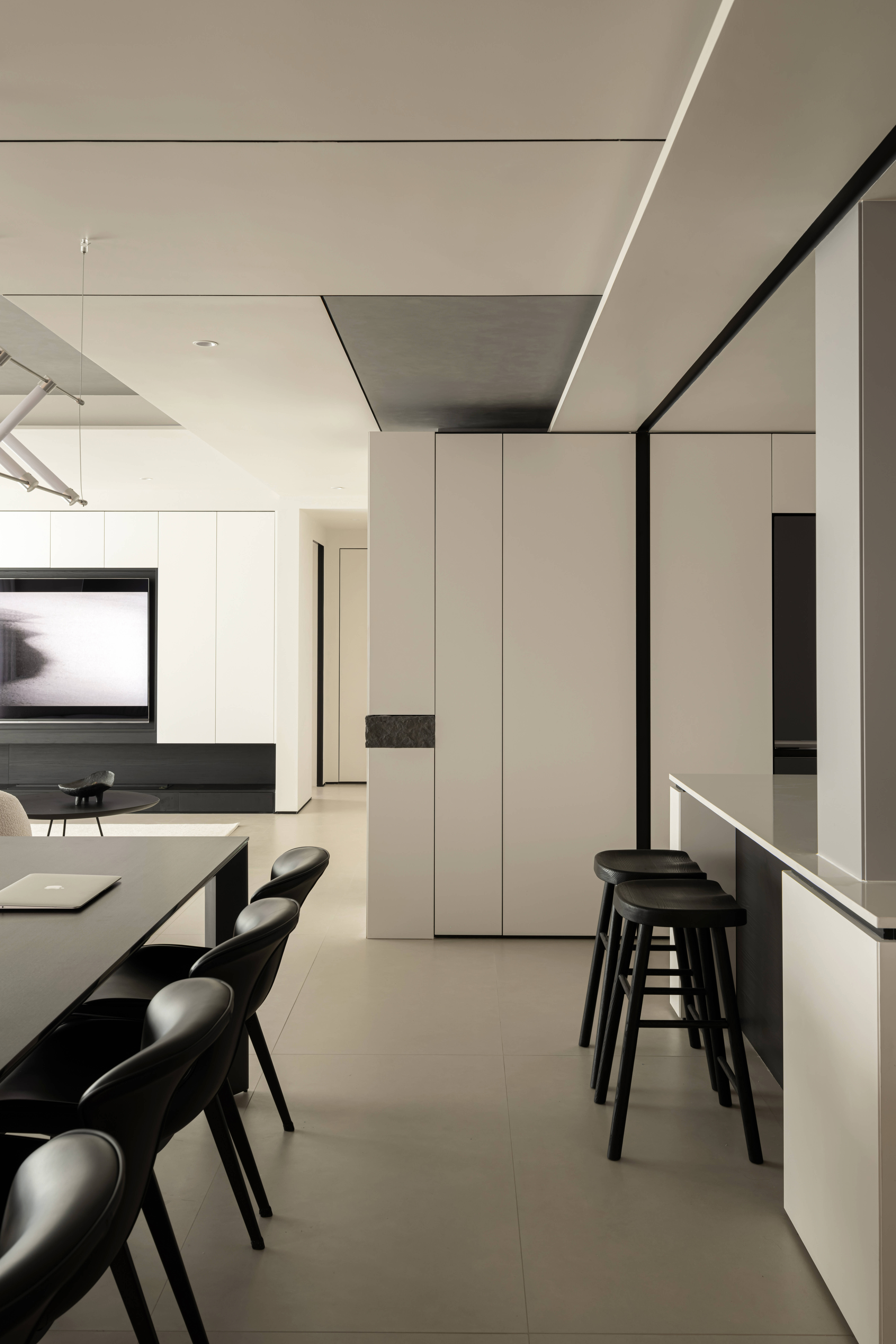 精选岩板、艺术涂料,黑白木皮,拒绝过度加工,保留材料原生肌理——岩板用于岛台、餐桌面,凸显耐磨实用的特性;原木贯穿地板、柜体,注入自然暖意;以极简细节提升精致度,避免材质堆砌带来的杂乱感。 -