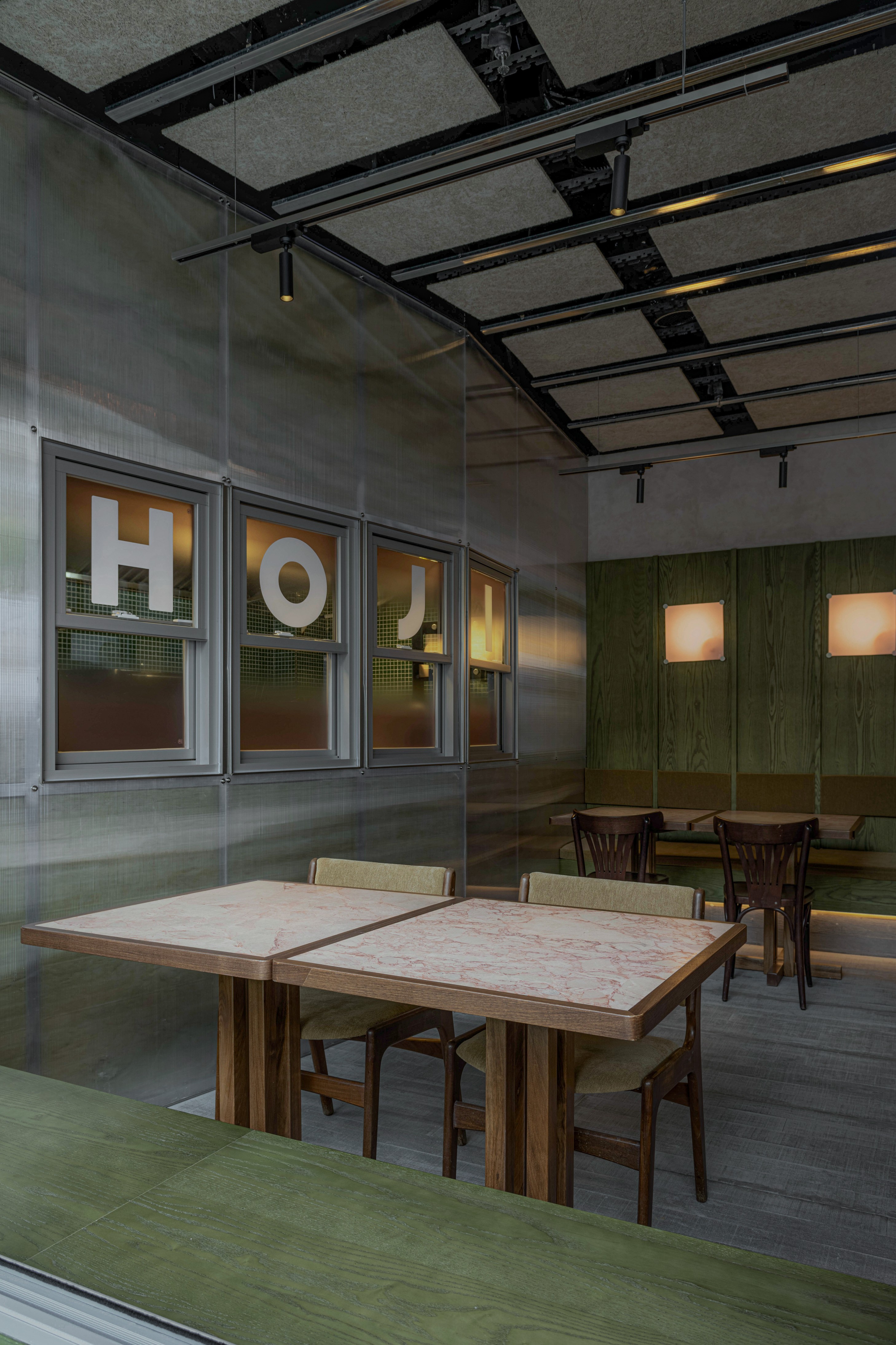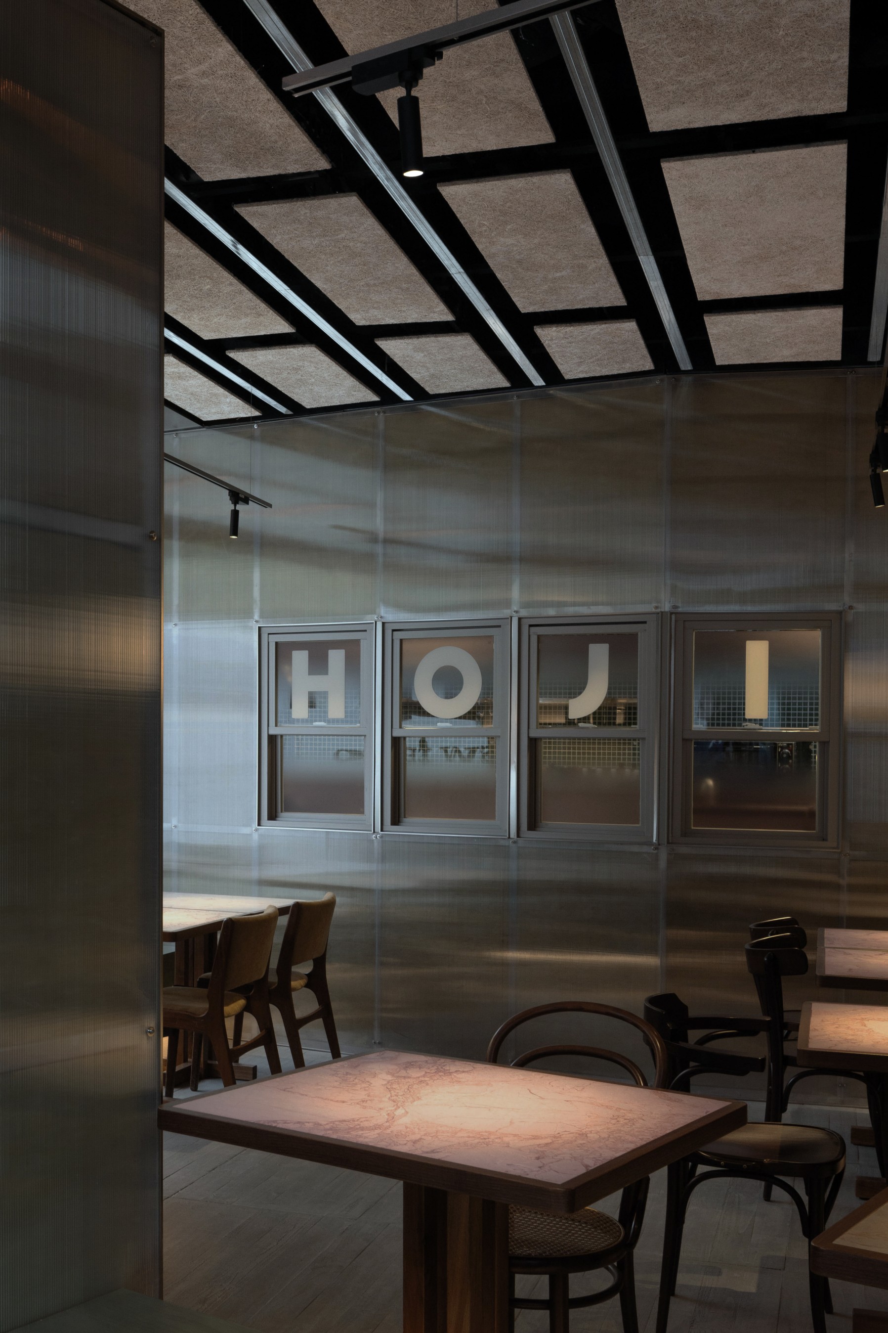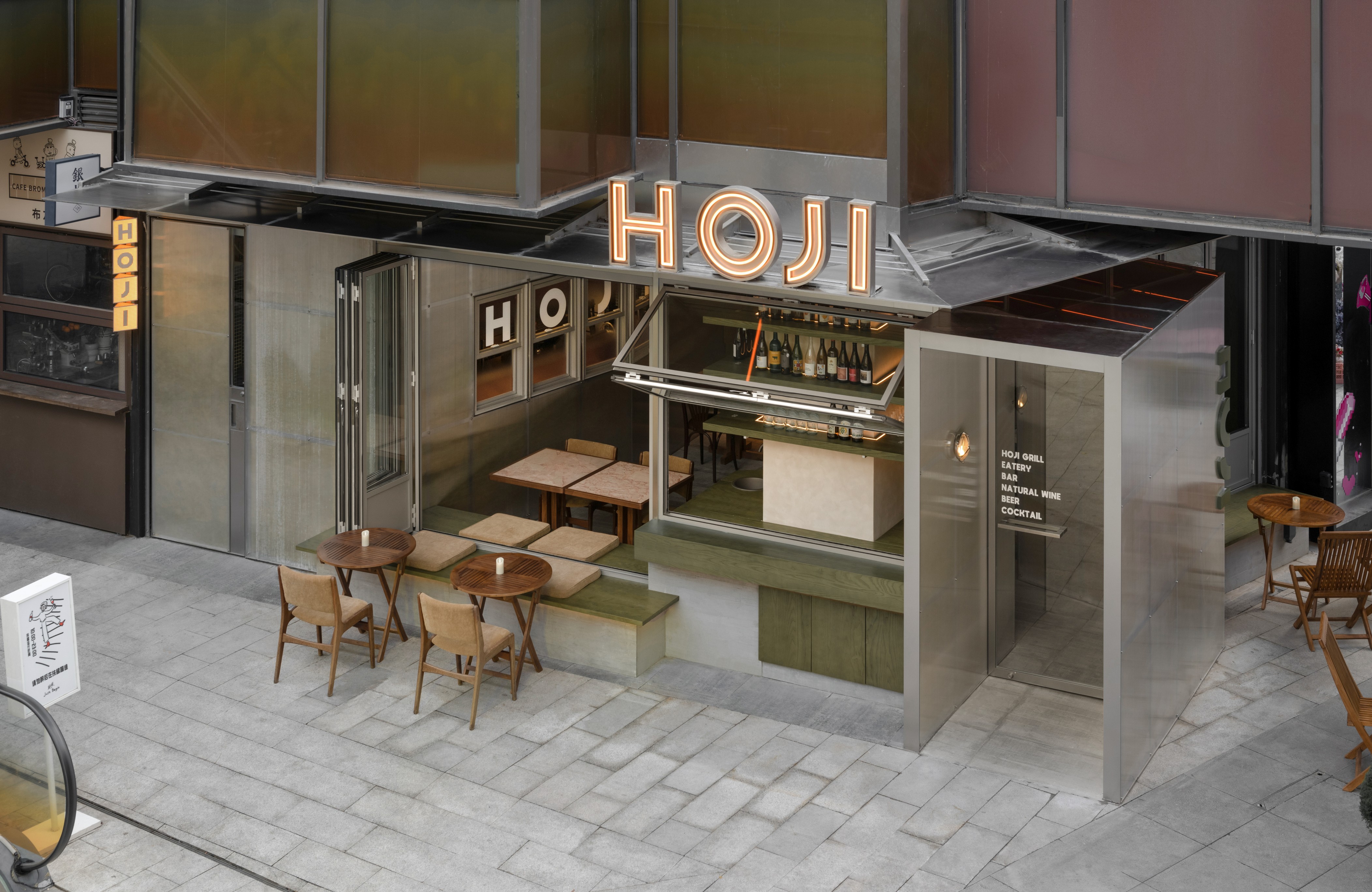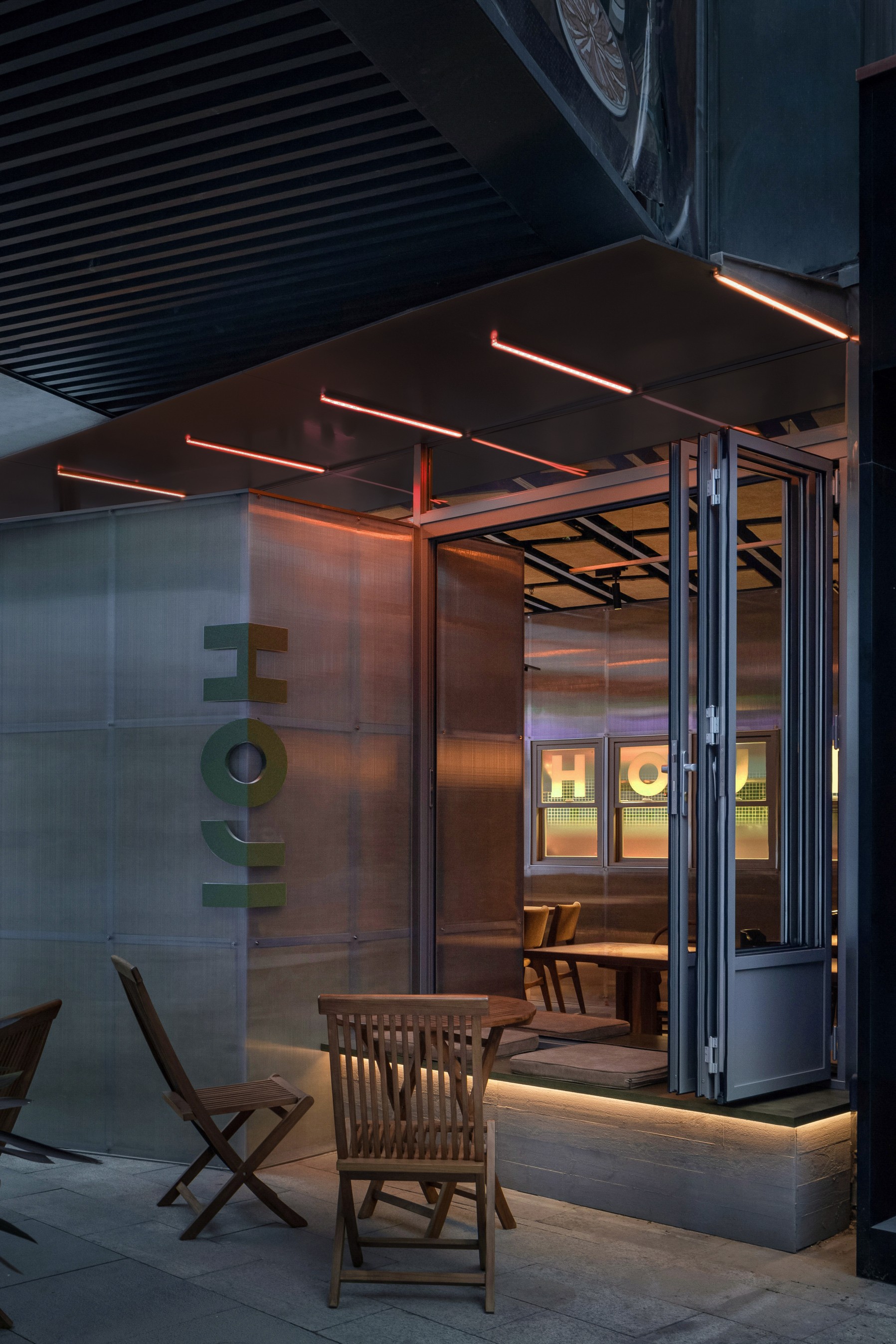 空间意境:以“融合”为核心逻辑,打破传统餐厅封闭轮廓,通过多元开启方式的门窗组合构建拼接感界面,营造Edward Hopper式都市街头诗意凝视体验。悬挑轻盈屋檐庇护檐下用餐区,延展街区公共性;日落之后灯光柔化,借阳光板微反射引入街景光影,模糊场所与时间边界,适配微醺松弛氛围。