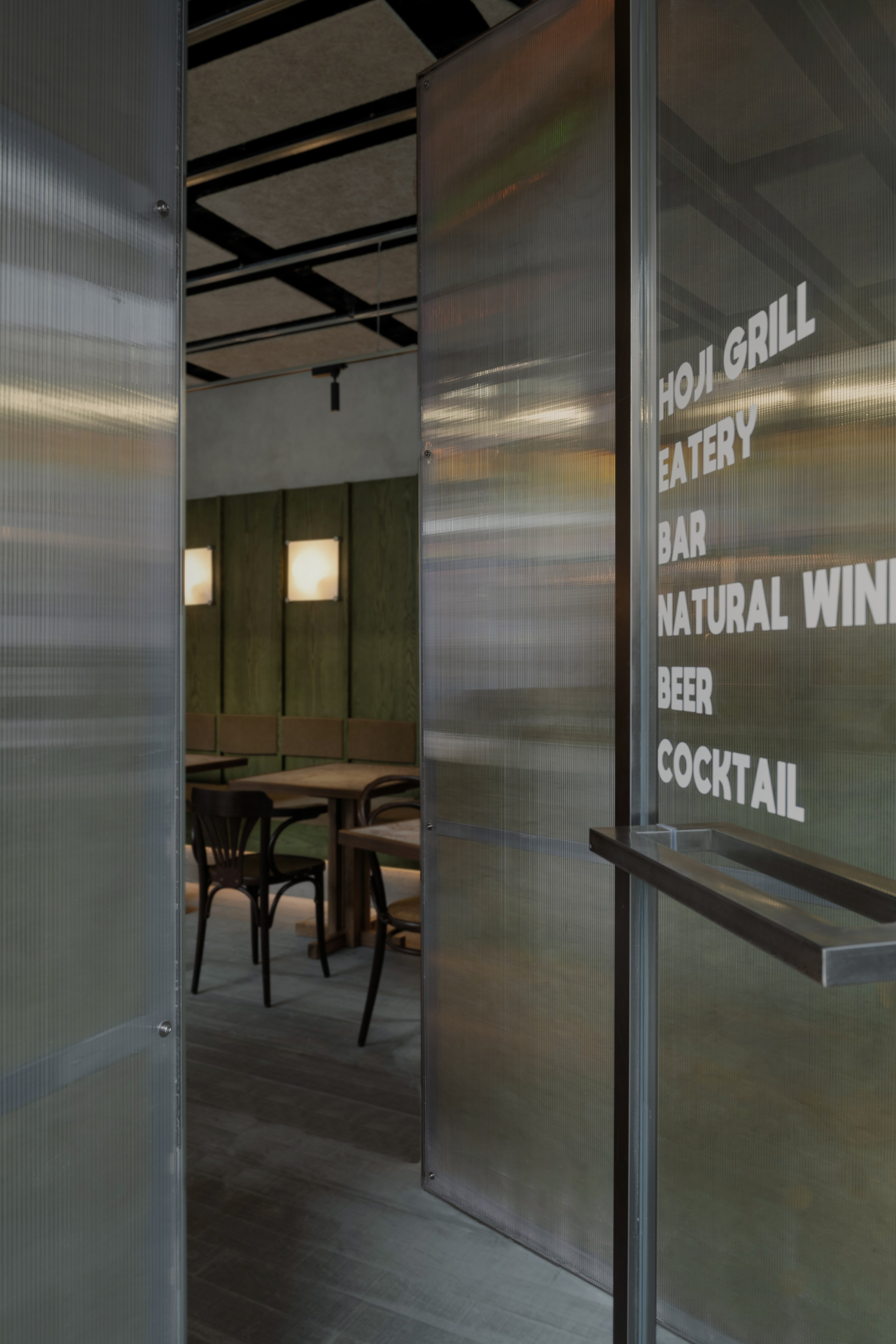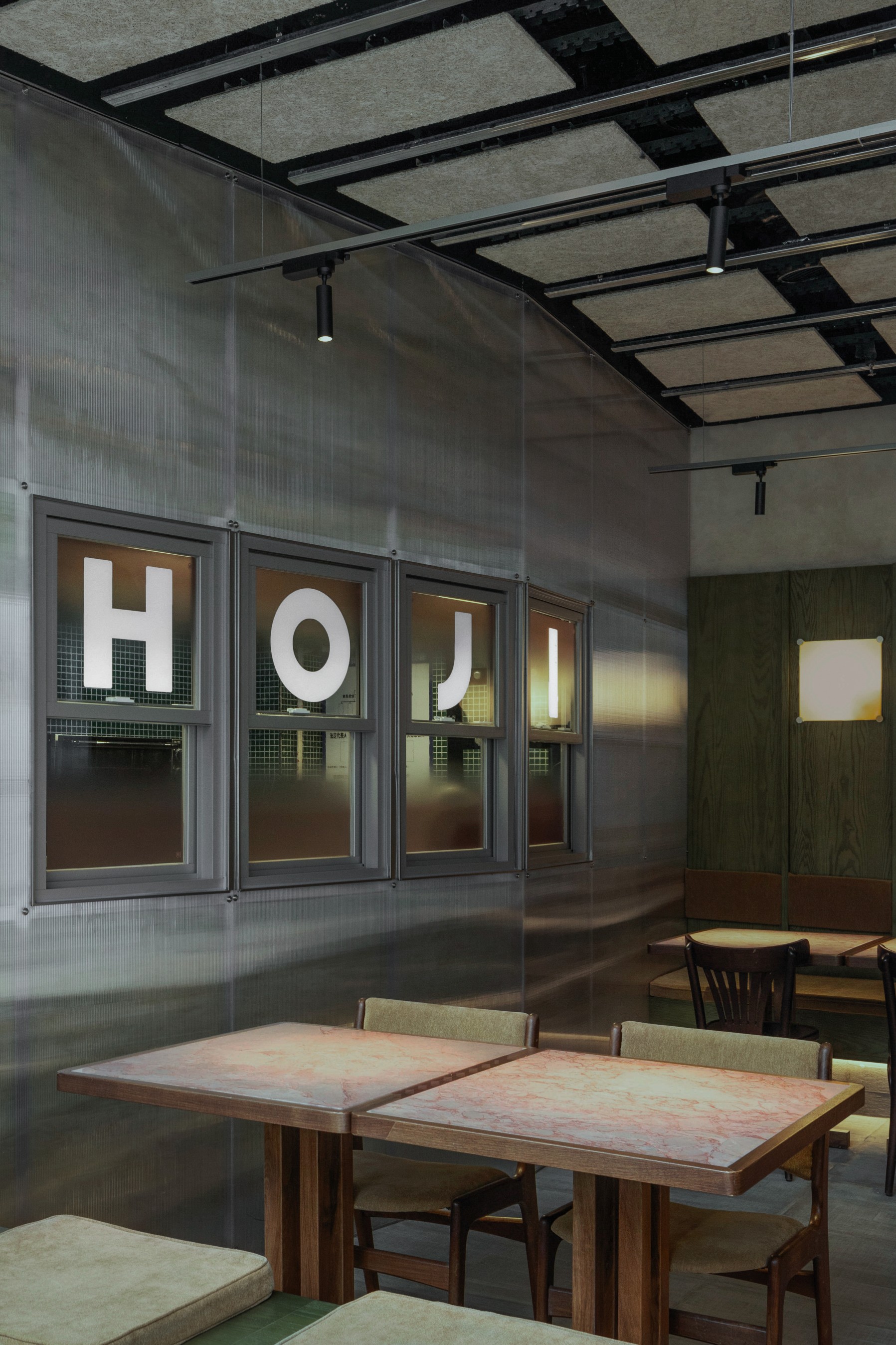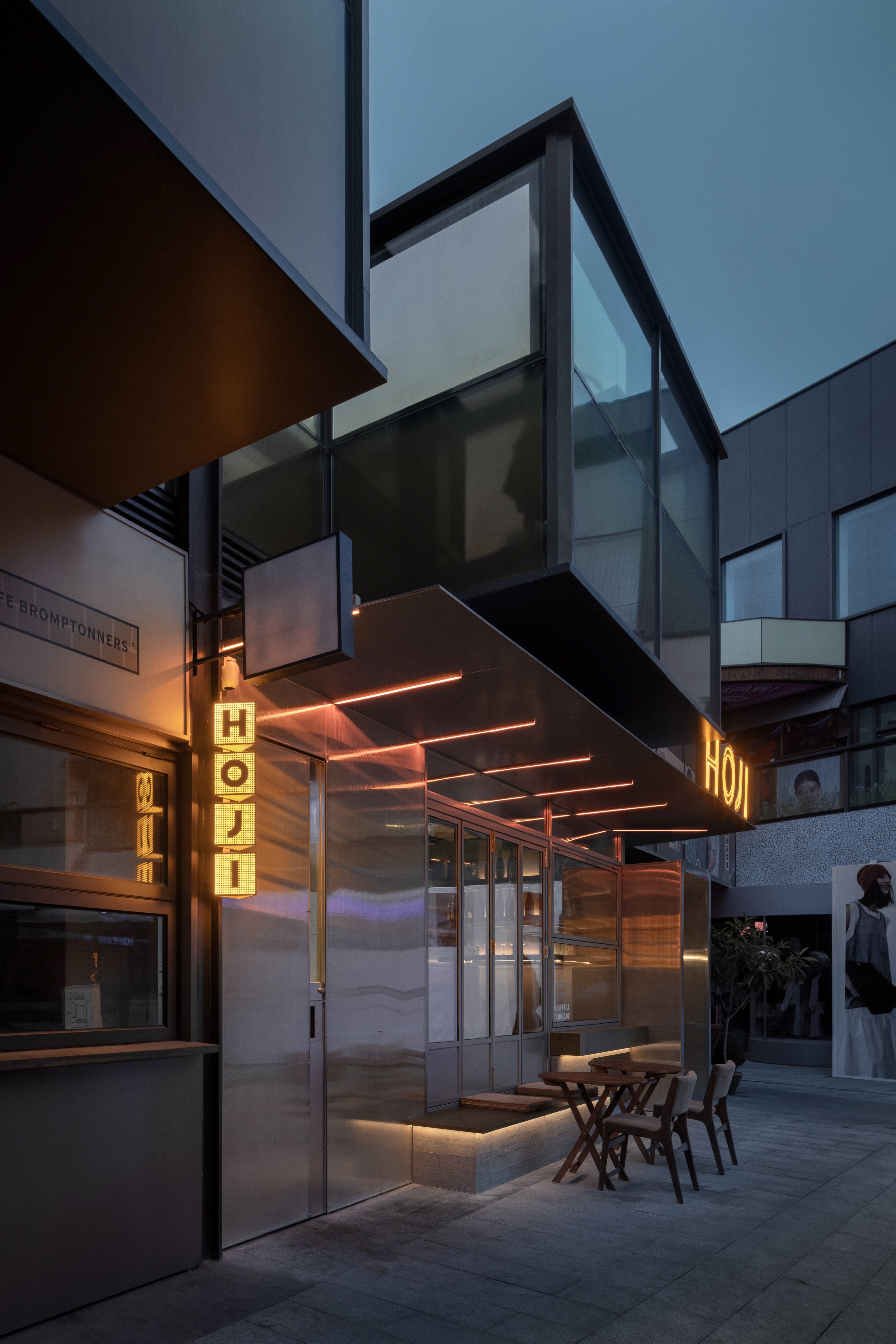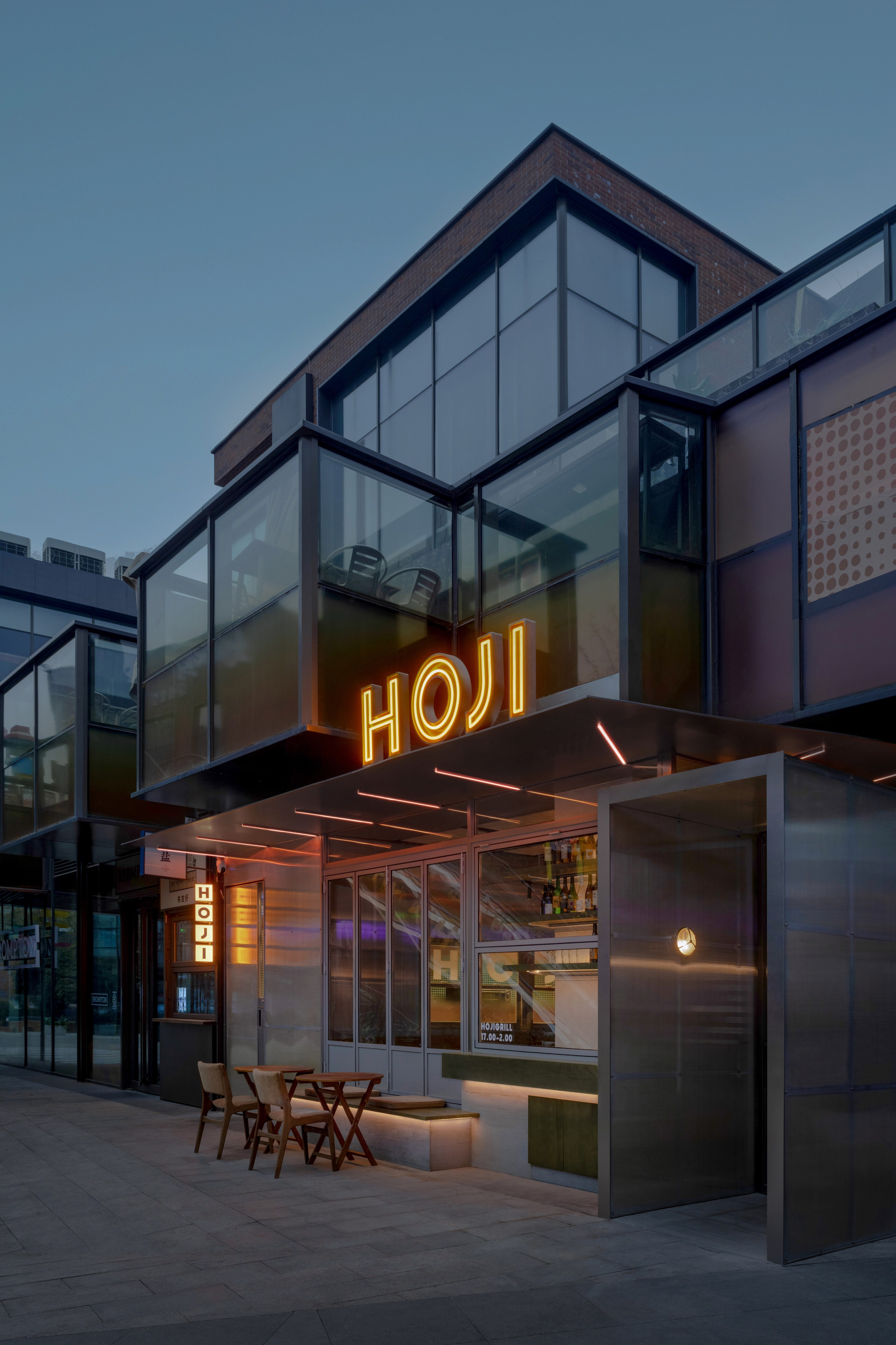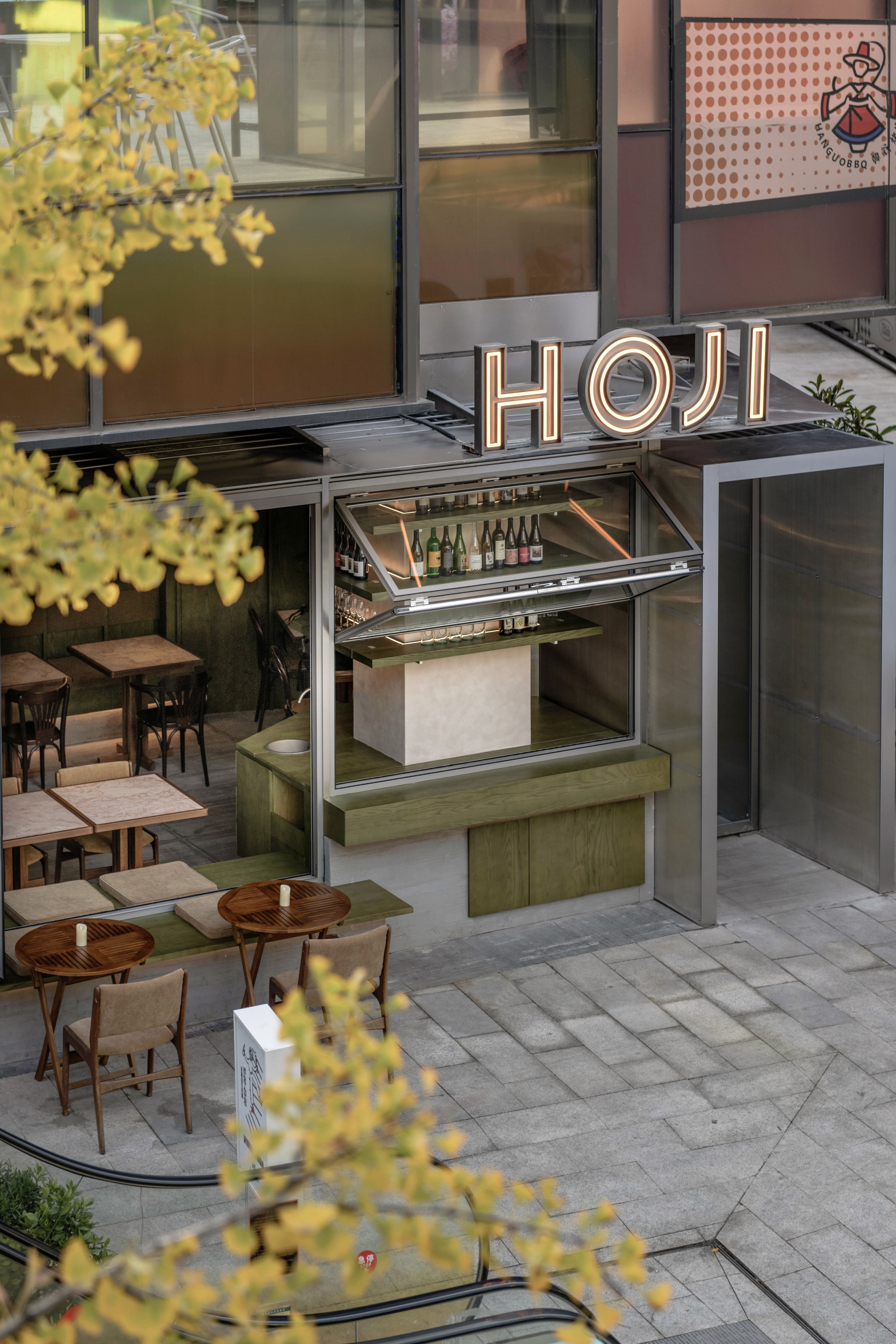 空间意境:以“融合”为核心逻辑,打破传统餐厅封闭轮廓,通过多元开启方式的门窗组合构建拼接感界面,营造Edward Hopper式都市街头诗意凝视体验。悬挑轻盈屋檐庇护檐下用餐区,延展街区公共性;日落之后灯光柔化,借阳光板微反射引入街景光影,模糊场所与时间边界,适配微醺松弛氛围。