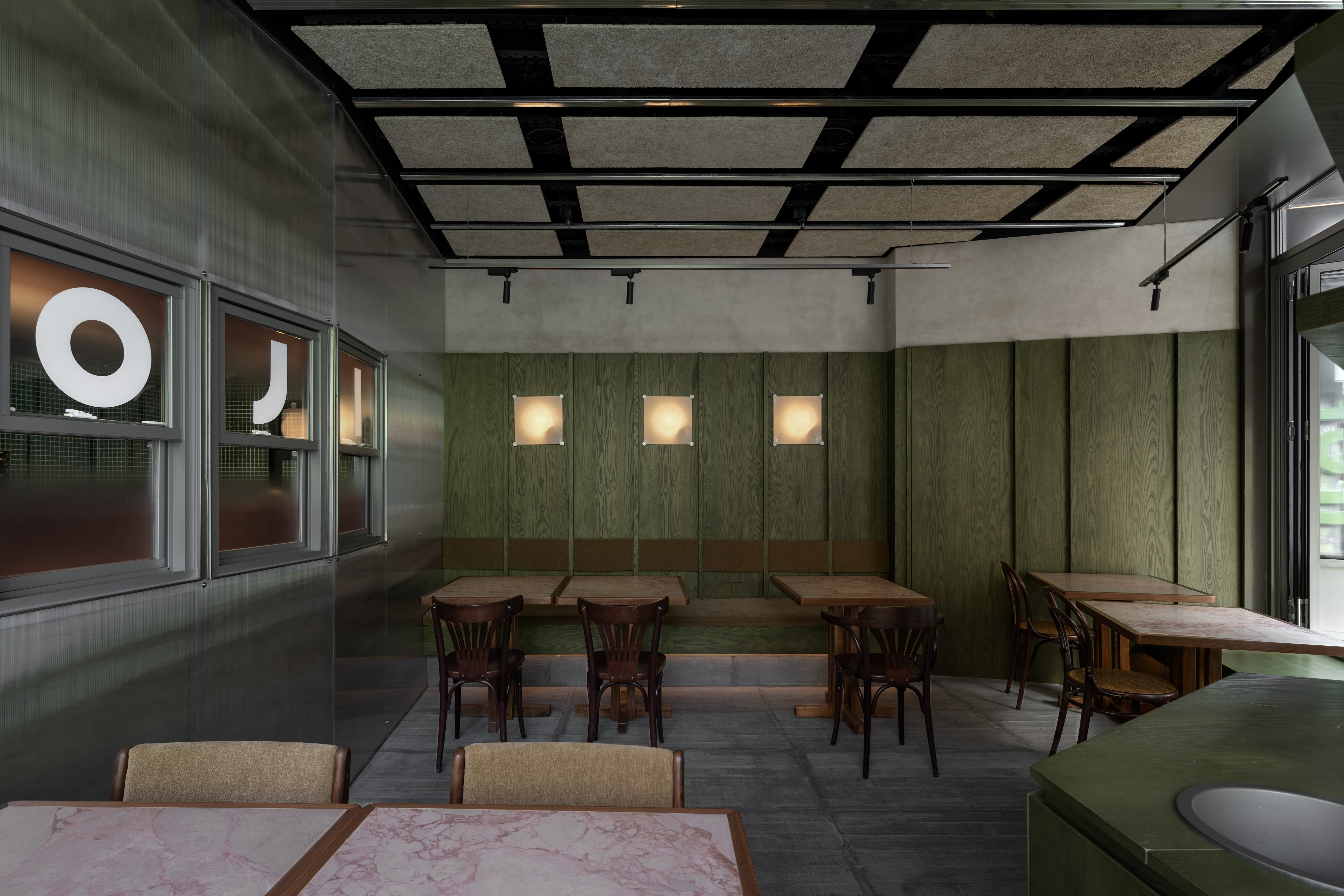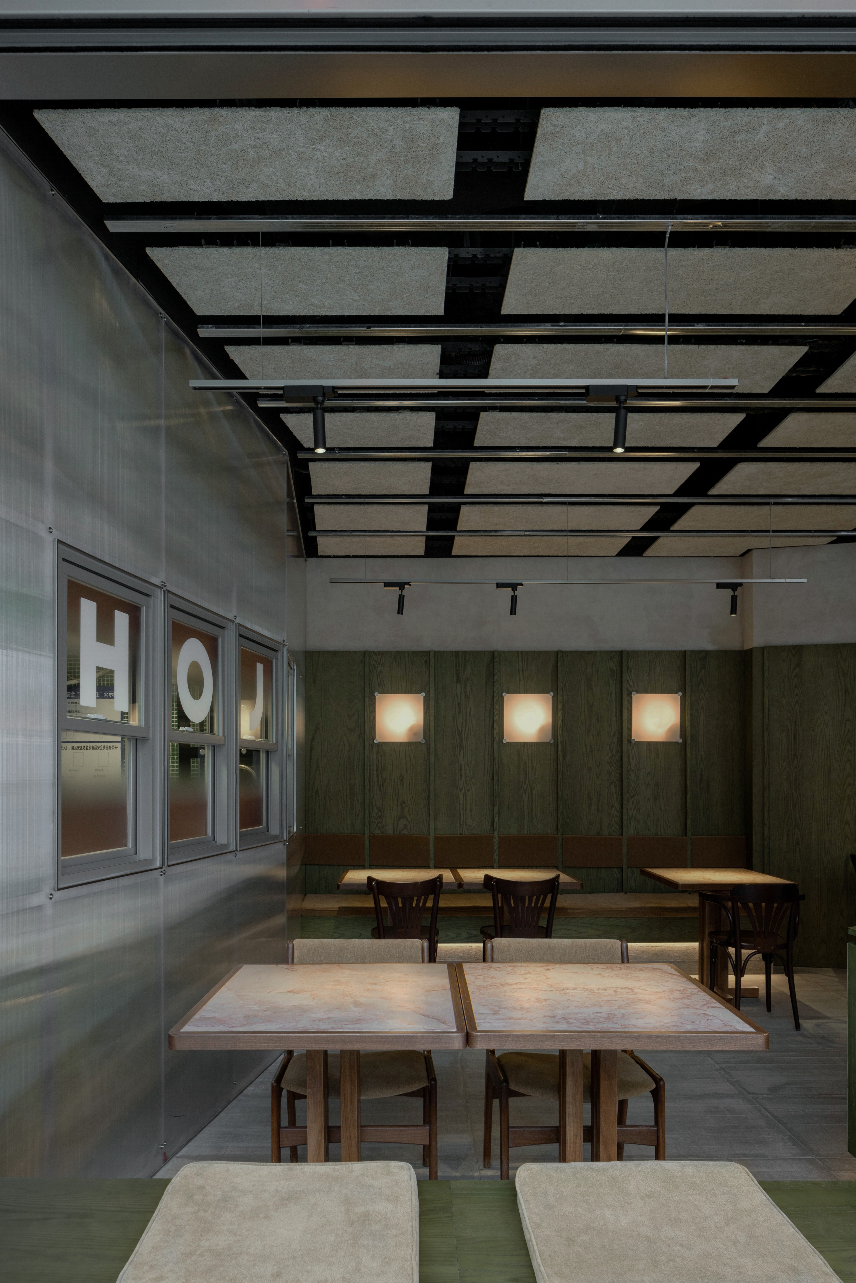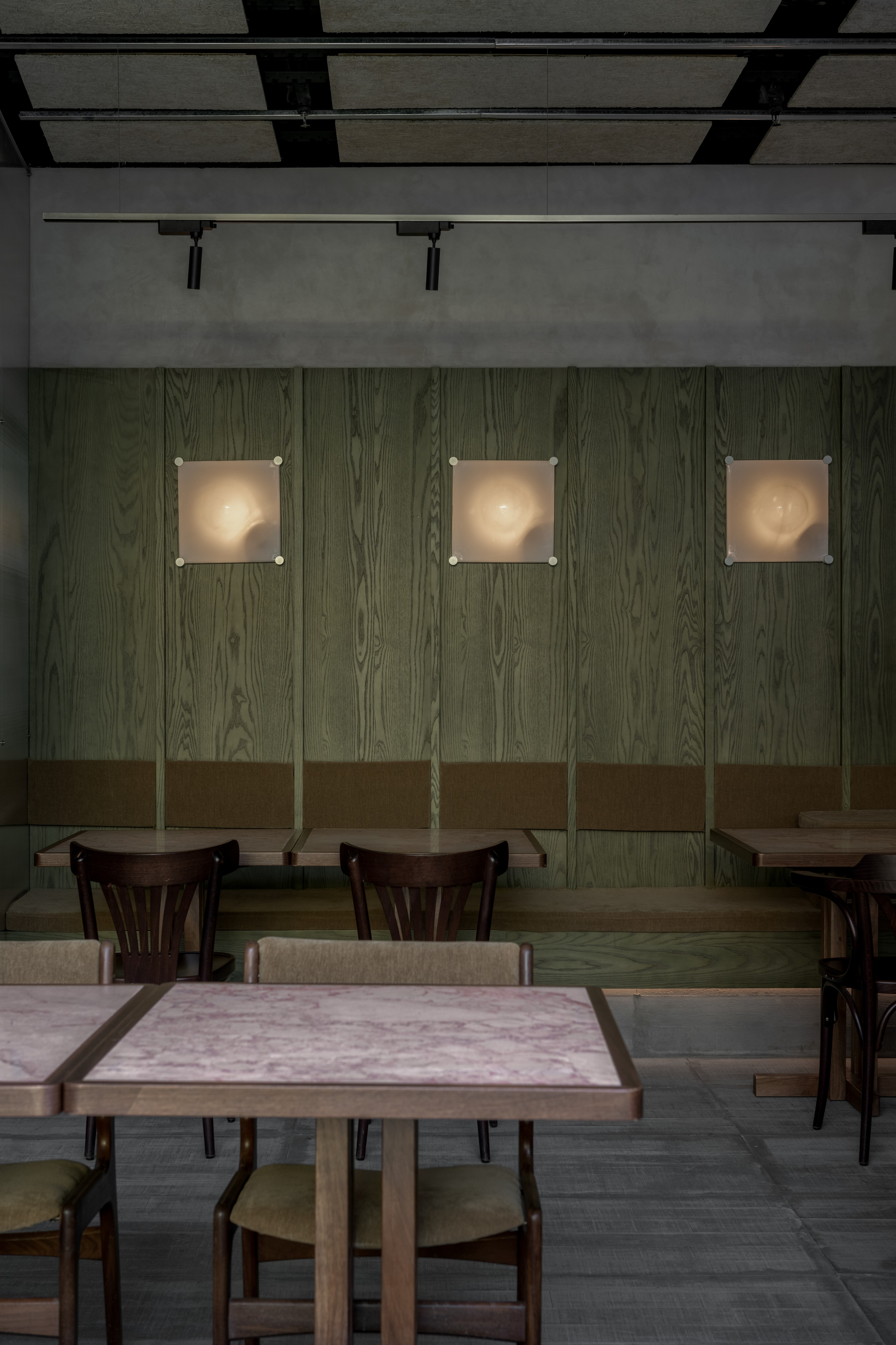 设计选材:色彩基调以克制中性灰为主,选用木纹混凝土地面、轻钢龙骨、阳光板+保温棉墙体及吸音木丝板,悬浮轻钢龙骨整合顶部设备保障声环境舒适。近人尺度搭配豆绿色木纹墙板、粉色大理石桌面与奶咖色绒面坐垫,营造温暖柔和触感;植入主理人过往餐厅收藏的不同款式椅子,赋予空间记忆感与私密属性。