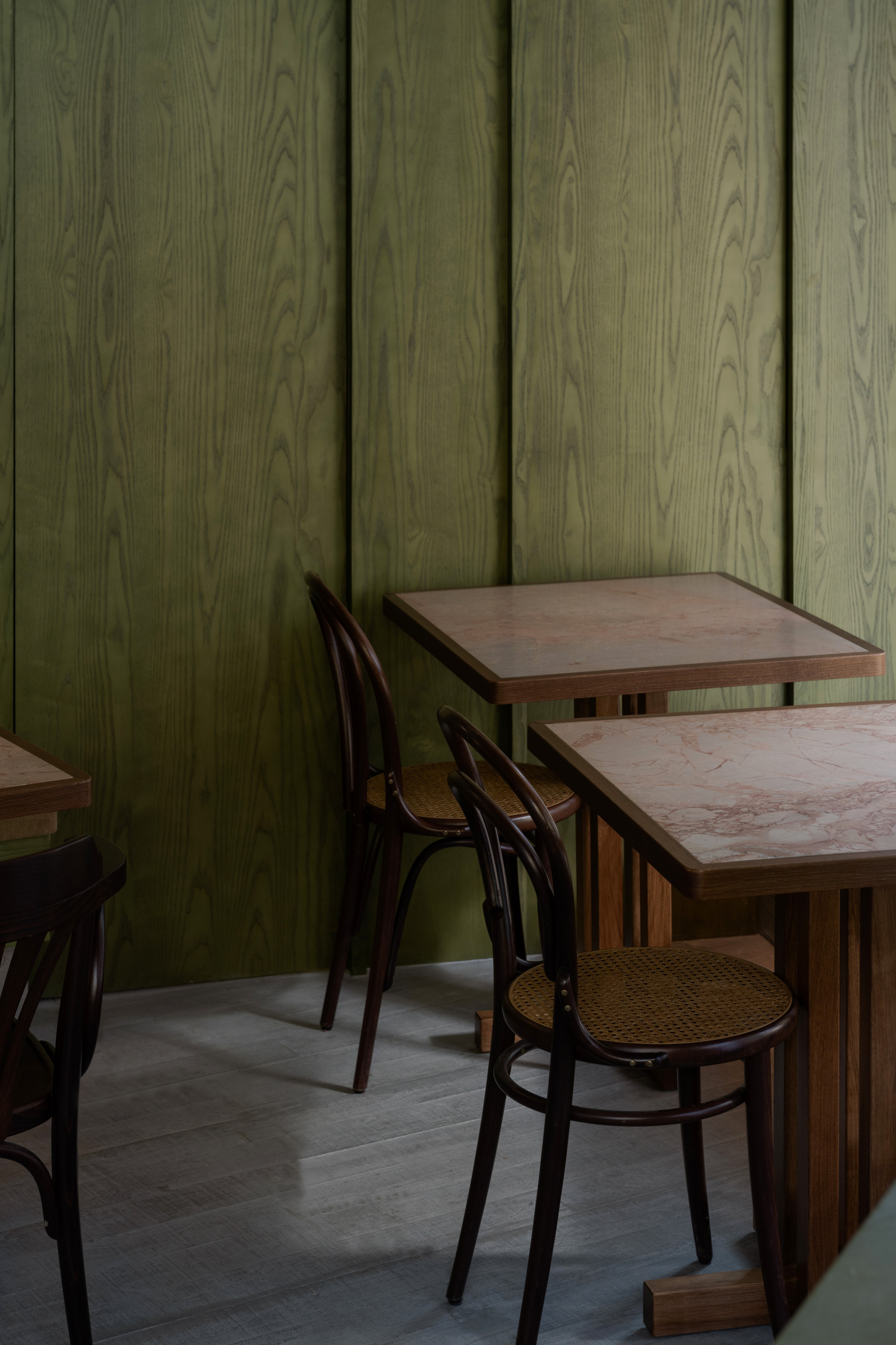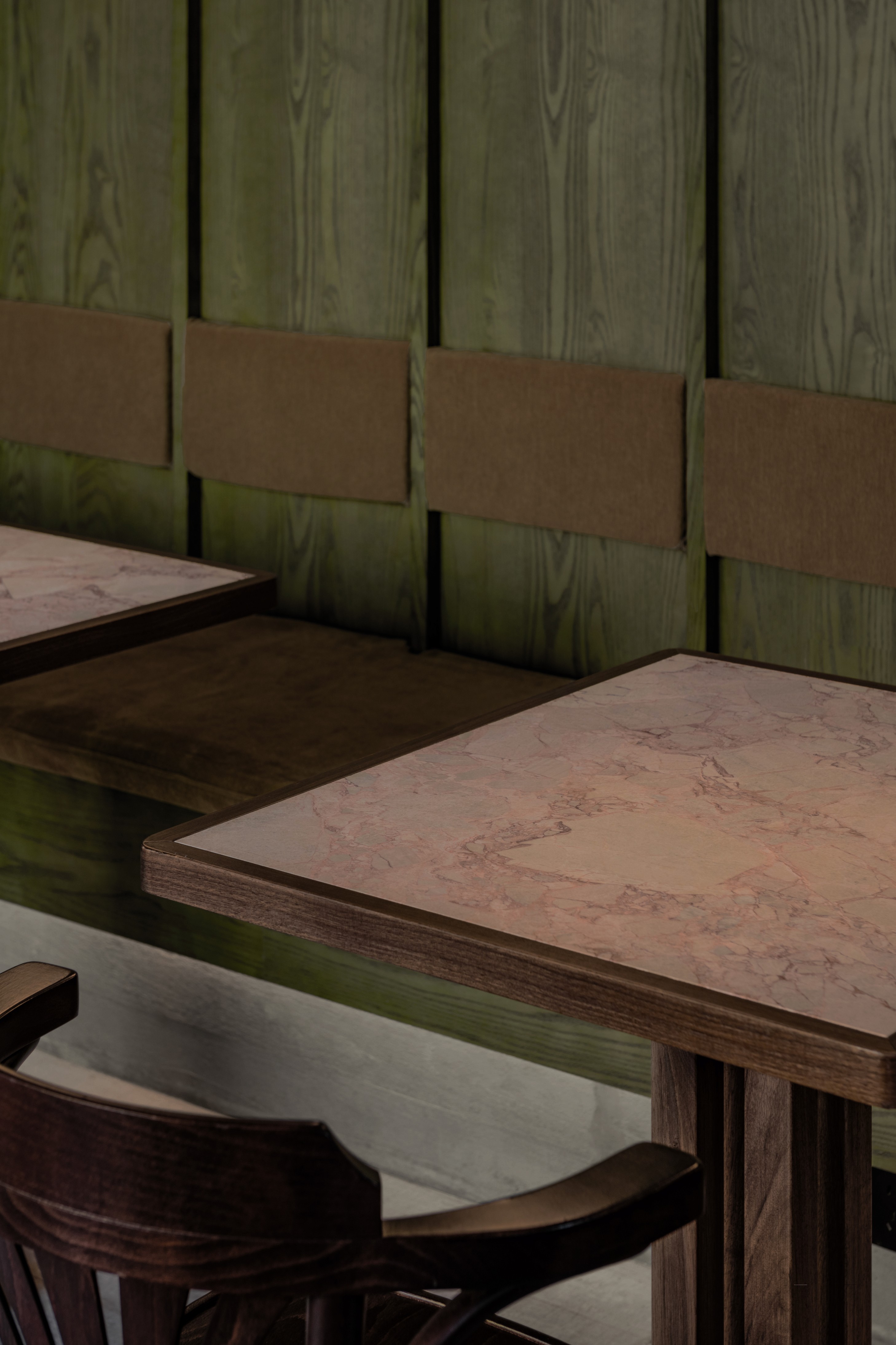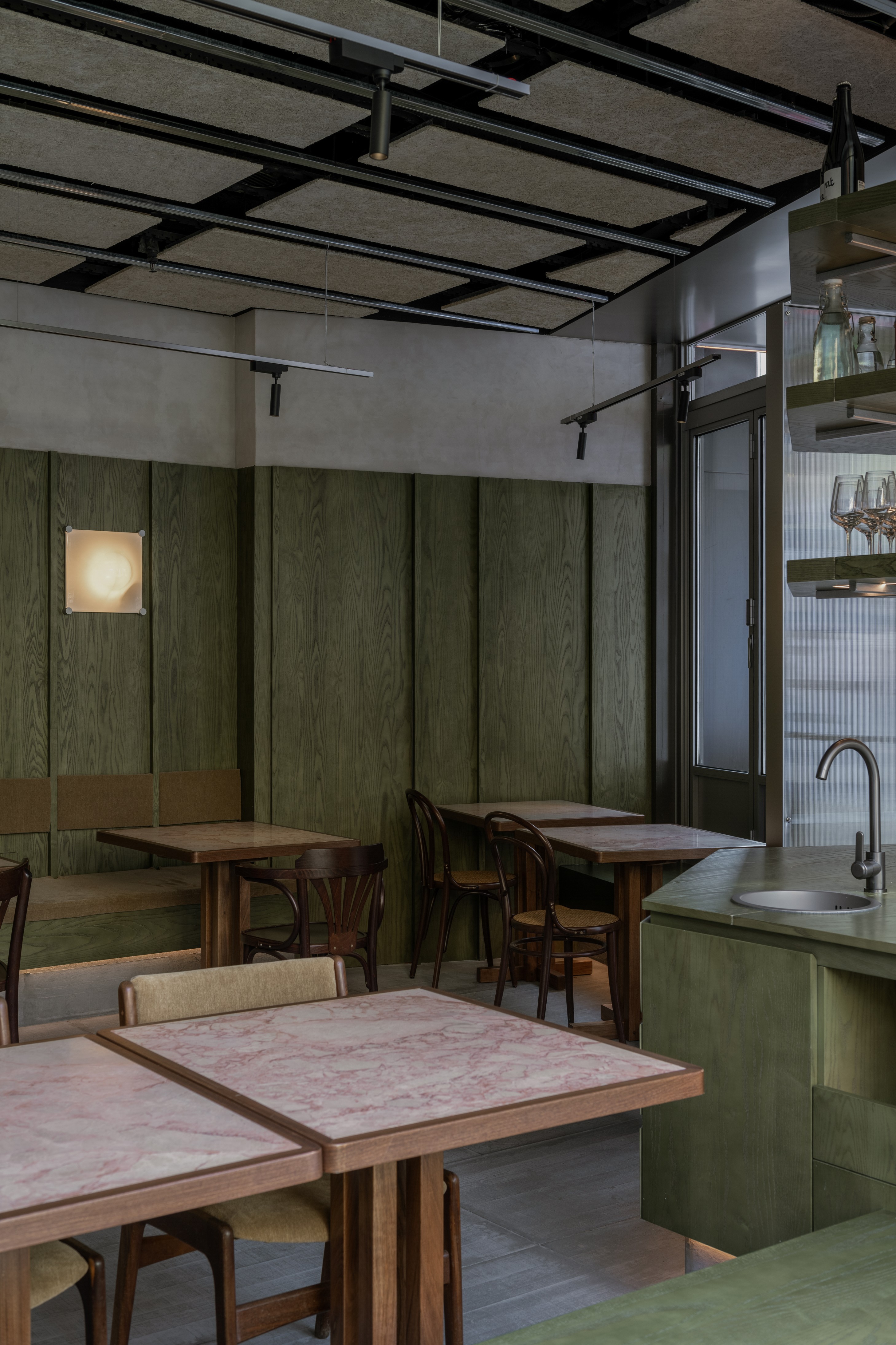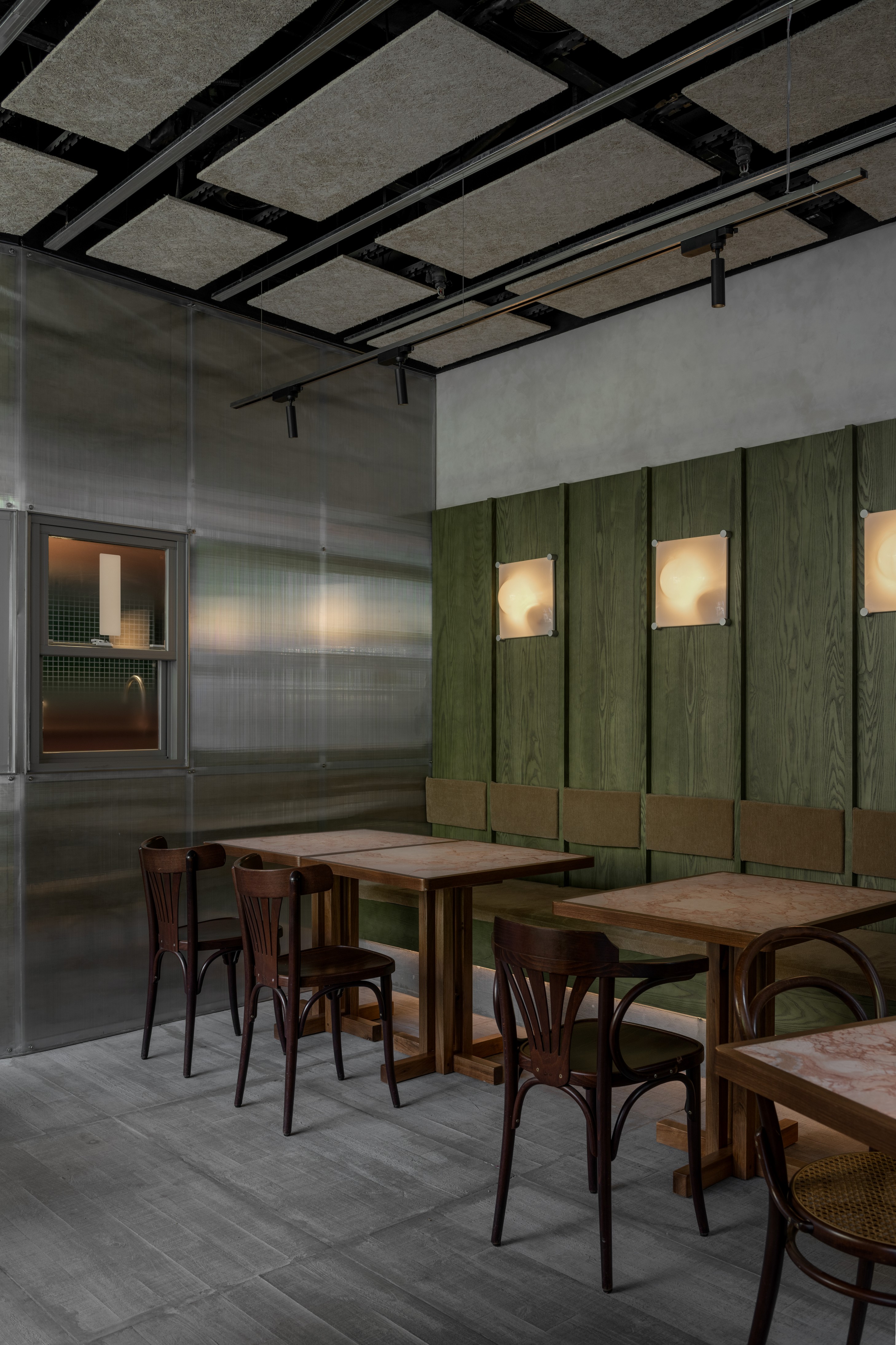 设计选材:色彩基调以克制中性灰为主,选用木纹混凝土地面、轻钢龙骨、阳光板+保温棉墙体及吸音木丝板,悬浮轻钢龙骨整合顶部设备保障声环境舒适。近人尺度搭配豆绿色木纹墙板、粉色大理石桌面与奶咖色绒面坐垫,营造温暖柔和触感;植入主理人过往餐厅收藏的不同款式椅子,赋予空间记忆感与私密属性。
