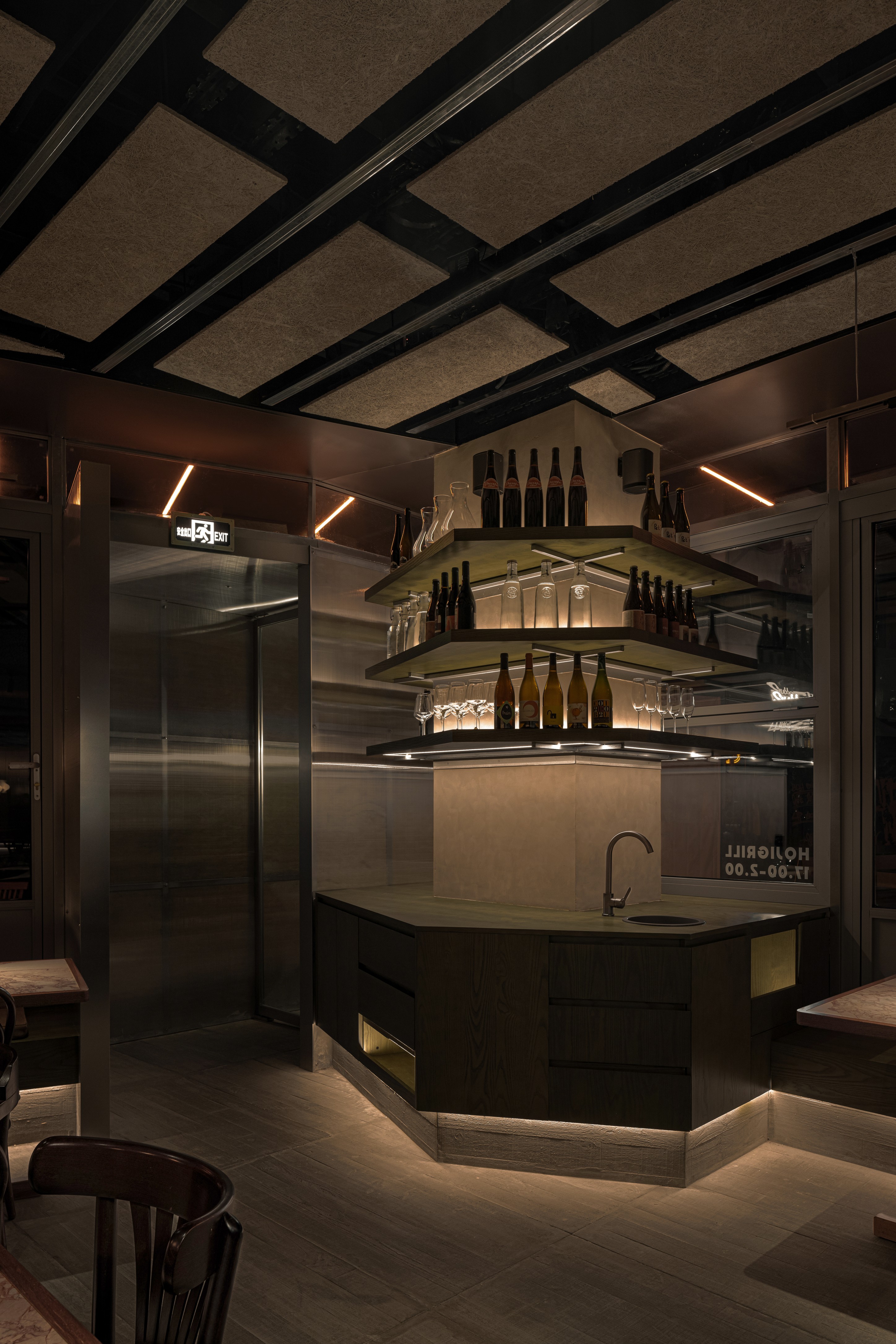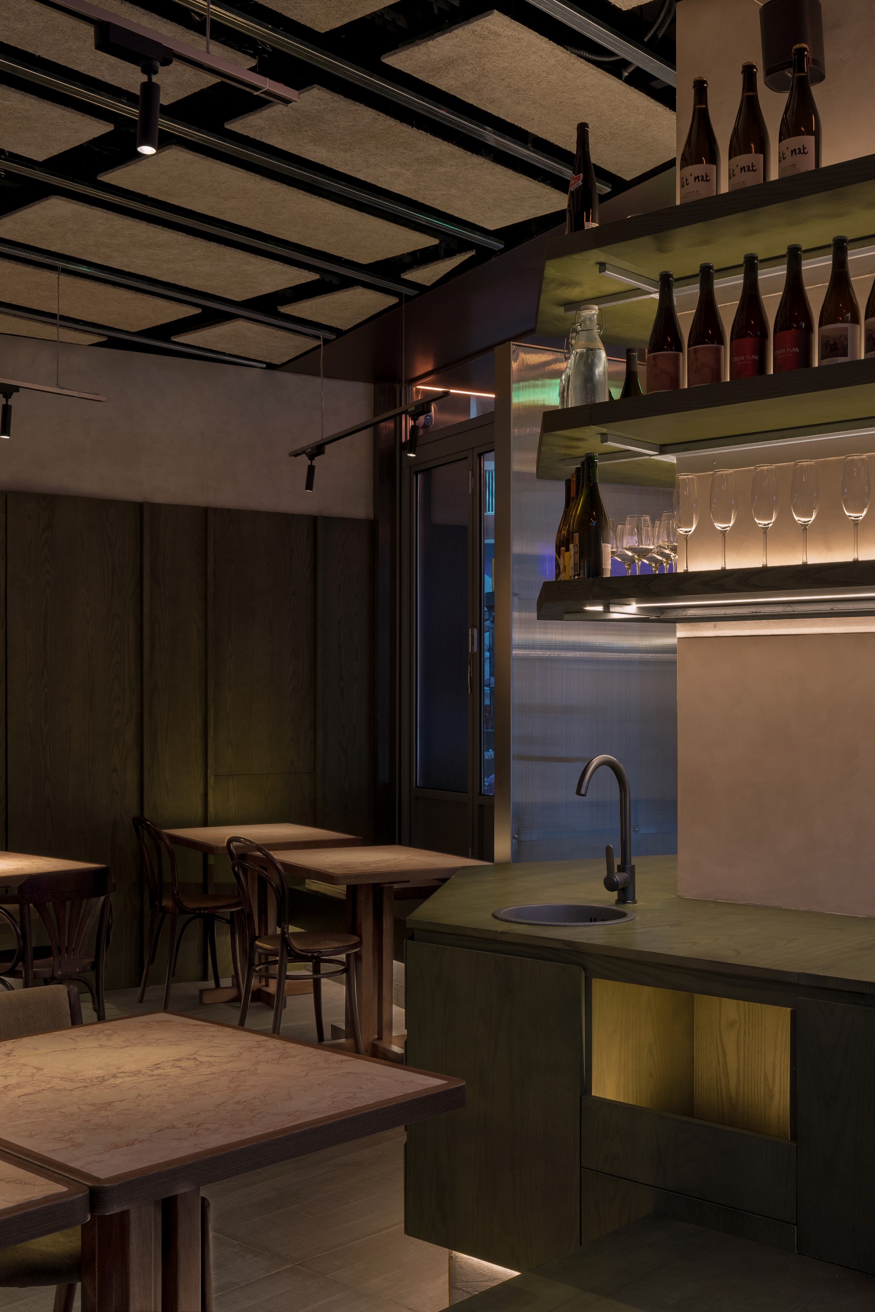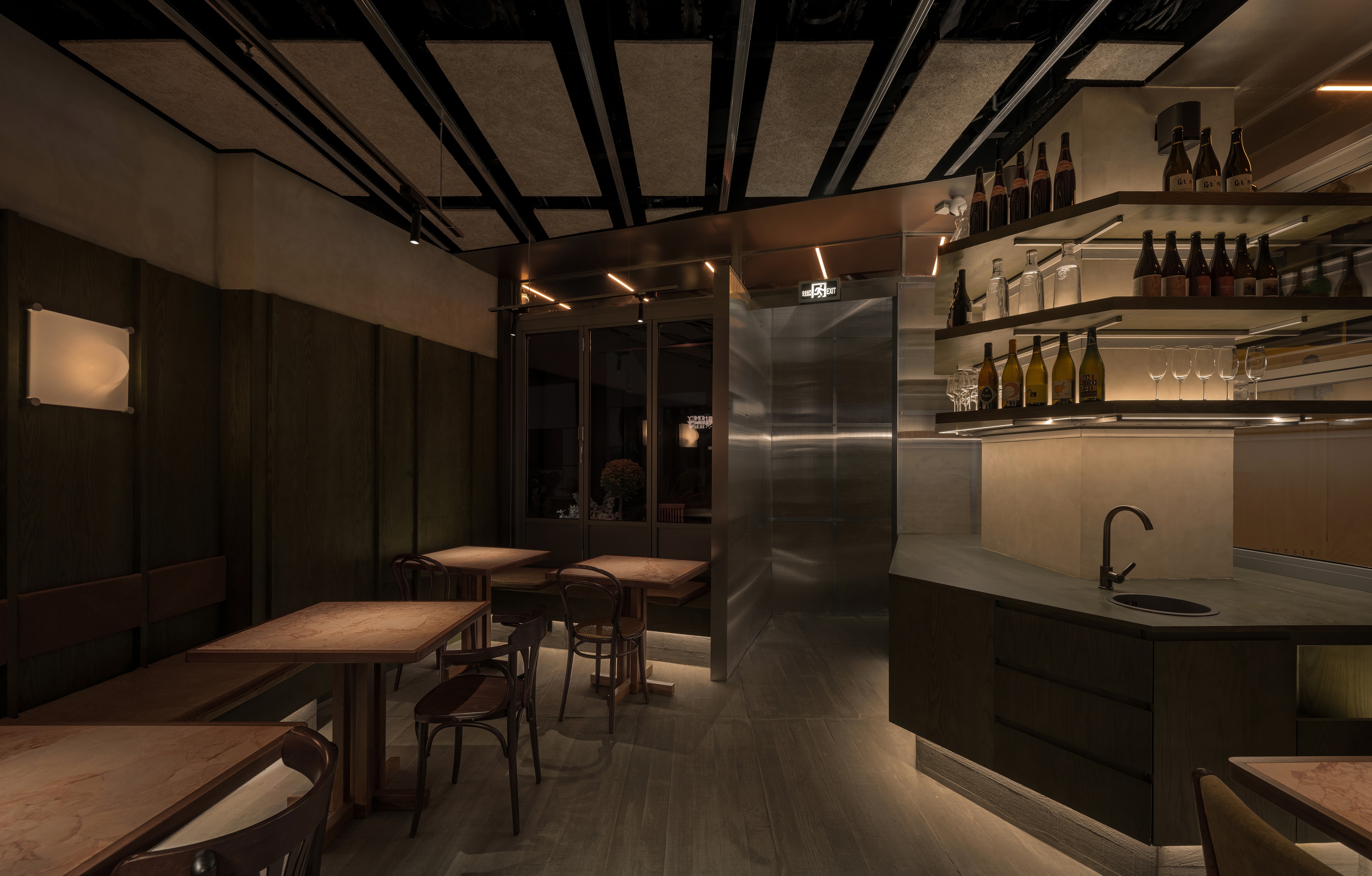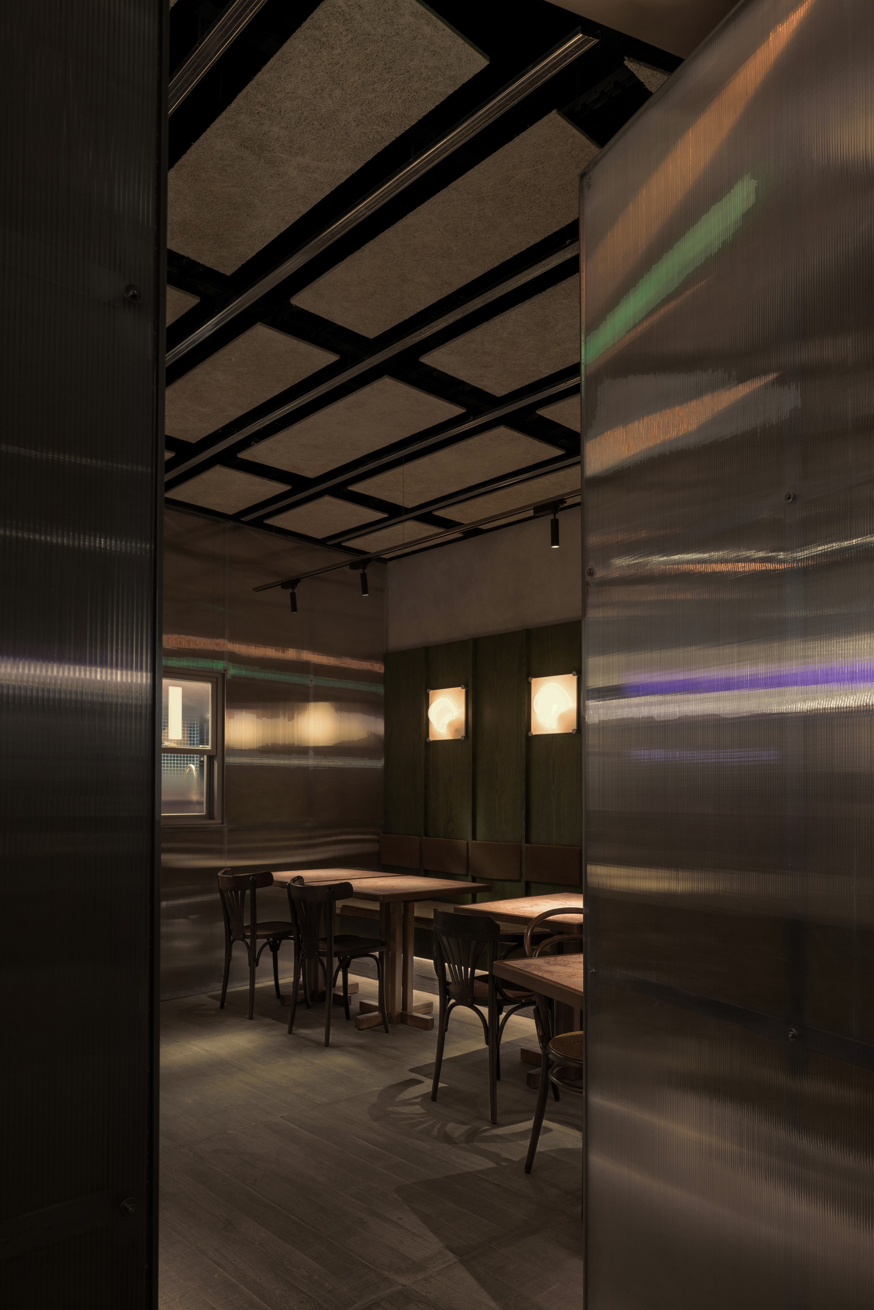 空间布局:以室内唯一混凝土柱为功能锚点,布置不规则酒水操作台,划分多个空间切面,重构建筑转角轮廓线,借折线构造制造独特“不稳定感”。折形墙体围合厨房,设可开启窗扇强化互动;入口独立前室缓冲气流、打破封闭感,为小尺度空间赋予节奏变化。