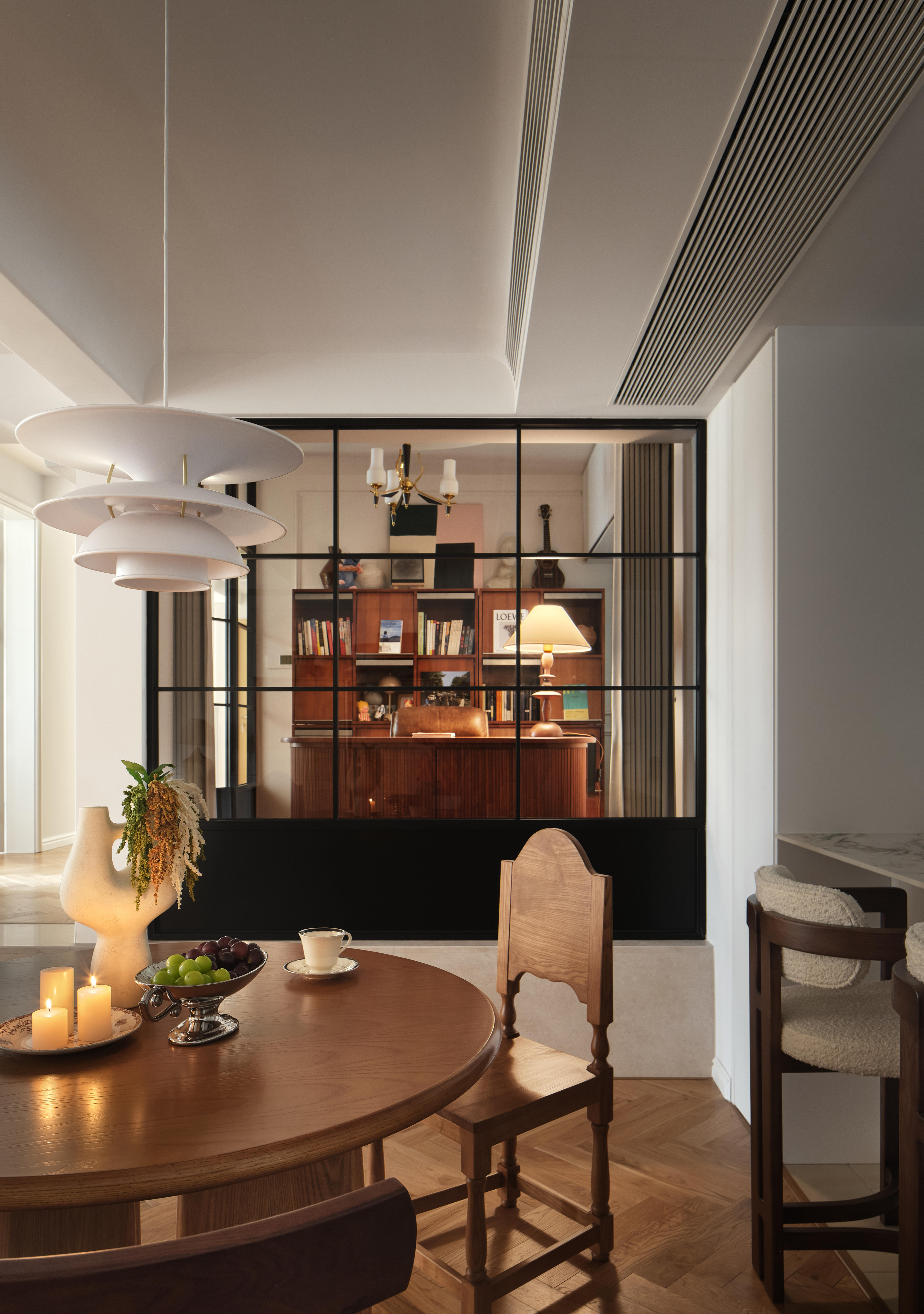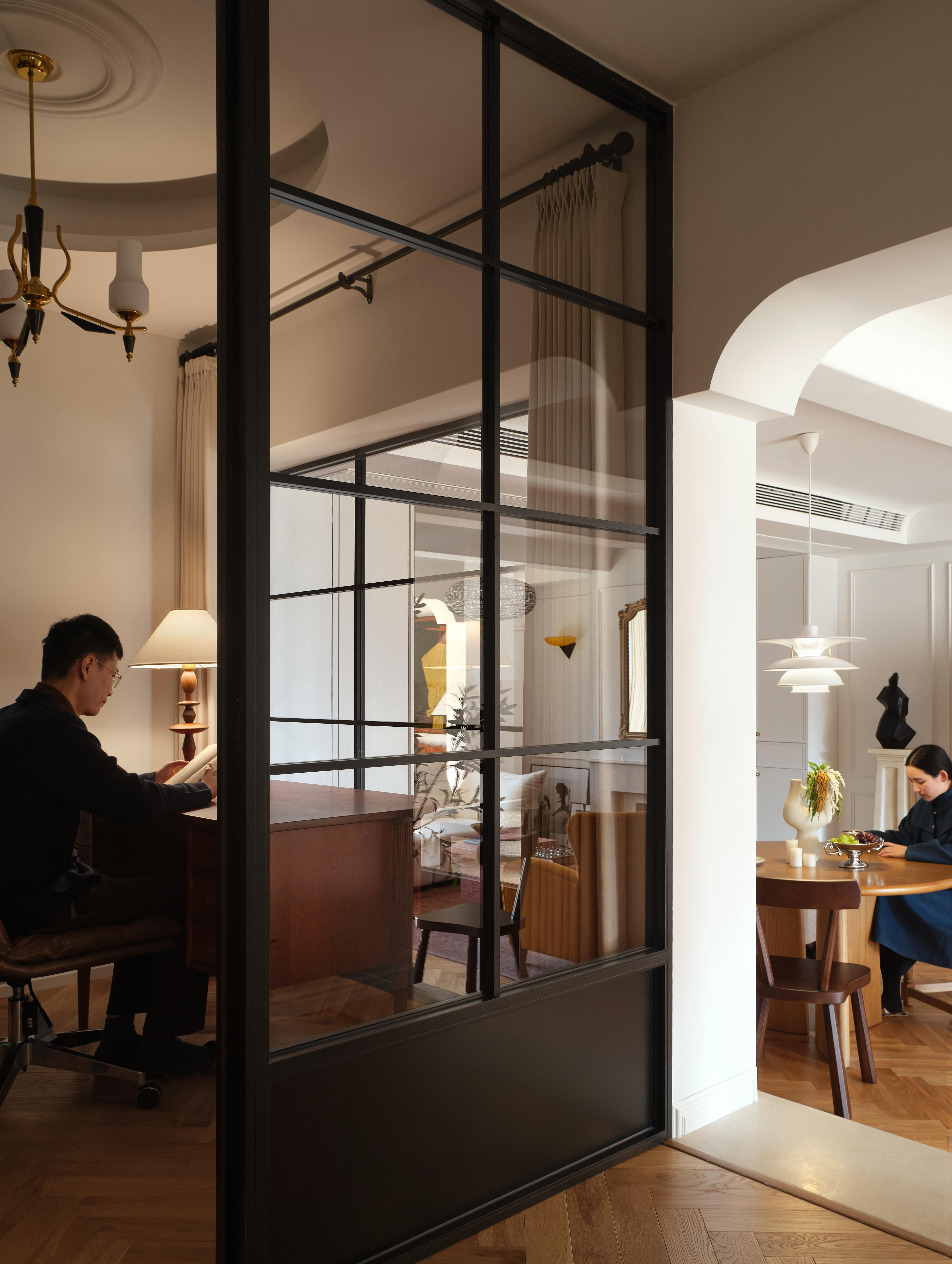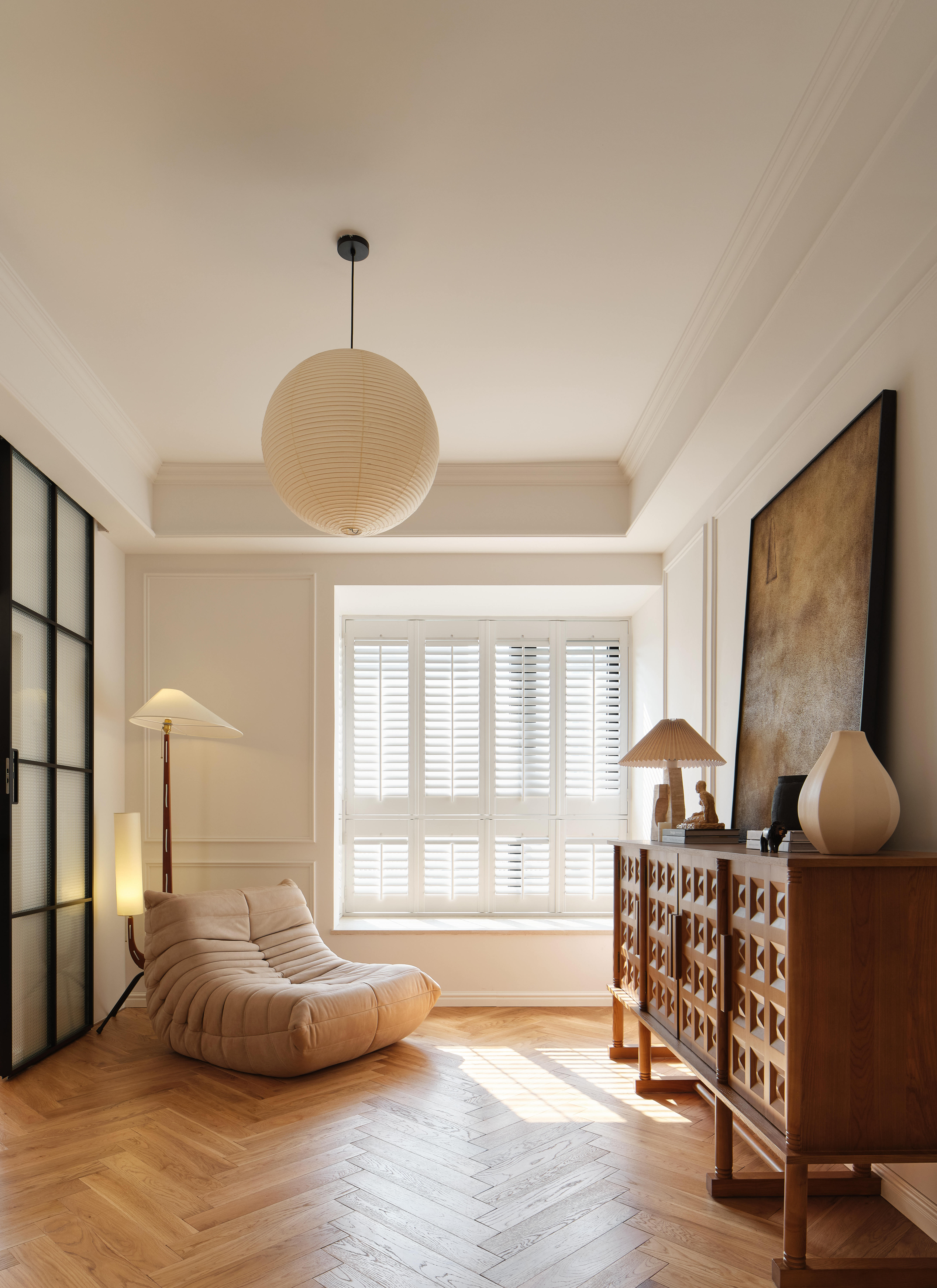 从客厅步入卧室需踏上三级台阶,这道看似不起眼的高差,被赋予了“跨越几代人”的情感寓意。台阶右侧是静谧的独立书房,尺度恰到好处;左侧则是兼具休闲与实用的多功能区——日常可作休闲厅,未来能成为孩子的玩耍天地,闭合房门后又可化作独立休息区,实现空间的多元利用。