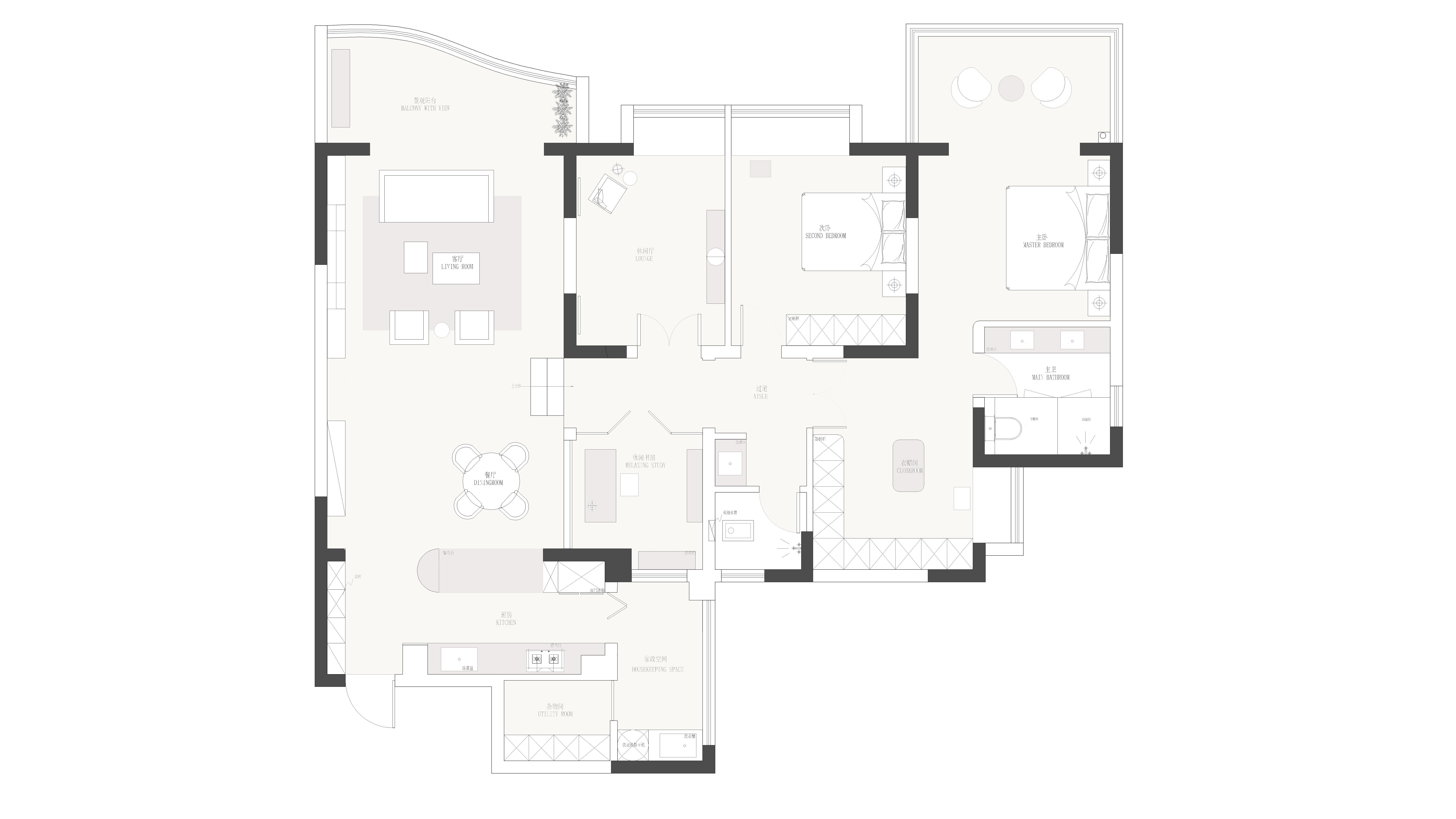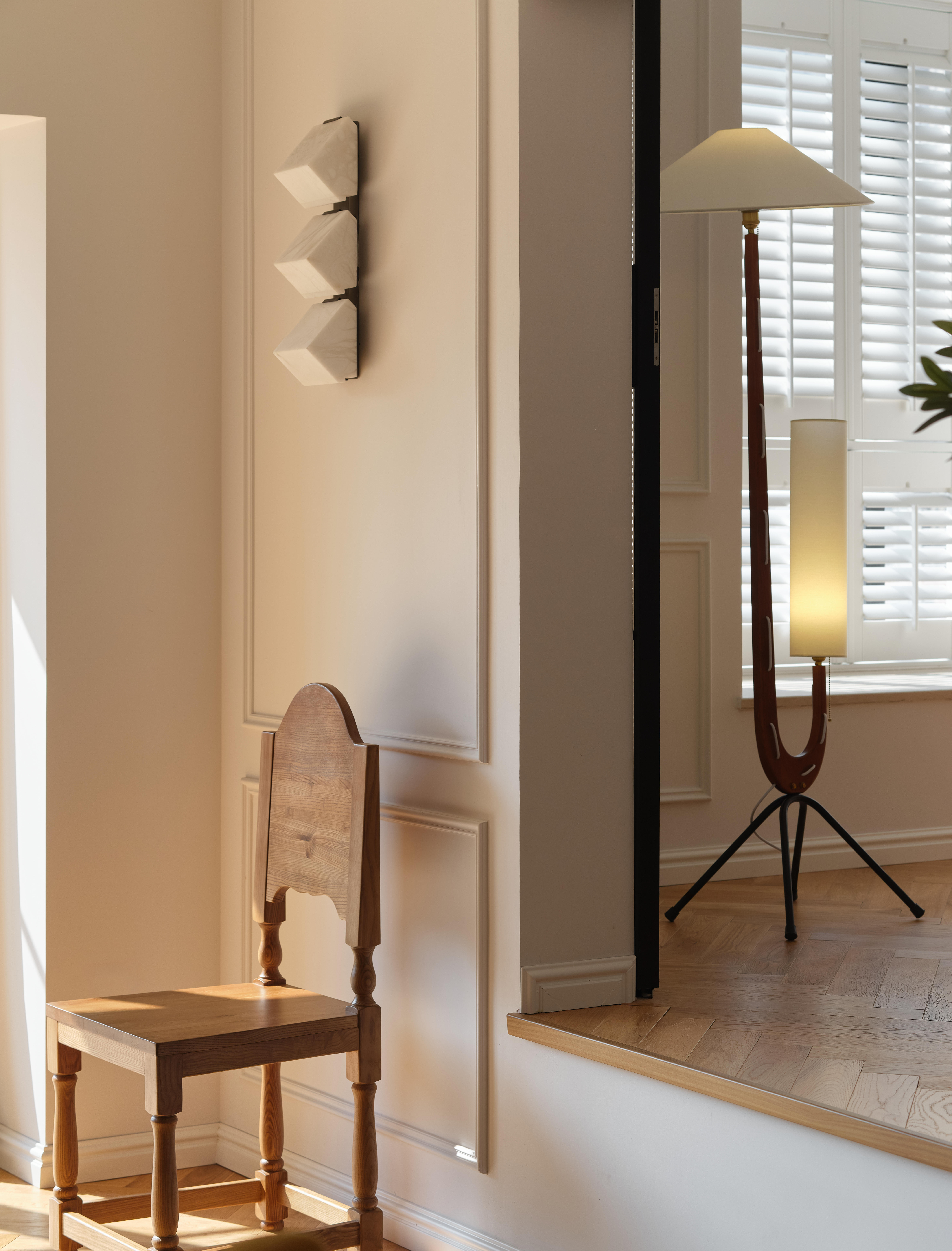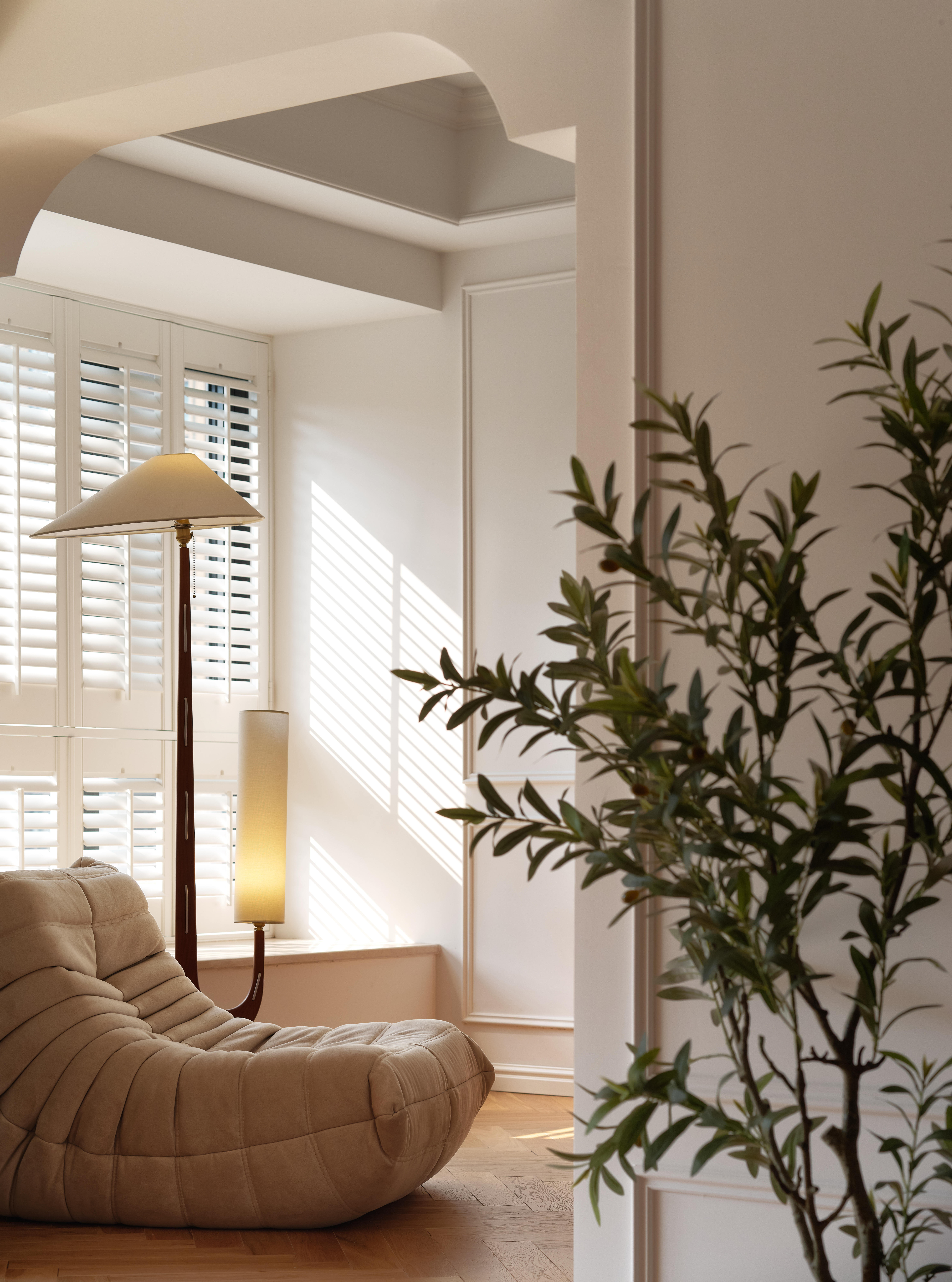 从客厅步入卧室需踏上三级台阶,这道看似不起眼的高差,被赋予了“跨越几代人”的情感寓意。台阶右侧是静谧的独立书房,尺度恰到好处;左侧则是兼具休闲与实用的多功能区——日常可作休闲厅,未来能成为孩子的玩耍天地,闭合房门后又可化作独立休息区,实现空间的多元利用。