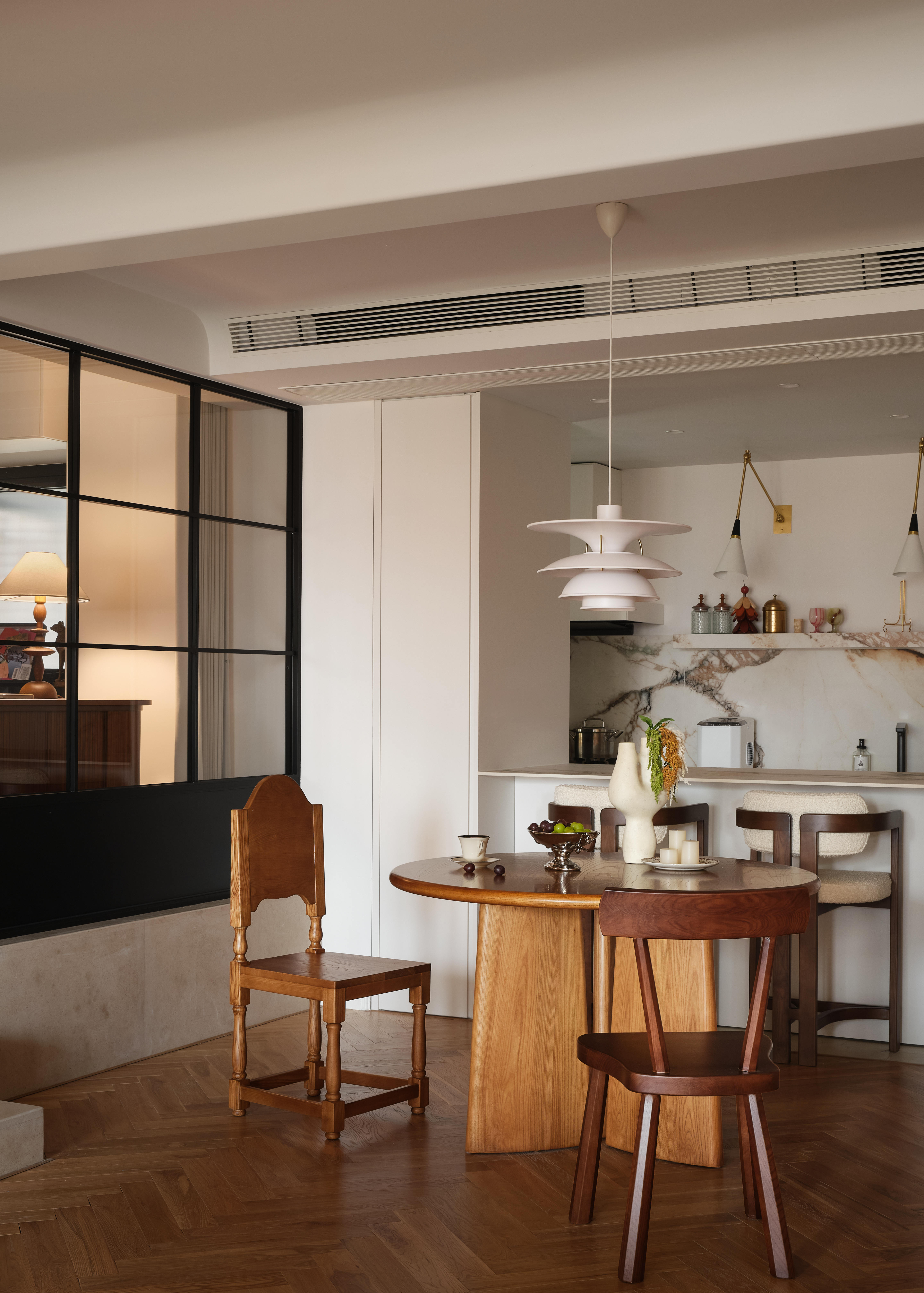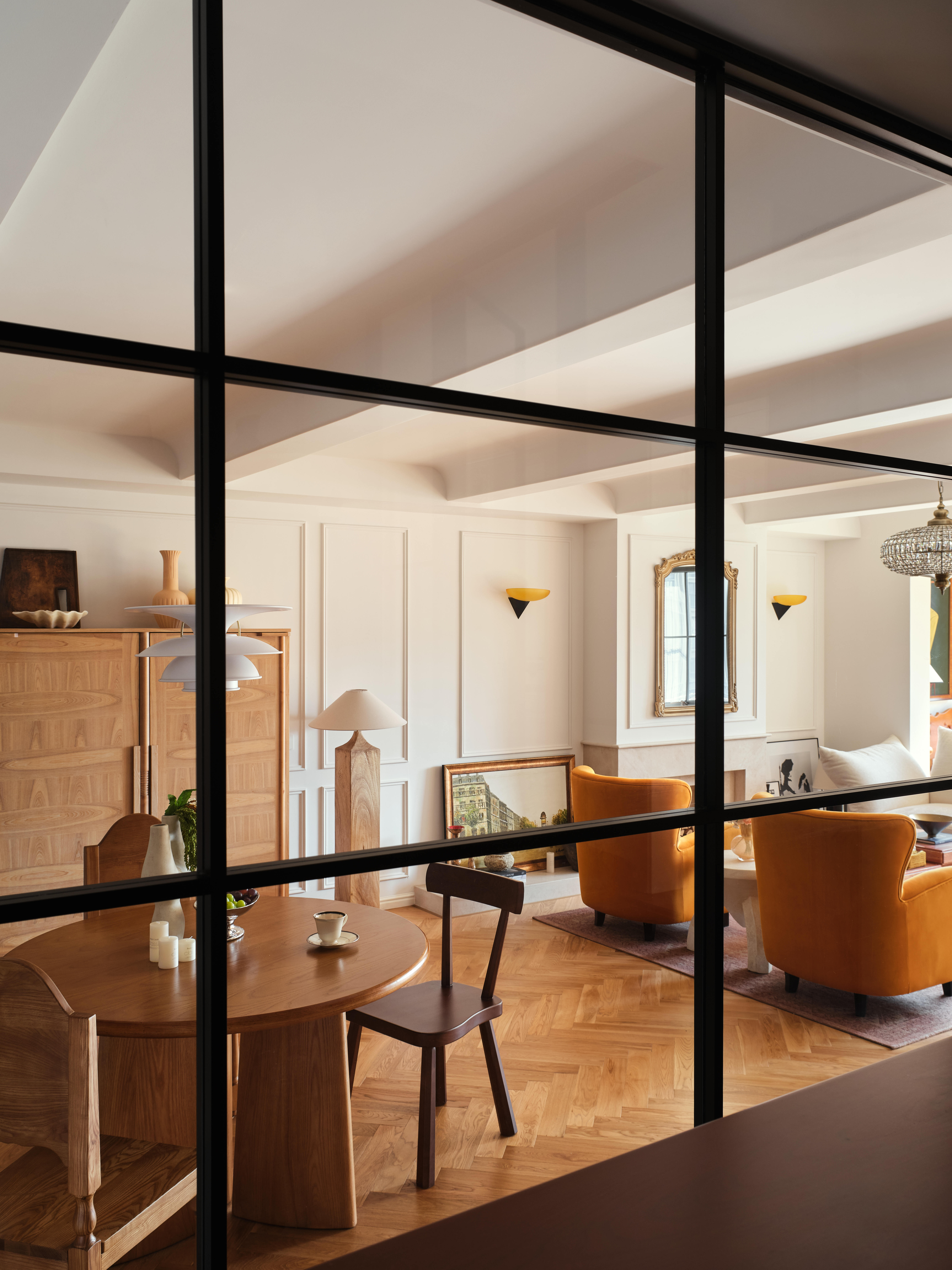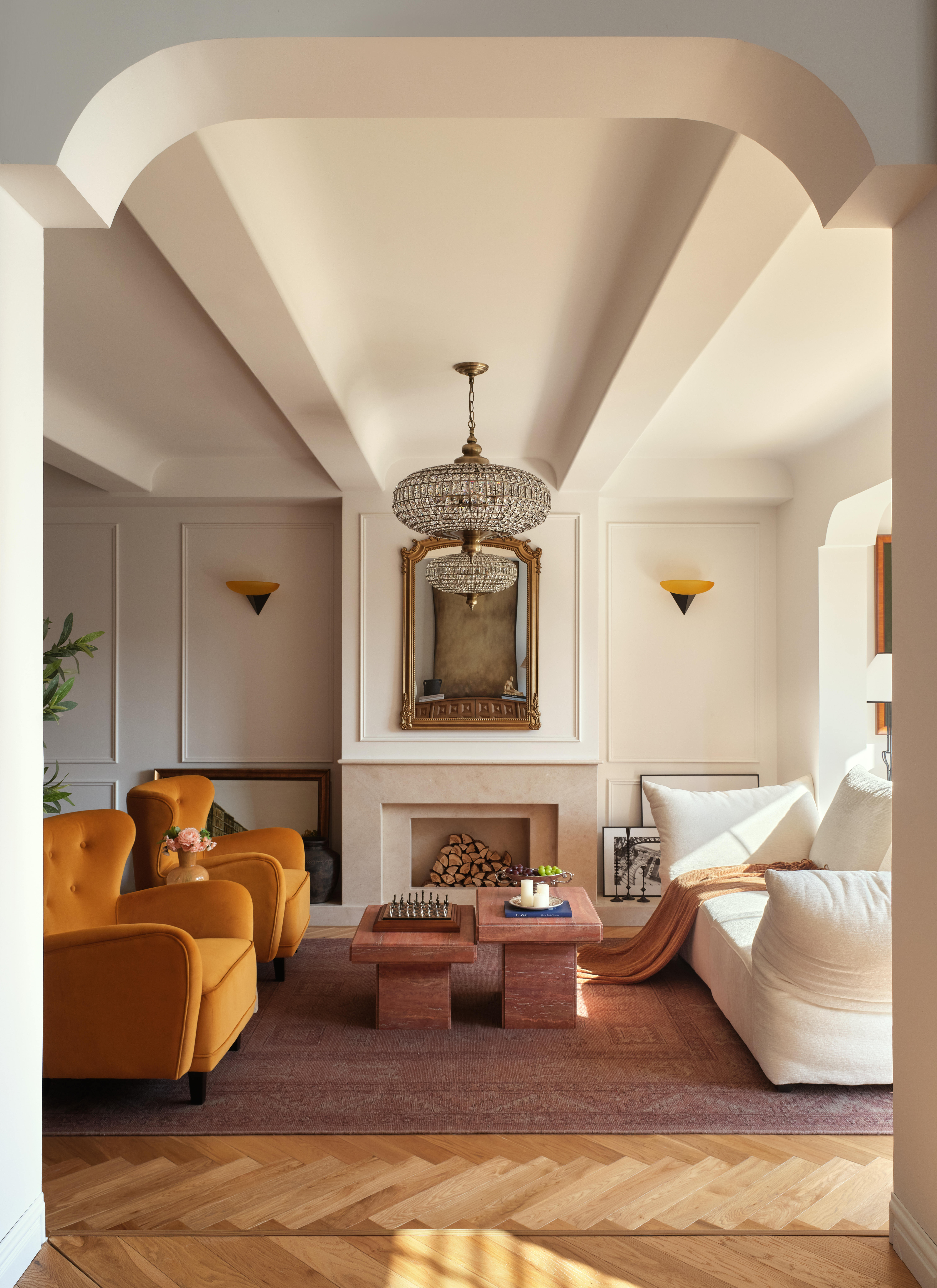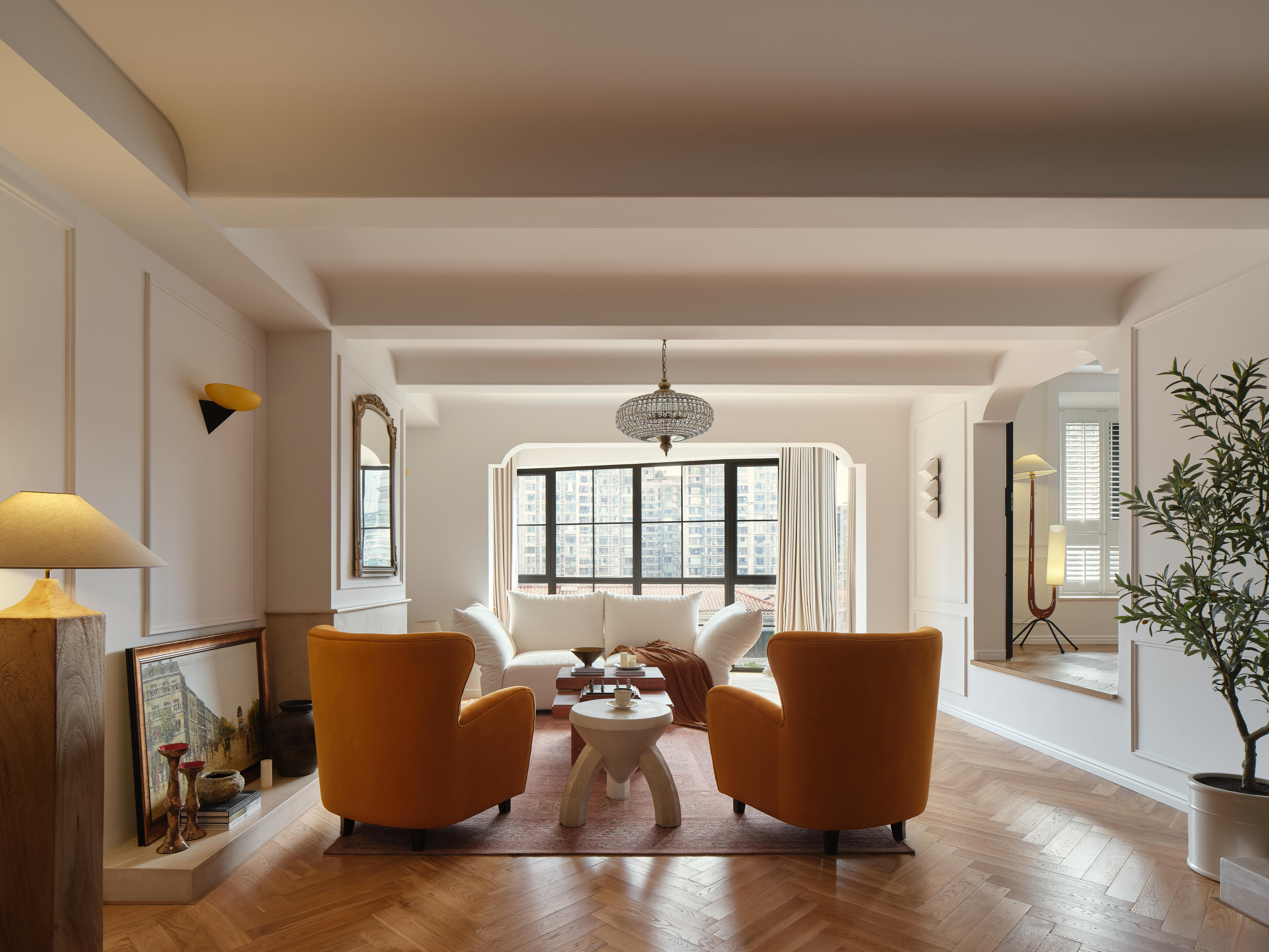 空间意境:客餐厨区域被彻底打通,打造开放式交互空间;除必要定制柜外,其余均采用活动家具,保留空间的灵活性。客厅以对坐式布局围合壁炉造型,暖橙色单人椅成为视觉焦点,与法式复古的柔美元素碰撞出温暖质感。