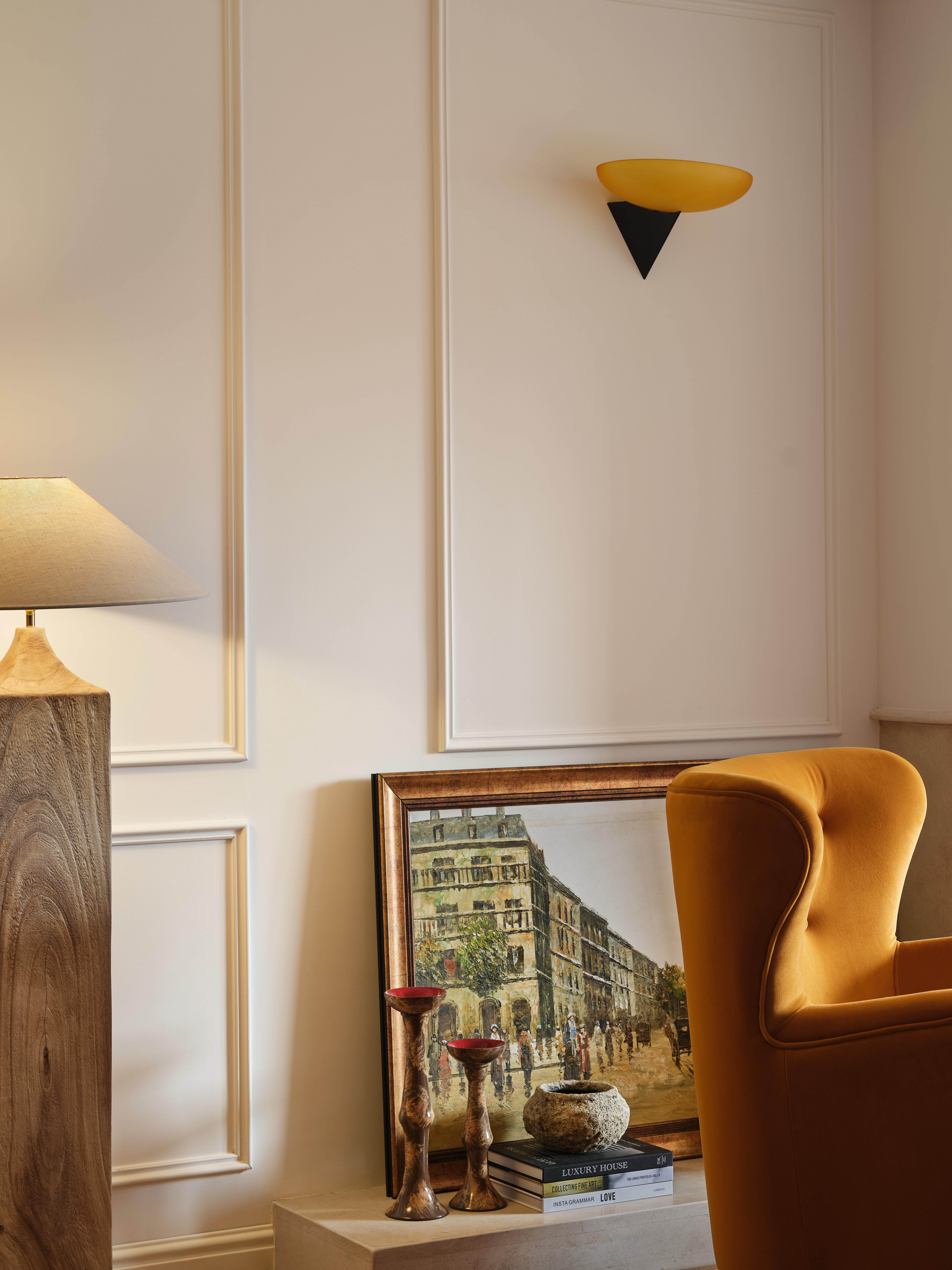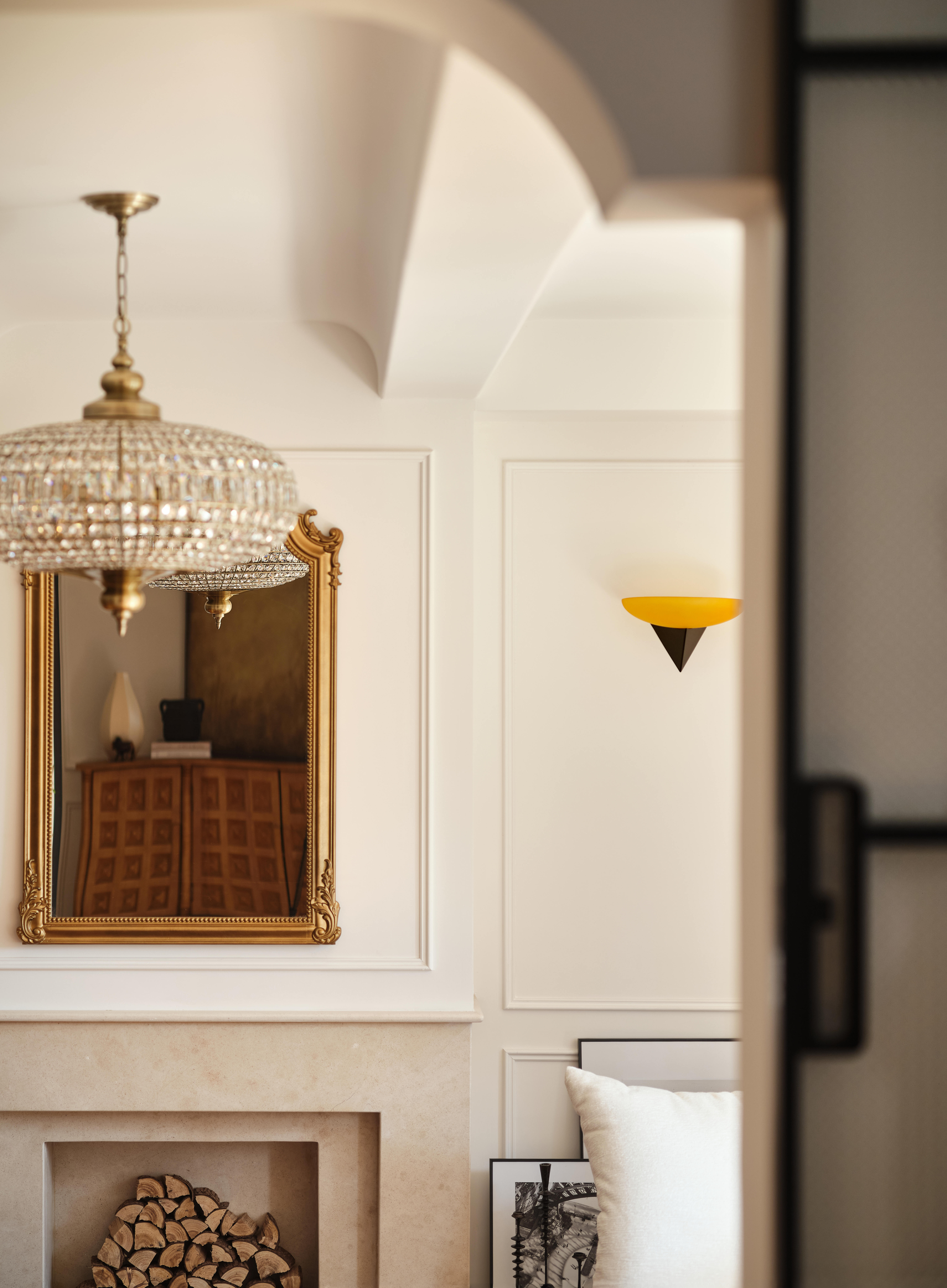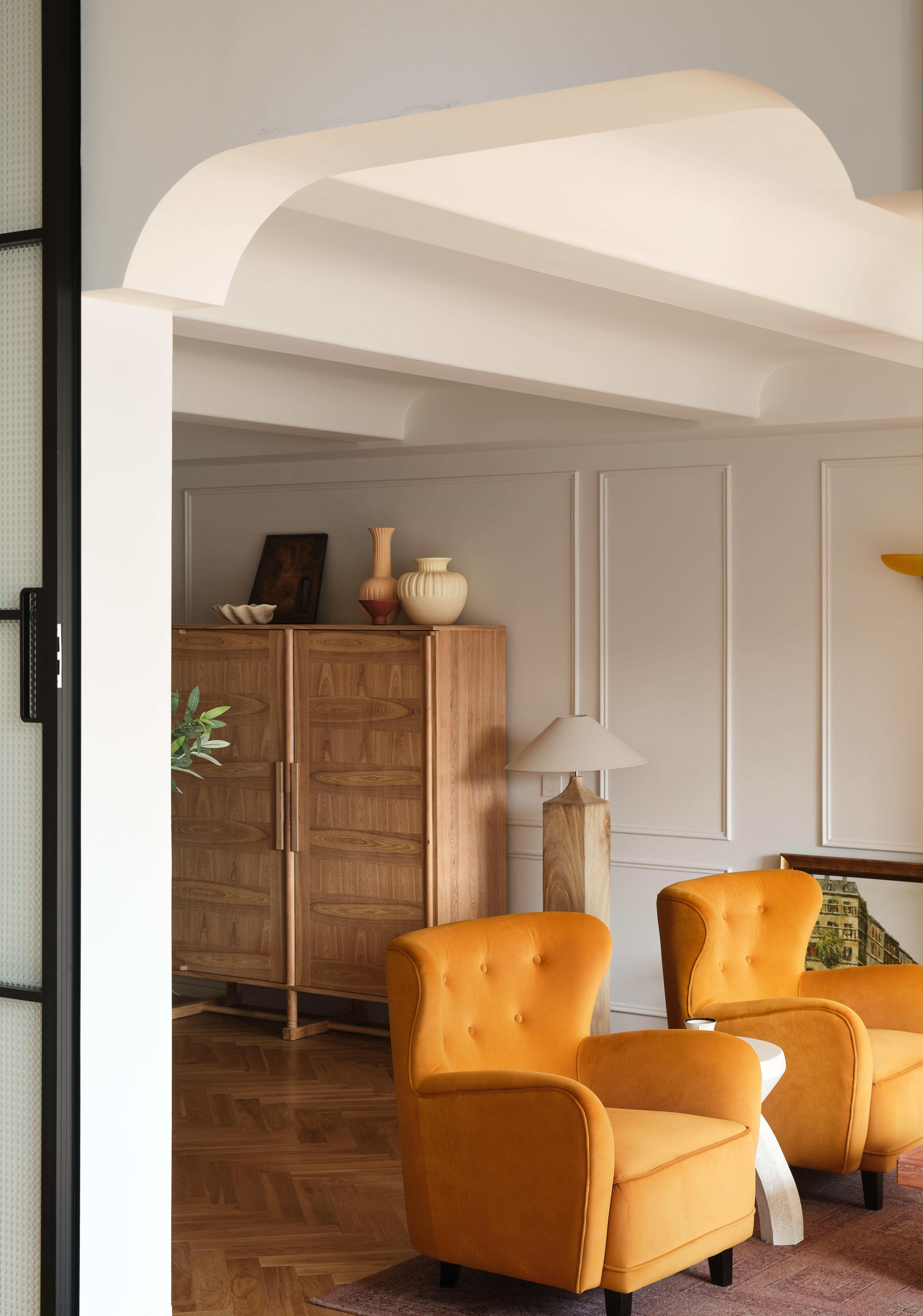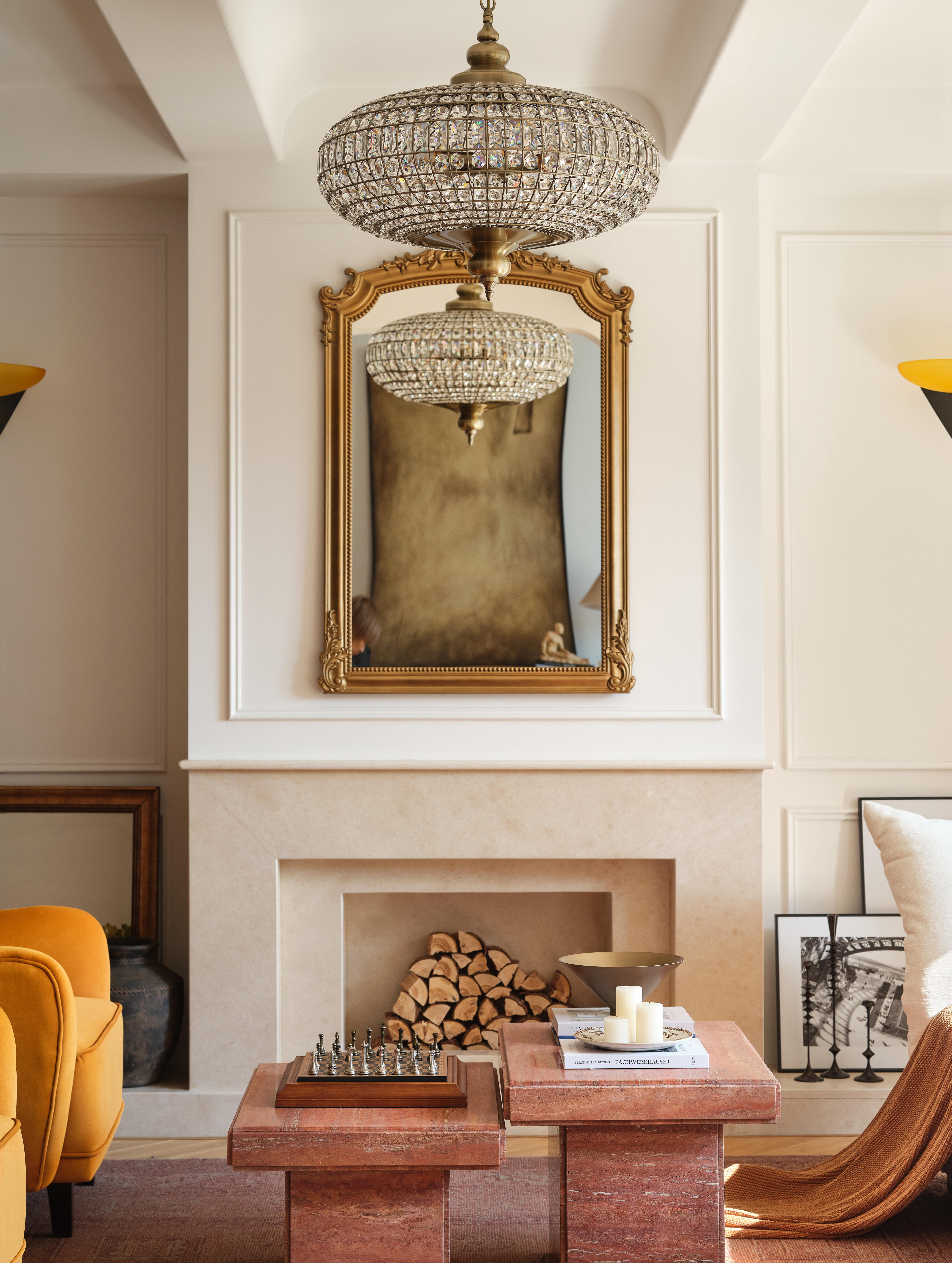空间意境:客餐厨区域被彻底打通,打造开放式交互空间;除必要定制柜外,其余均采用活动家具,保留空间的灵活性。客厅以对坐式布局围合壁炉造型,暖橙色单人椅成为视觉焦点,与法式复古的柔美元素碰撞出温暖质感。