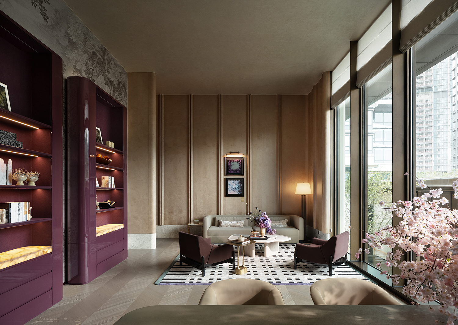 从开阔到私密,空间在尺度与序列中缓缓展开,既为自在聚合提供自然场域,也为低声私语保留宁静角落。每一次相遇都被赋予仪式感,交流在自在与秩序中自然发生。绀紫的色调成为空间的序章,以诗与艺术之语,唤醒每一处空间的生机,成为点亮情绪的火种,又恰到好处的归于克制与宁静。浪漫与优雅,作为东方与西方都市文化的代表,是现代性在不同文明土壤中结出的果实,也绽放在我们持续探索的,不确定的当代生活缩影中。 -