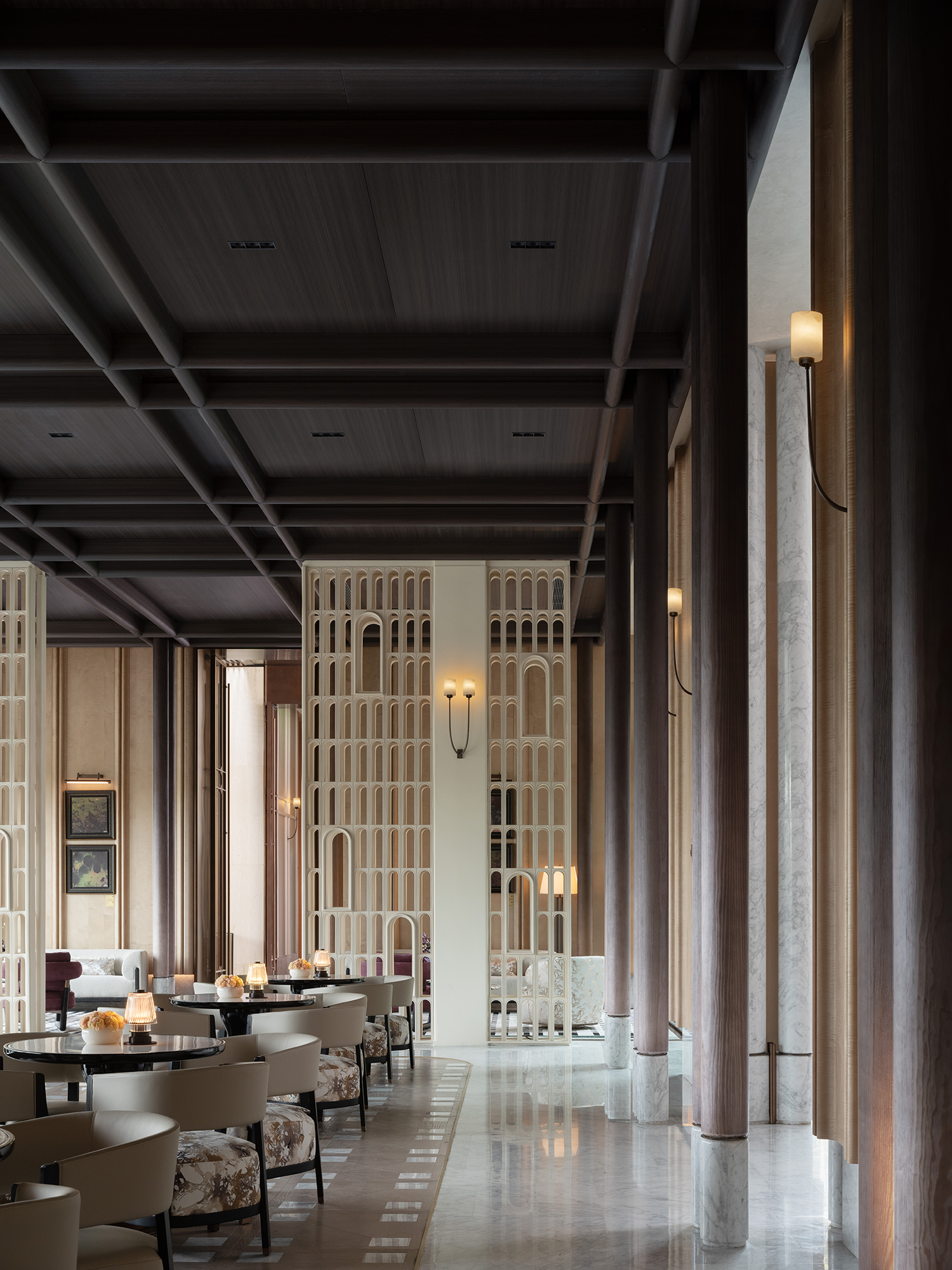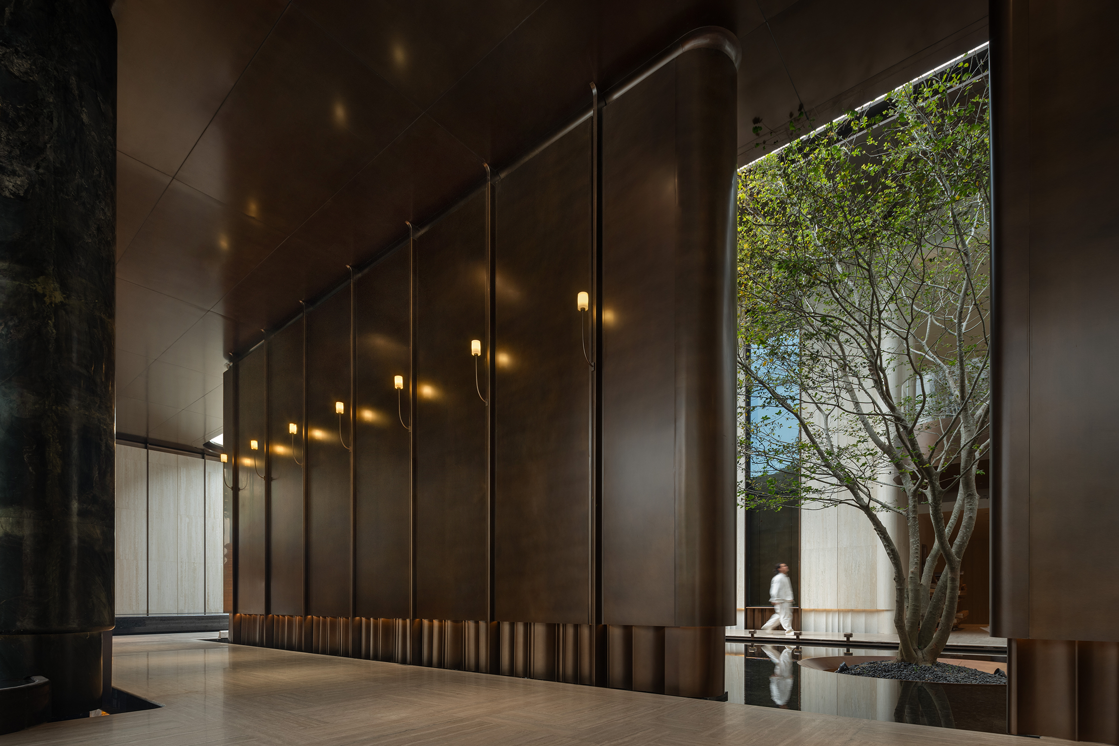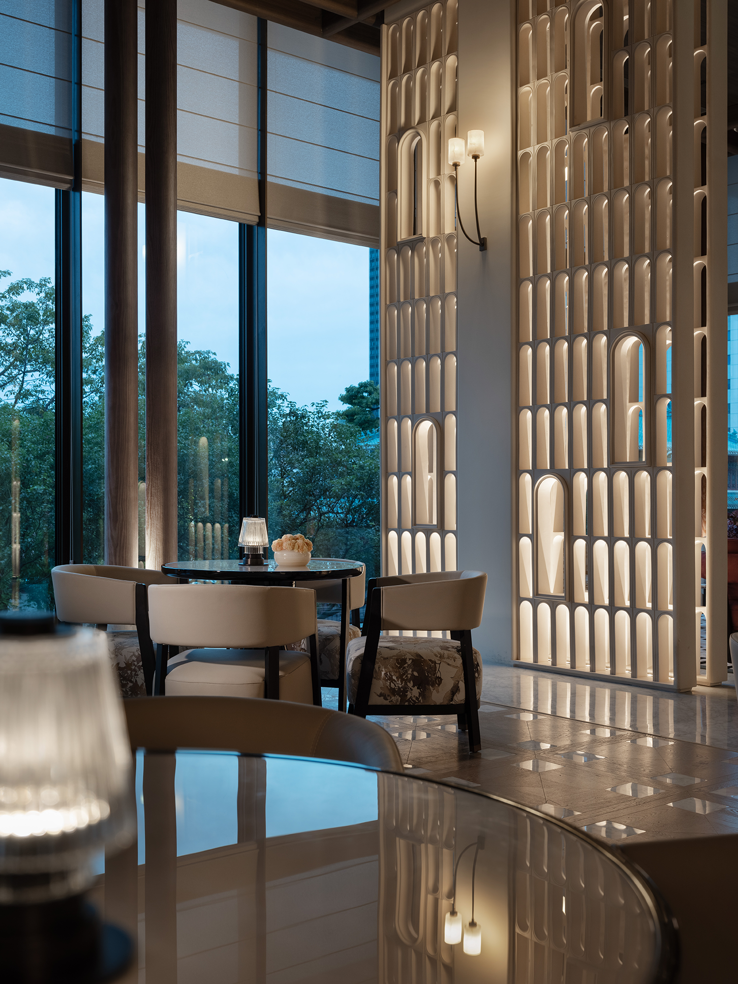 渐变木立柱与深色木造天花,勾勒一座现代的室内亭院。窗外随风摇曳的树影,为都市空间添上自然的润笔。