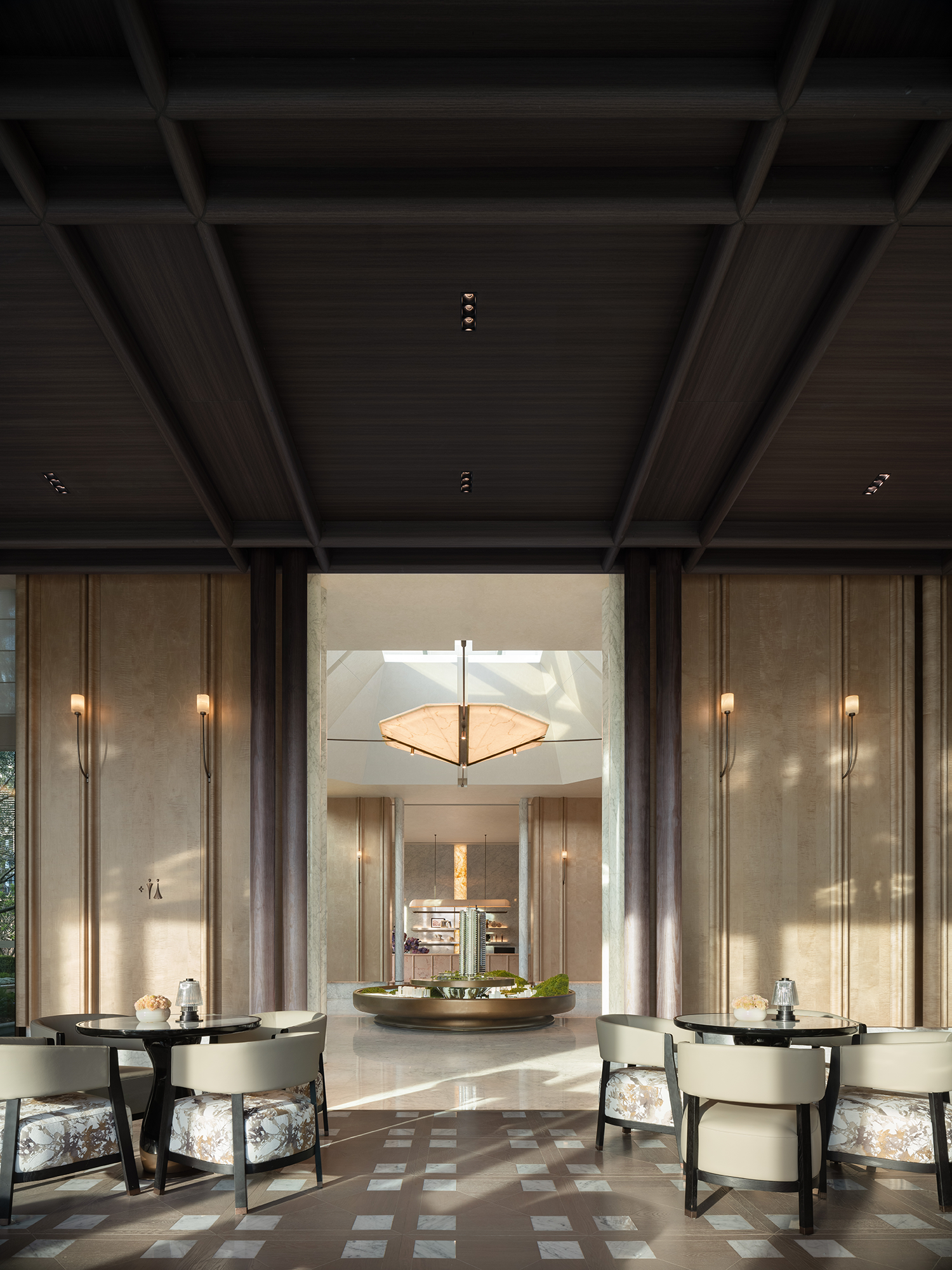 空间意境:流水庭院、渐展的树影,与暗调的仪式连廊,次第展开,使空间在不经意间,铺陈一段即将映入眼帘的风景篇章。人们身处其中,自然不再作为被观看的对象,而成为感知的一部分。天光引入庭景,水声低回,风影微漾,树梢流动着疏影......空间的节奏由此放慢,自然向内聚合,时间在此停留。设计以东方的尺度、序列与留白,为生活预留淡然而恬静的感知方式。行走、停留、相遇与独处,在连续的空间关系与自然介入中徐徐展开,形成一种内在自洽的生活秩序。
