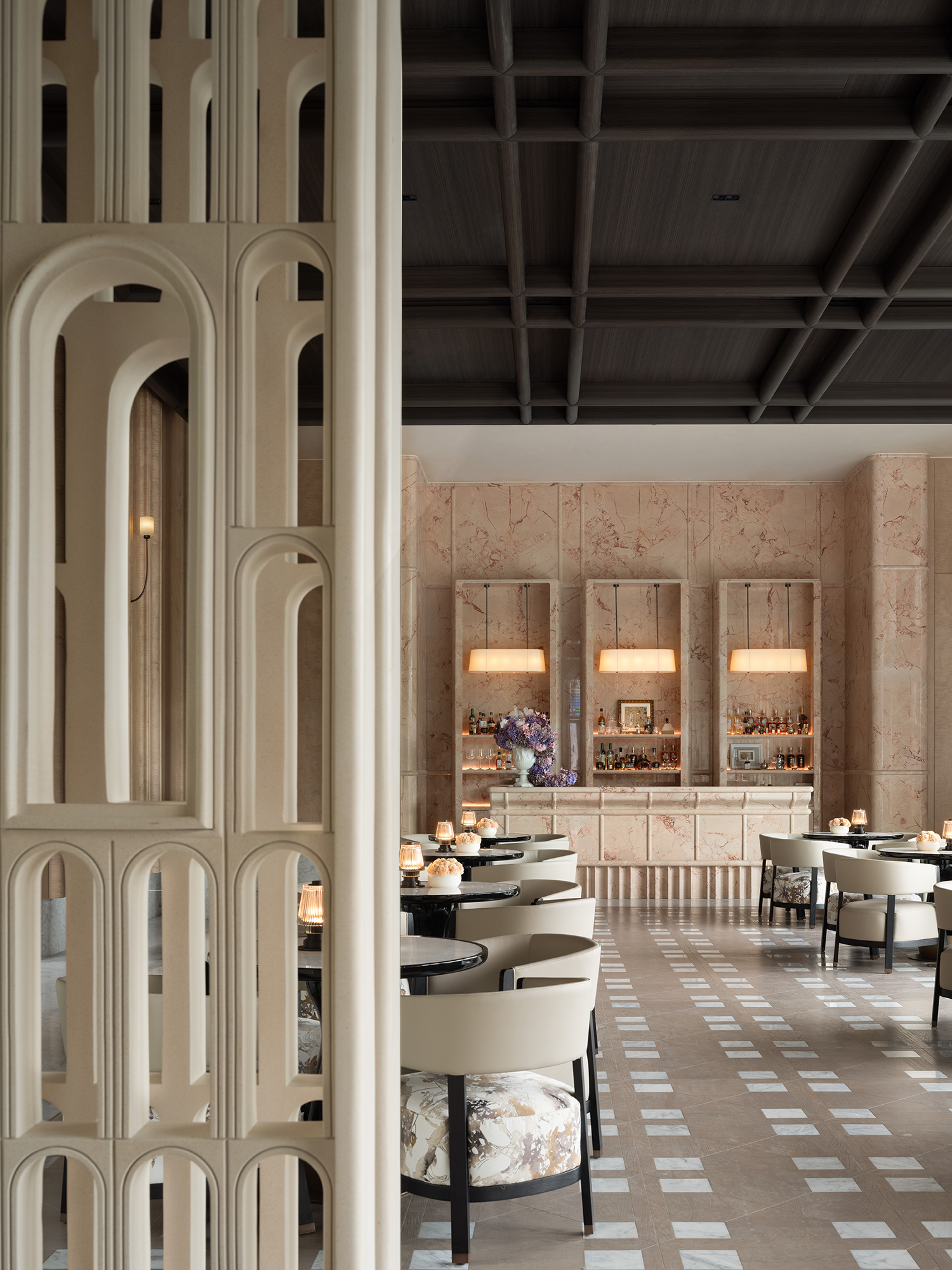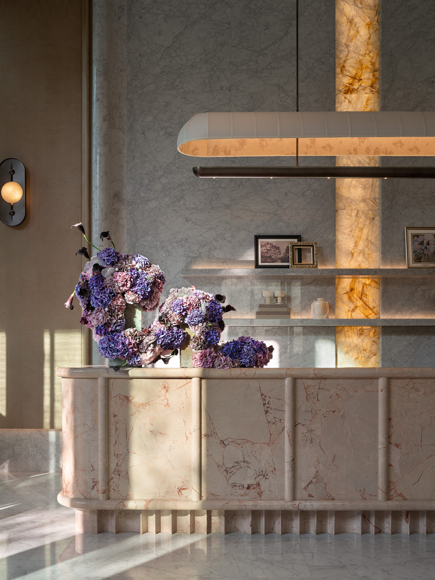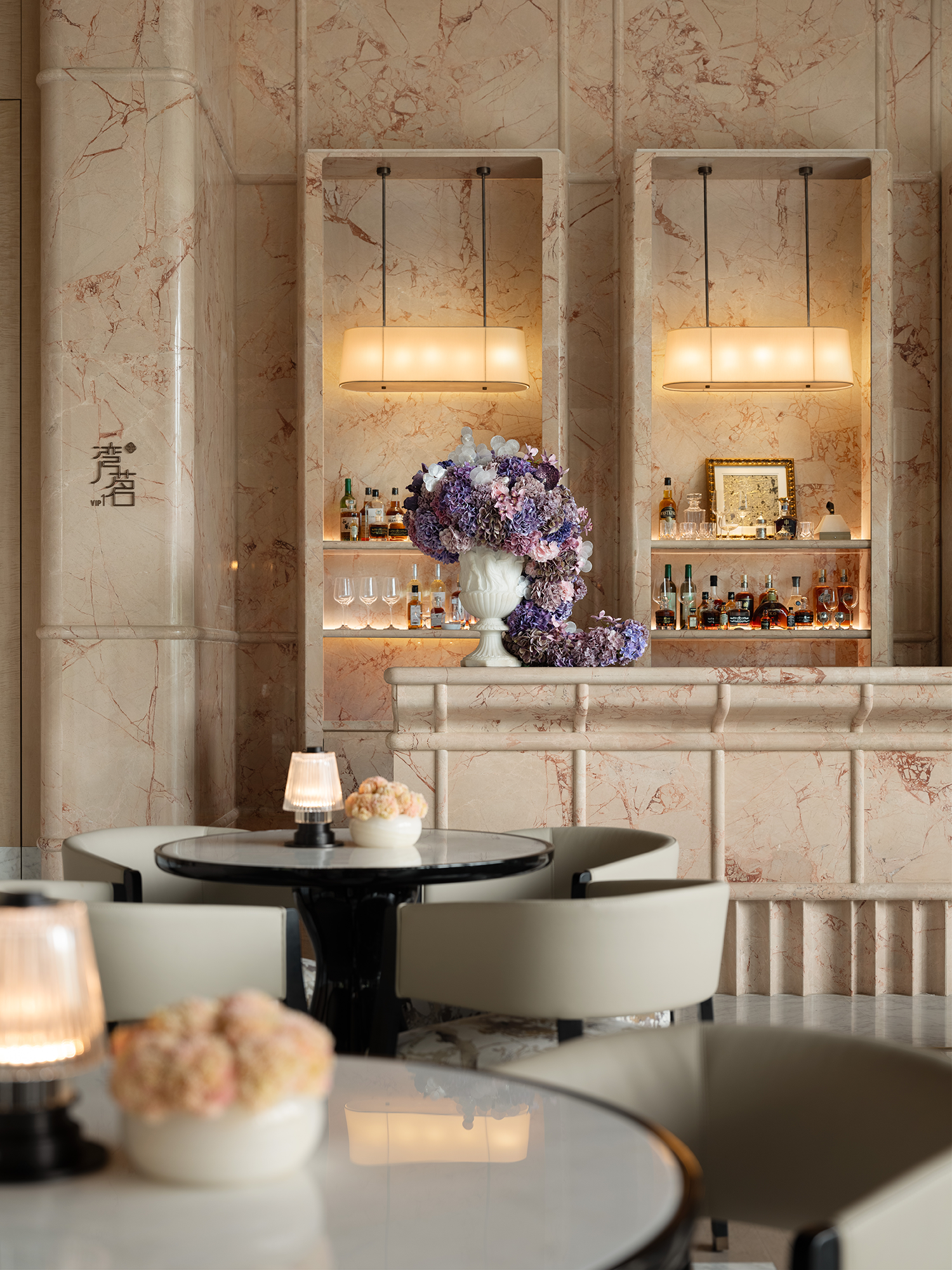 玫瑰粉色的吧台,整石雕铸,成为空间的艺术驻点,弥散着香颂的浪漫与摩登的优雅,赋予空间新的灵感。在这里,生活是一场与自我、自然、艺术的深情对话。光明,期待与喜悦,最终汇流于心田。