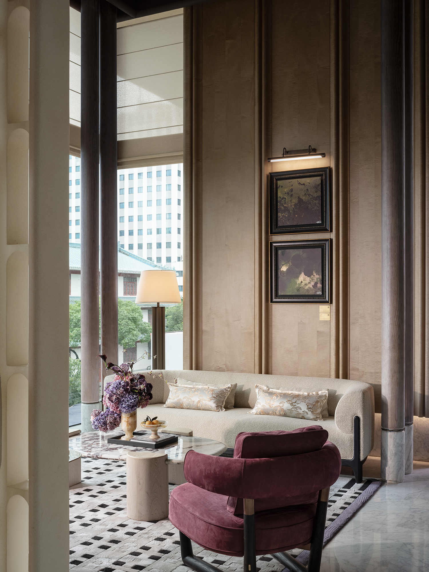 由此,自然、宁静、优雅的生活方式,让空间成为感知与停顿的场域。温和的灯光、柔软的地毯,抬头可见的幽篁瞬息为诗性的疏影,成为相映成趣的余想。