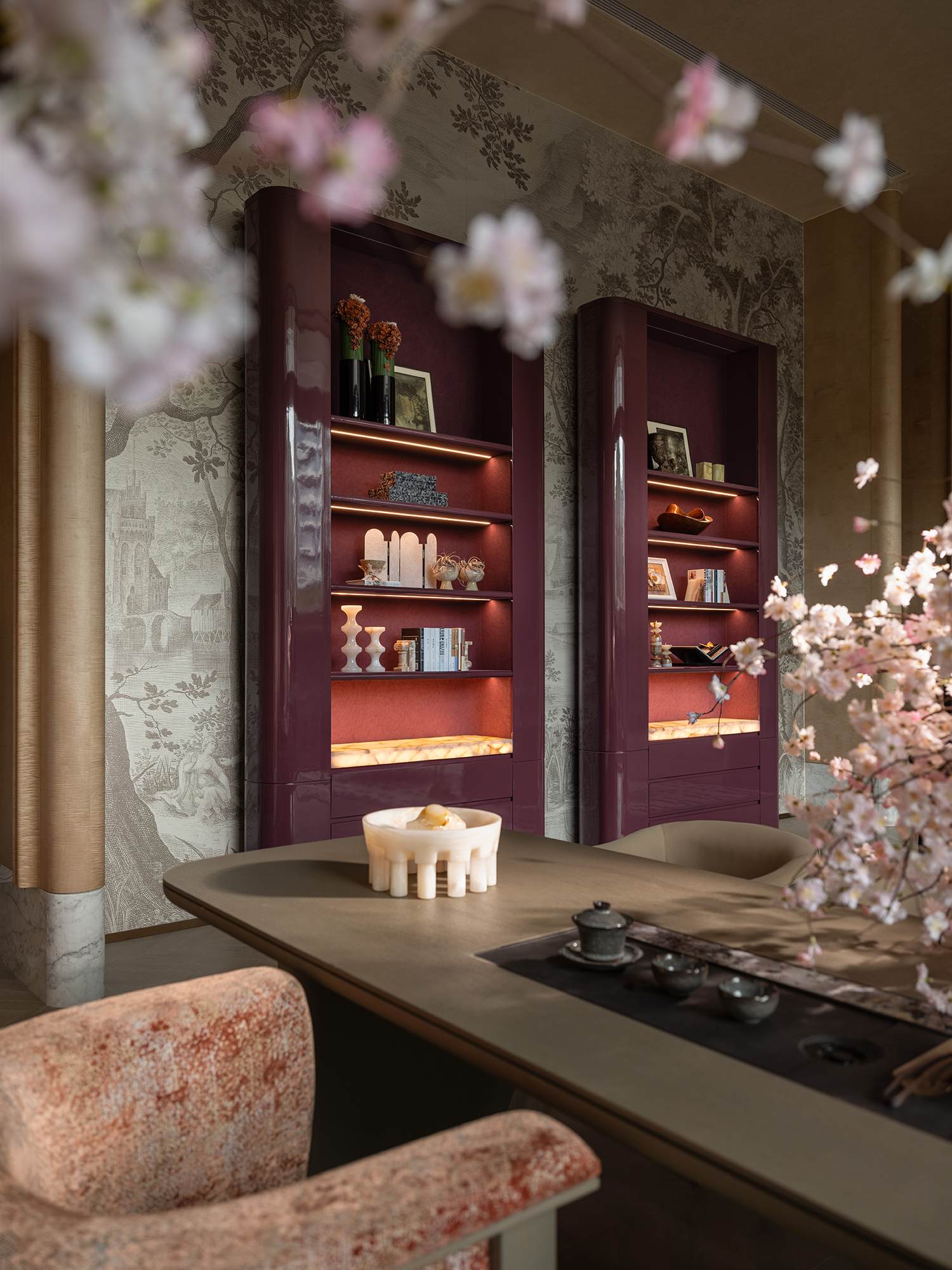 绀紫的色调成为空间的序章,以诗与艺术之语,唤醒每一处空间的生机,成为点亮情绪的火种,又恰到好处的归于克制与宁静。