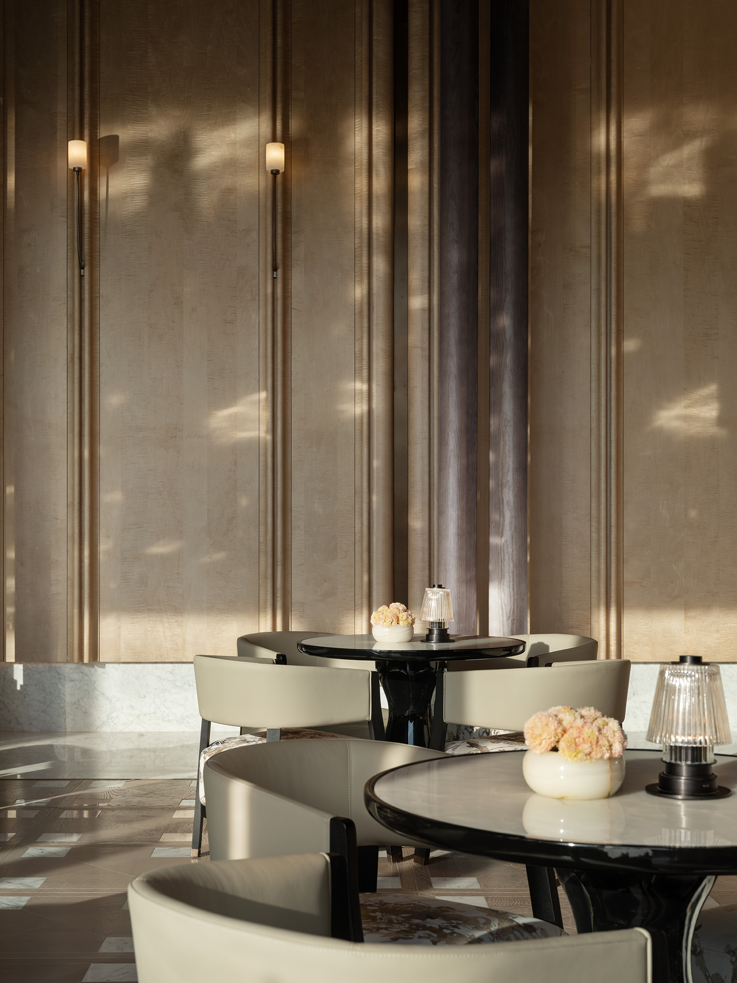 过厅以艺术木饰面为幕,地面镶嵌意大利米白石材。奢石的百道微弧贯穿每一细节,柔化着视线的延展。人们一步一履,沉浸在精湛工艺与浪漫优雅交织的韵律之中。 -
