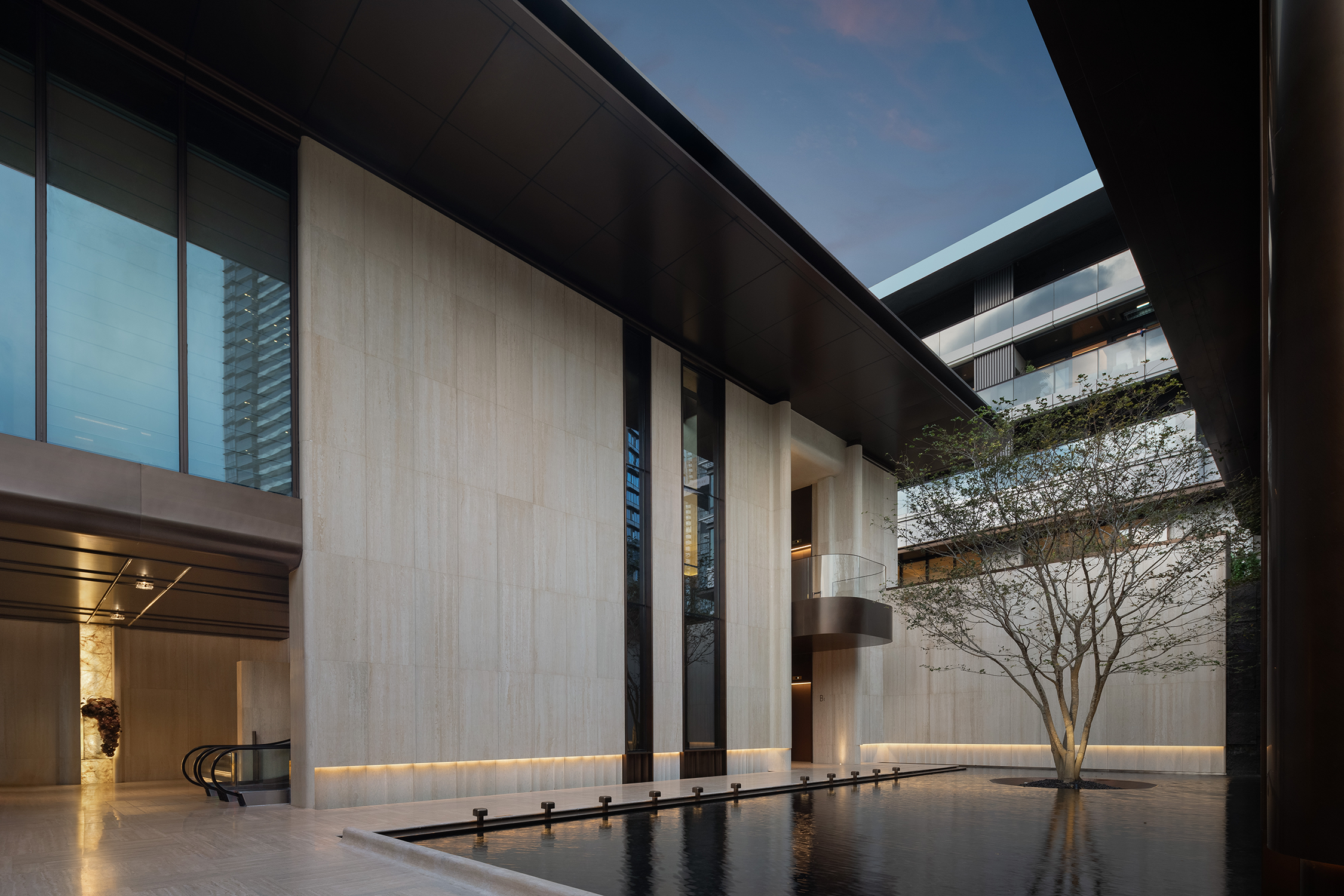 山海、港湾与城市在此叠合,构成多重并置的城市结构。产业创新的动能、高端居住的尺度,与山海生态的自然秩序彼此共存,于自然纵深与从容节奏之中,生长出一处隐于城市进程的时间桃源。作为诗意空间设计首个建筑、室内、景观一体统筹的项目,空间的生成不再以单一界面为起点,而是从人的感知与行进路径出发,构建由外而内、由远及近的连续体验。