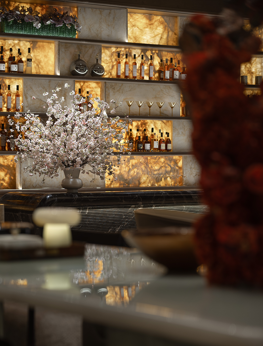 清玉桌几、云石灯盏,与发光石吧台隔架,将空间围合成一个浪漫的、诗意的室内亭院。
