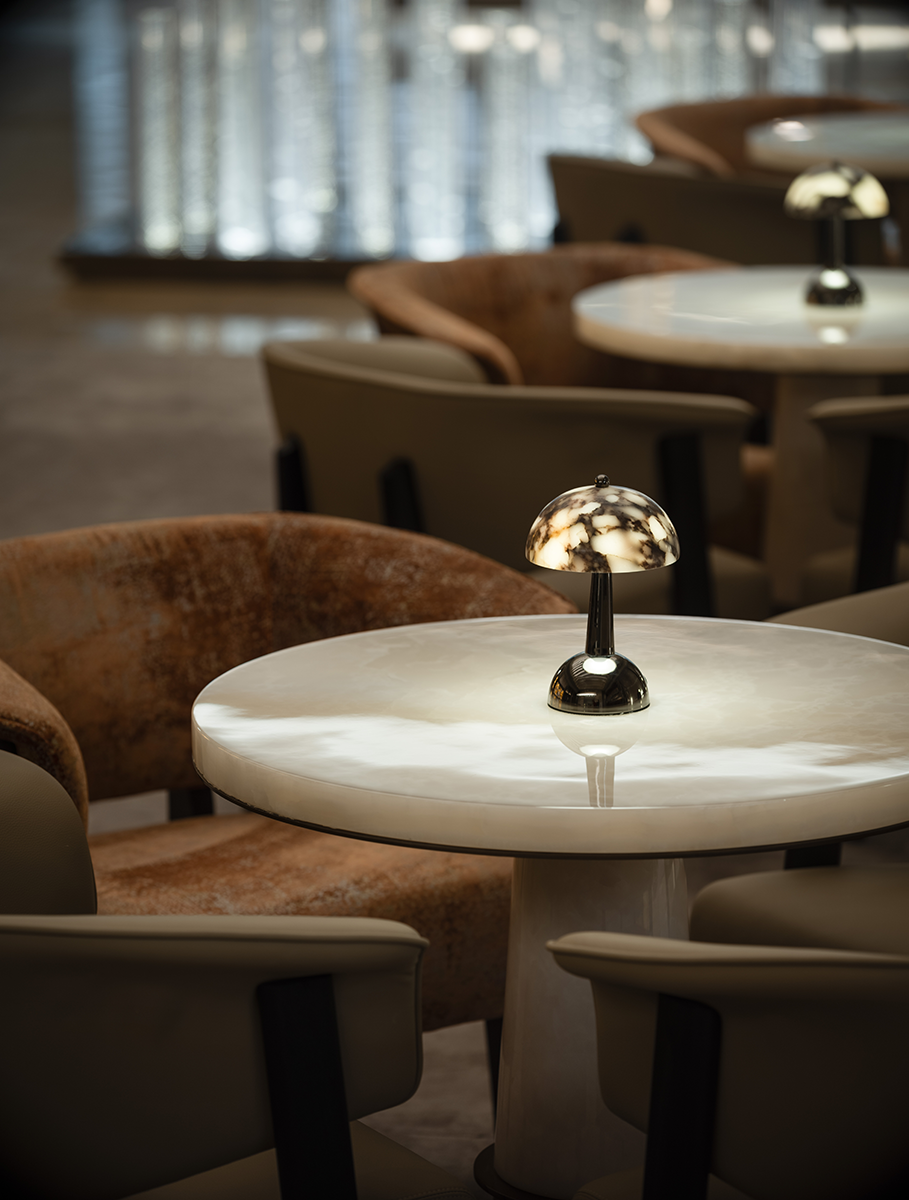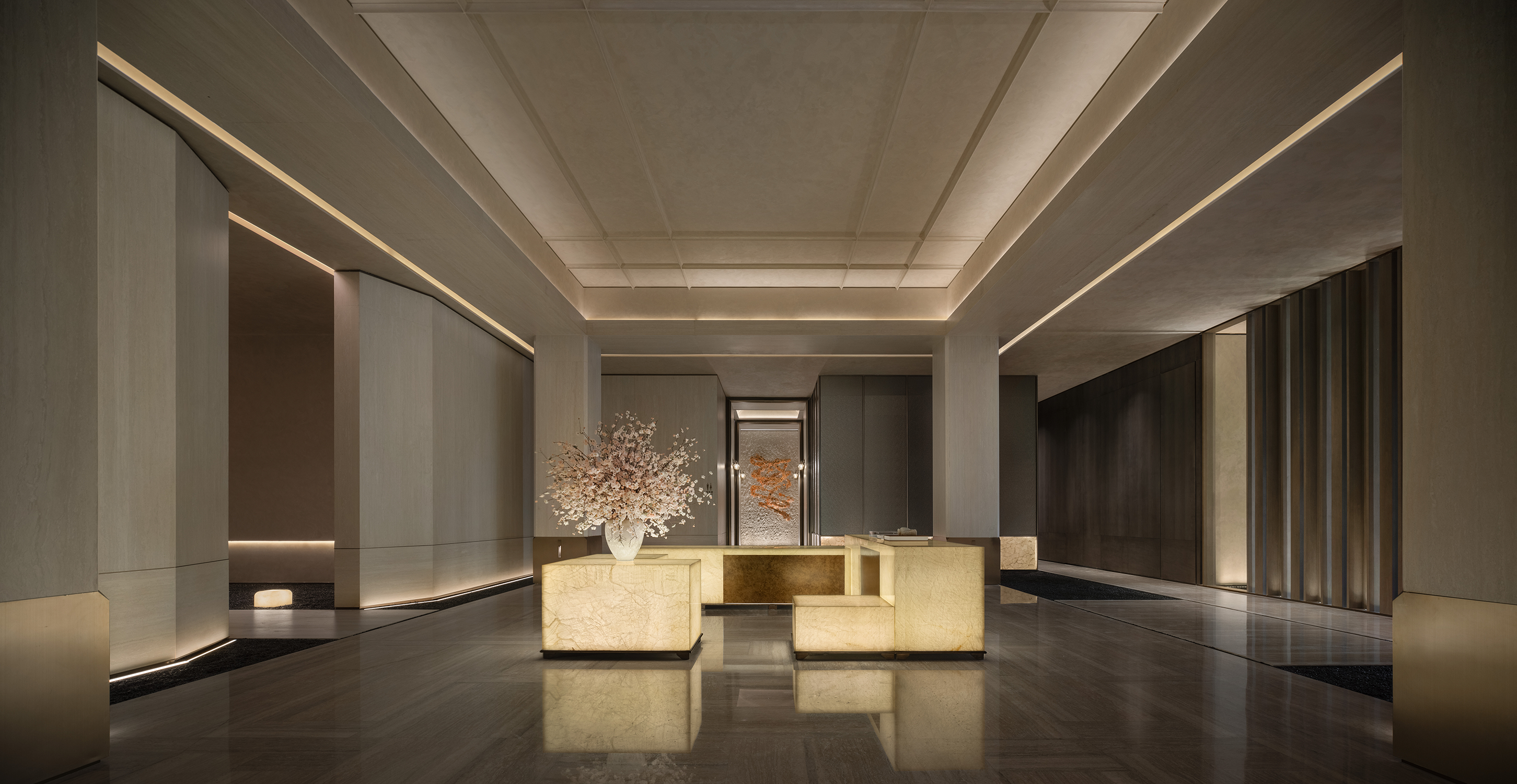 徜徉于廊柱之间,玉石与金属融合着灯下光影。东方的婉约,与稀缺的归属感,如约而至,共鸣着设计带来的这场独特浪漫。