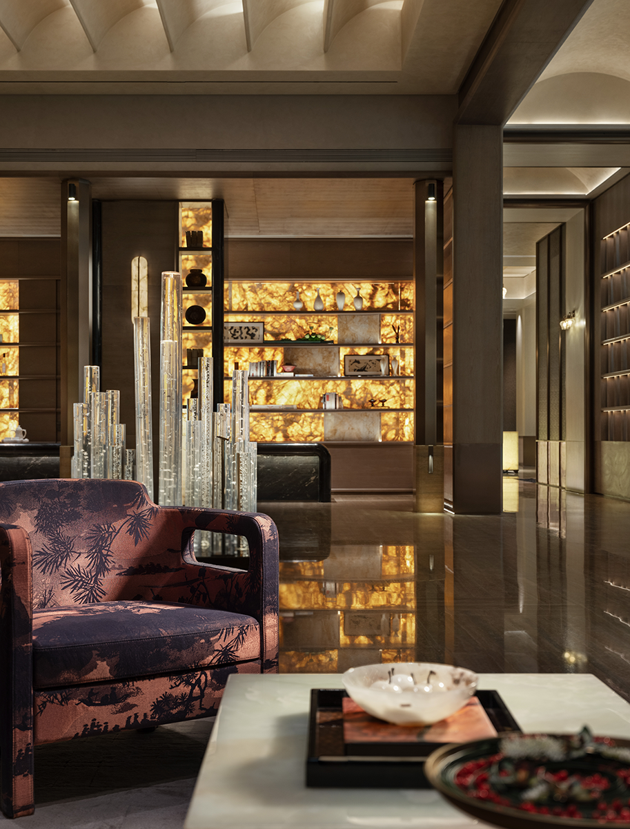 发光玉石、温婉灯光、艺术典籍,将过道空间布置成别致雅趣的艺术别院。于此,人,景,界面,顺性而萌,乐由中出。