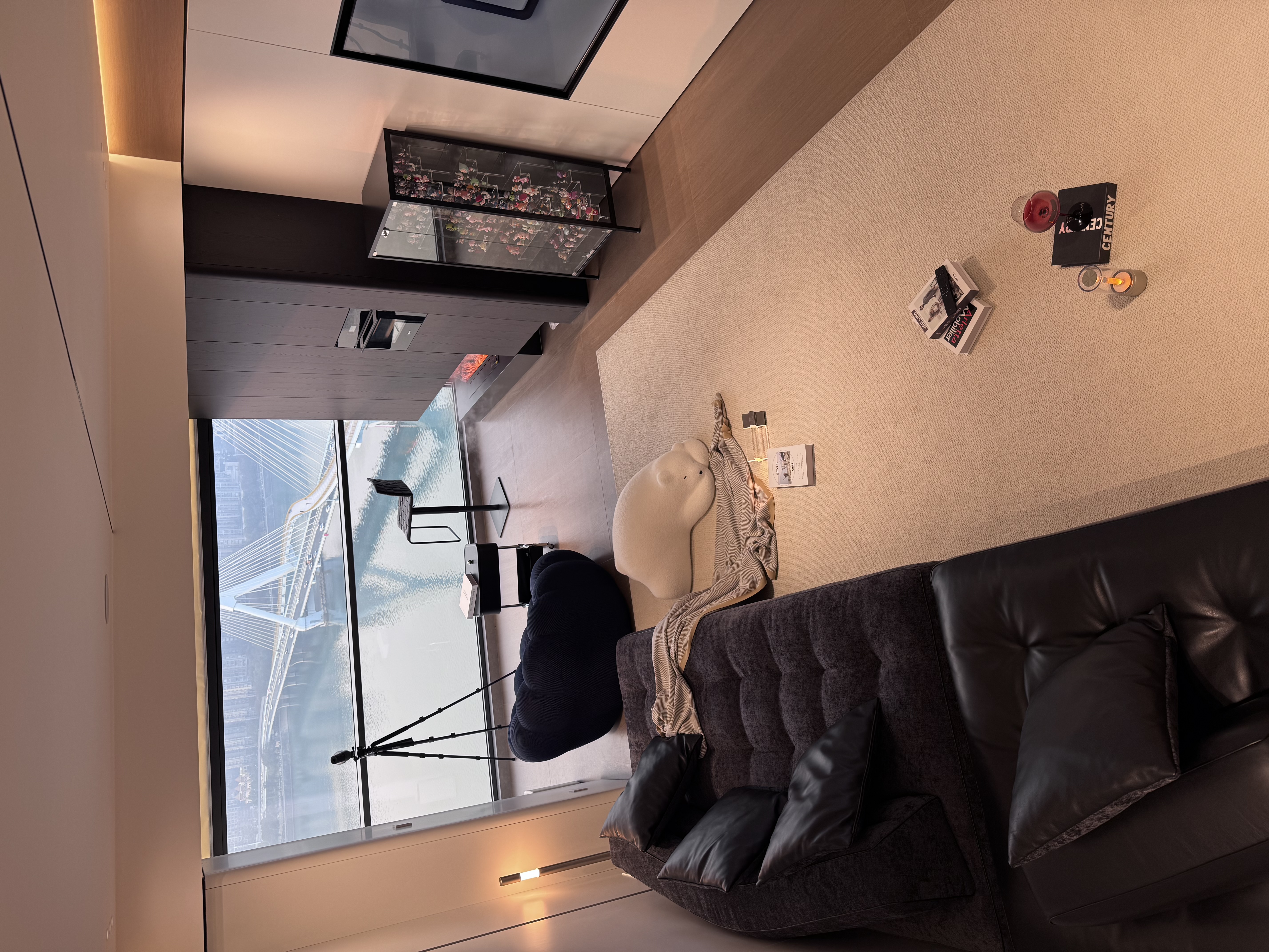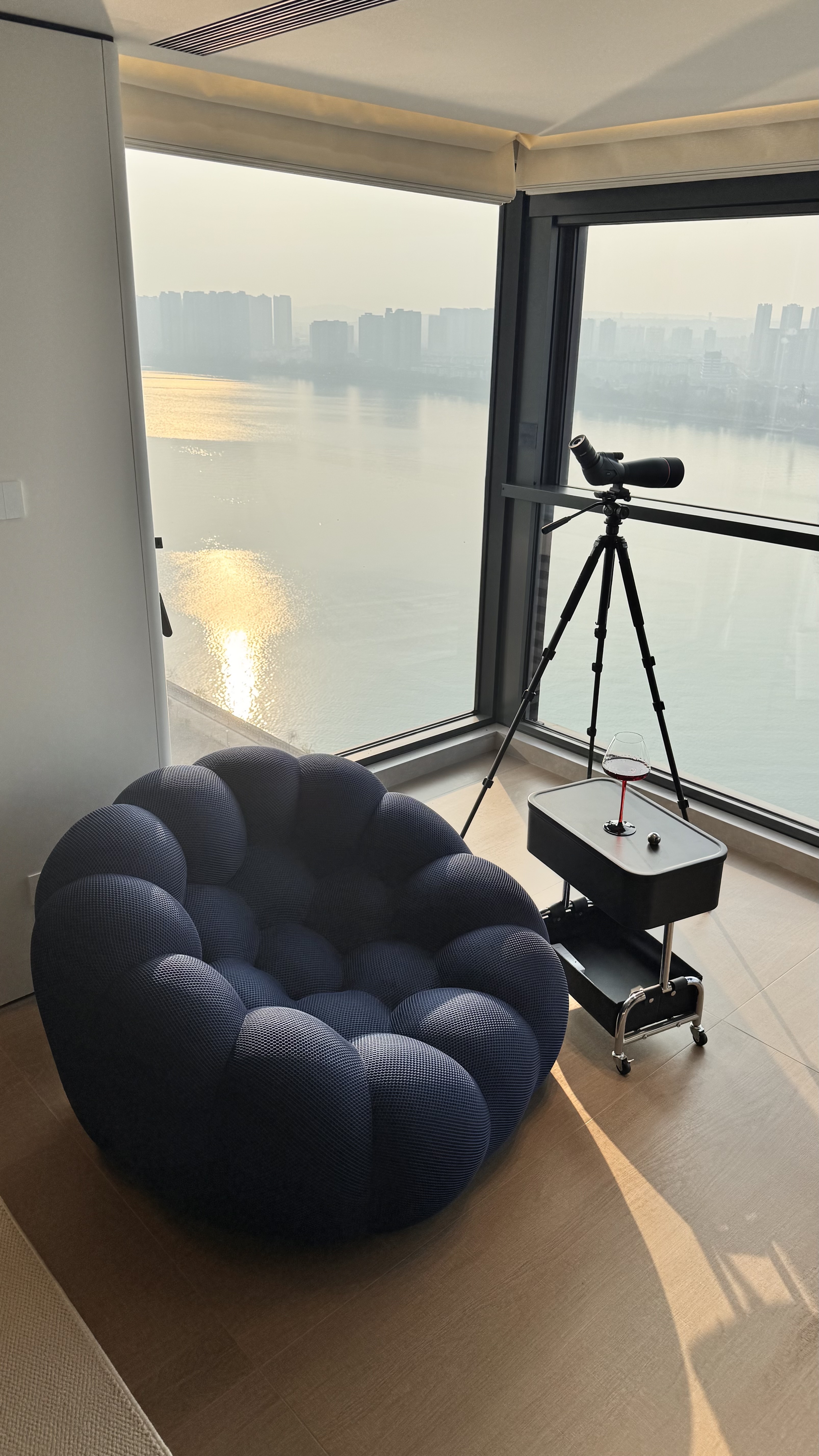 空间布局:摒弃传统“单一观景位”设计,通过全景落地玻璃幕墙贯穿客厅、休闲区、餐厨区,打造洄游式观景动线,让用户在不同功能区都能获得沉浸式江景体验,实现“空间无死角观江”。