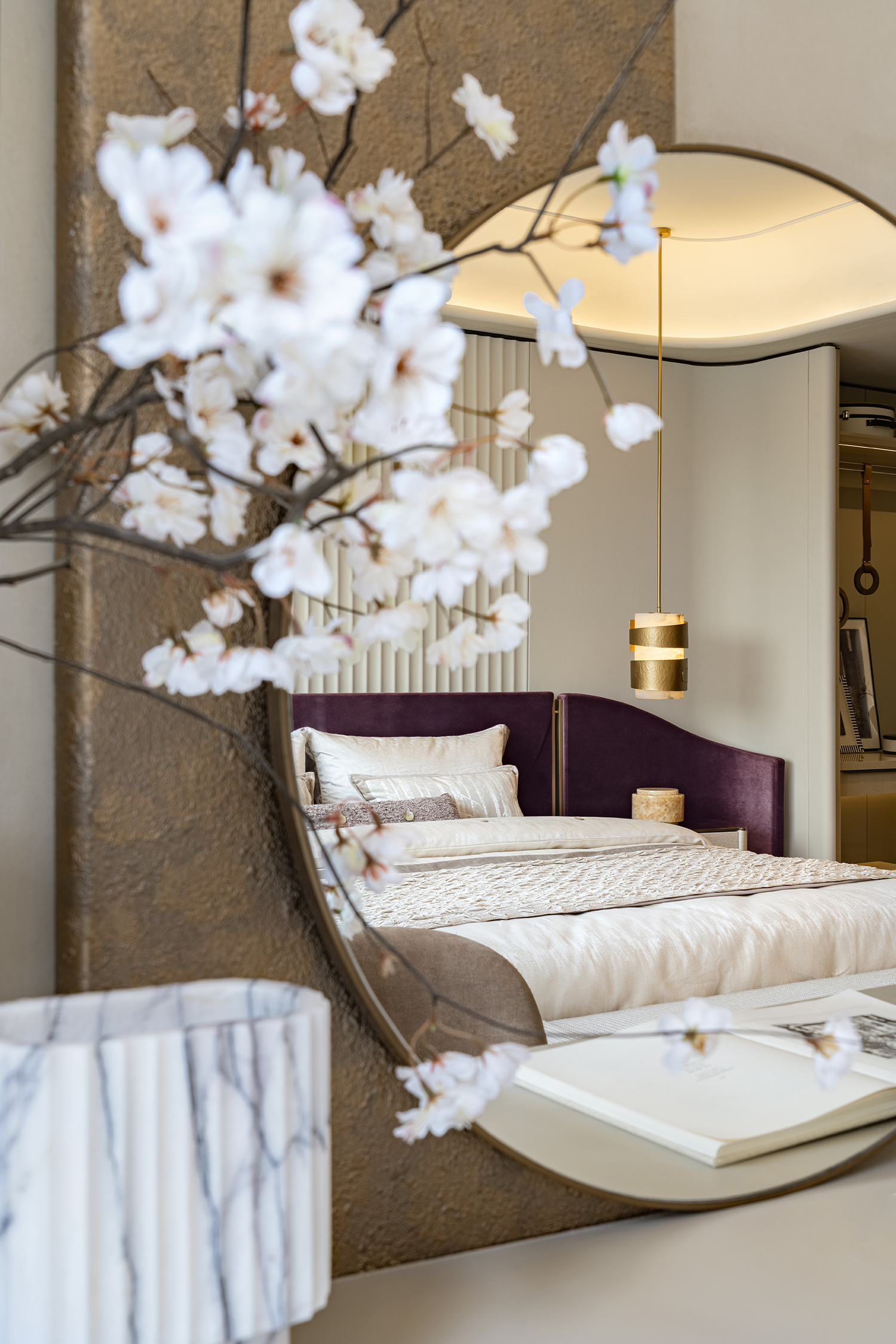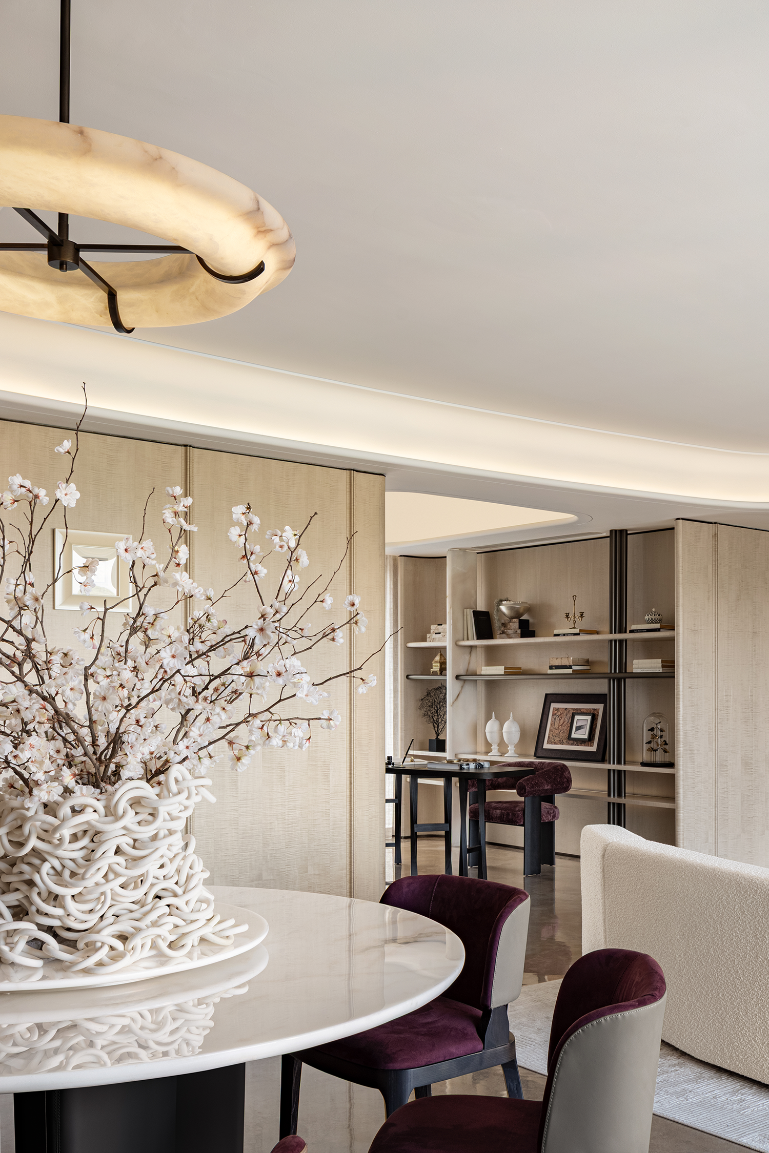 空间以暖米白为素雅底色,缀以绀紫为精魂。东方洗练线条的家具,呵护着温文尔雅的基调。如同历经岁月,细细雕琢的信物,打磨着款型与质感的同时,重塑着大宅文雅的底蕴。