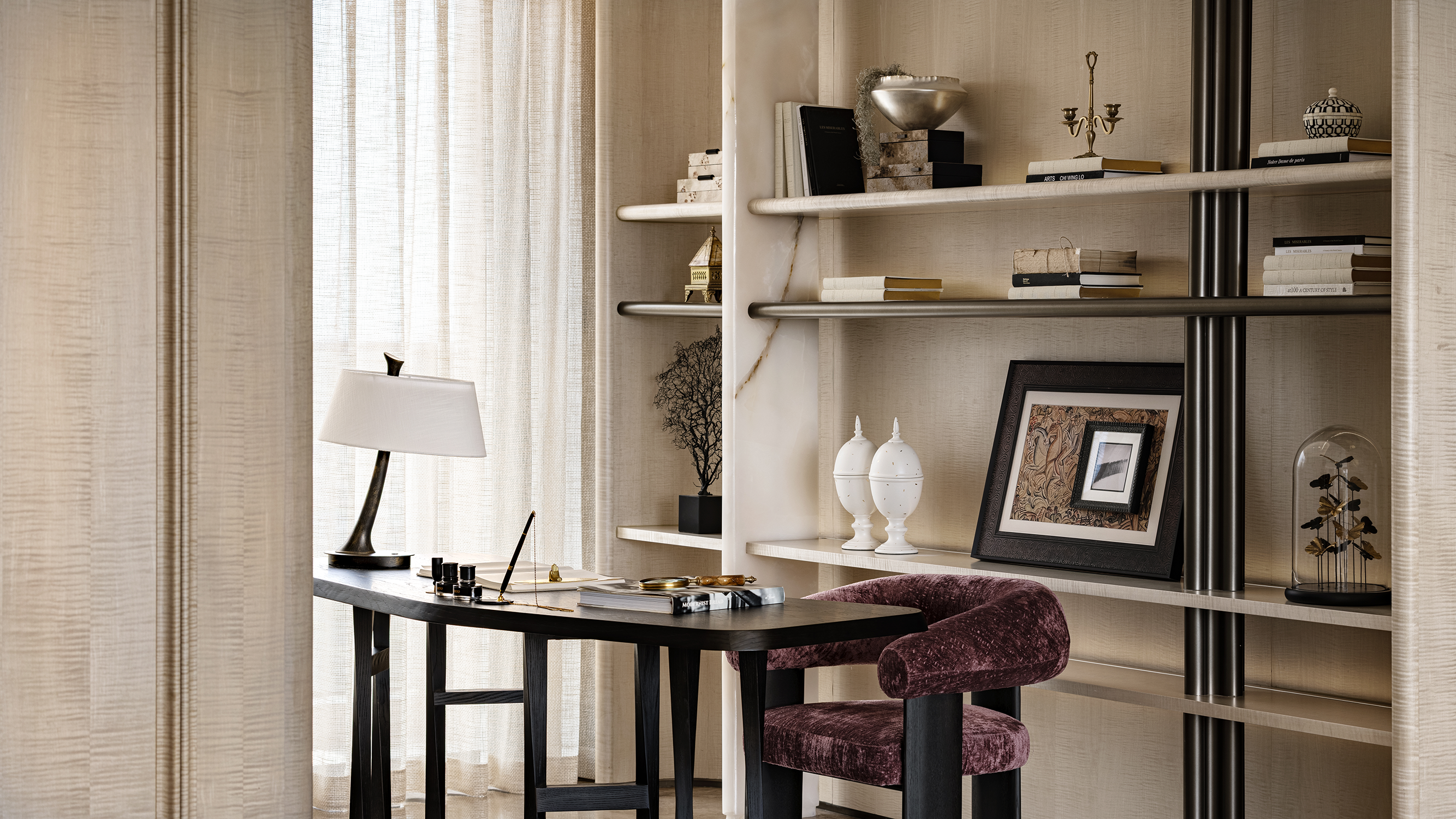 书房简洁,克制,具有雕塑感的书架陈列着自然朴拙的手工艺装饰与精致雅器,令人感受到开阔、舒朗,与恰到好处的格调。