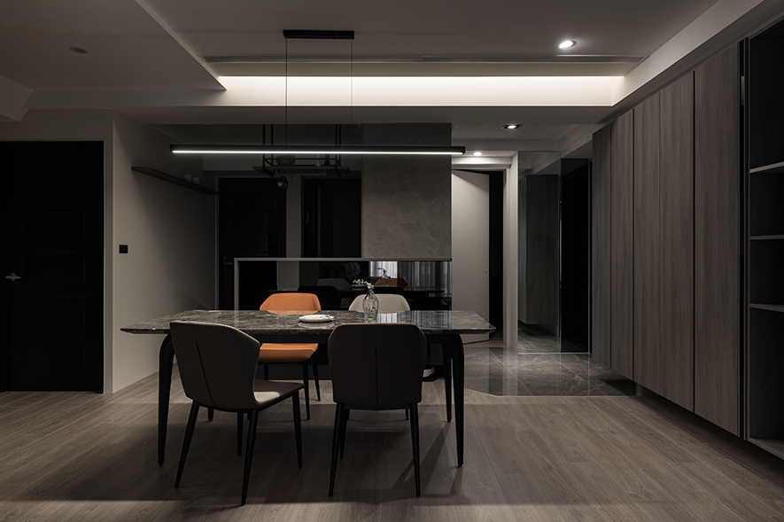棠禾设计 设计总监 曾智和 透过格局的巧妙重塑释放宽阔尺度,令客餐厅在流畅动线中舒展延伸,并以冷色系木纹为基调,特殊涂料沙发背牆的细腻肌理、佐以仿石纹磁砖电视牆的大器沉稳,勾勒层次丰富的视觉端景;隐藏式灯带勾勒天花轮廓,线性吊灯为用餐时光点亮仪式感,而开放层架与封闭柜体的错落配置,则在深色调的宁谧氛围中注入灵动韵律,成就一处兼具都会俐落与生活温度的雅致居所。