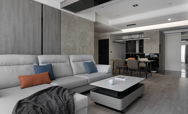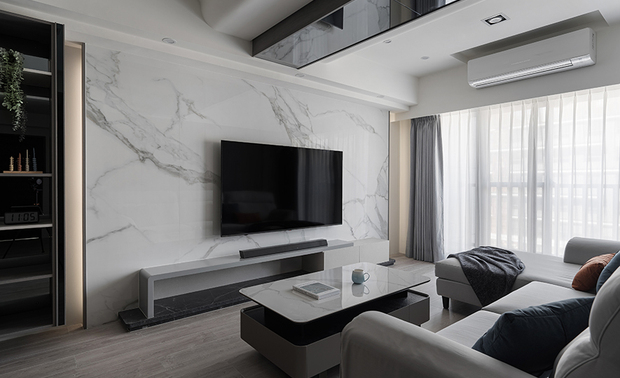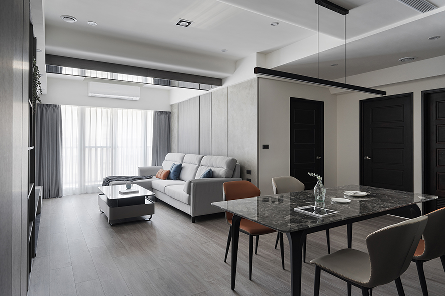 客厅以纯淨的白色石纹电视牆为视觉焦点,其自然肌理与旁侧深色木质展示柜形成明暗对比,开放格架层层递进,错落陈列的精选物件为立面增添丰富层次;而天花板运用弧形包覆搭配镜面反射,将原本横亘的大梁化为优雅曲线,隐藏式灯带勾勒出层次分明的光影轮廓,与落地窗透入的自然日光交相呼应,为灰色布质沙发及黑白茶几围塑的会客区域凝结温润气韵,酝酿沉稳内敛却不失温度的居家氛围。