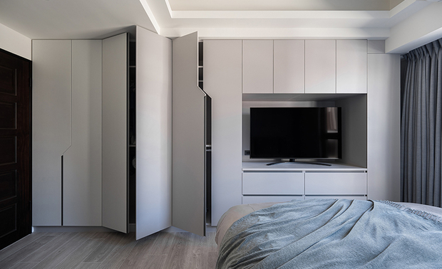 步入主卧,浅蓝色调如清晨薄雾般温柔包覆床头背牆,隐藏门片的设计将浴室入口悄然融入其中,维持立面的纯粹完整,与不对称的几何切割的纯白储物柜门片展开清新对话,斜角线条的灵动设计打破传统方正格局的同时保有简洁美感,共同围塑出简约纯淨的氛围;天壁内嵌的柔和照明如月光般均匀洒落灰色织物床组,增添质朴气息,窗畔垂落的深灰窗帘则为这方天地融入稳重感,在这以轻柔色调为主的私密领域中,交织和煦的安眠情境,为居者实现梦寐以求的恬淡卧房。