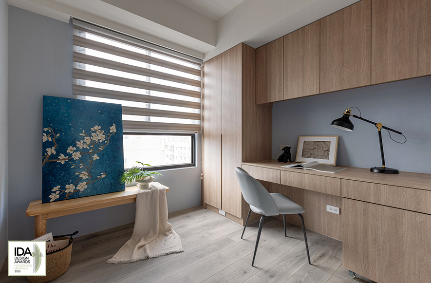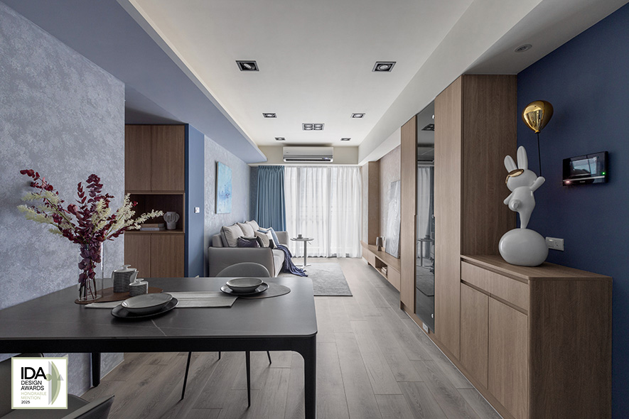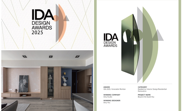 美国IDA国际设计大奖自创新性、实用性和发展性等多种面向为评选标准,旨在发掘、表彰「设立新标准」与「突破室内设计界限」、「改变人们生活和工作空间」的优秀设计师及团队。2025年度赛事中,艾美幸福设计 设计总监 许捷甯 携住宅作品《光韵》角逐殊荣;其设计灵感汲取职业为机师的屋主工作日常——将在万尺高空俯瞰的云海与天光变幻,化为空间中层叠的蓝调与灰白色彩;之中首度引入德国AURO艺术涂料,以手工复合技法于牆面塑造起伏质感,搭配暖木色系点缀其间,让居者彷彿置身云端,感受晨曦与暮色的自然流转,高度契合此赛事多方理念,荣获「Honorable Mention」佳绩!