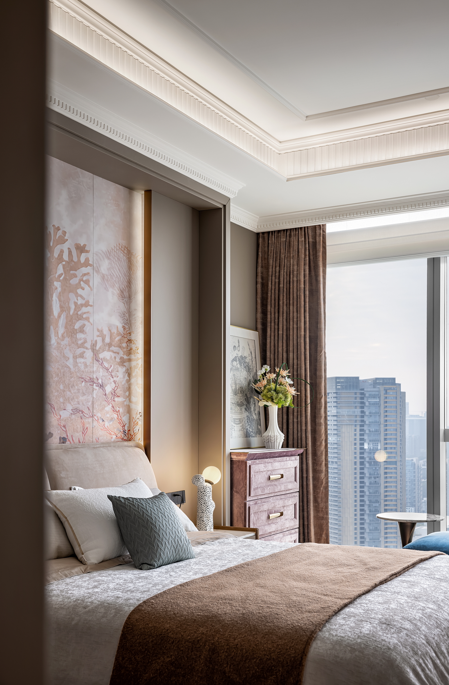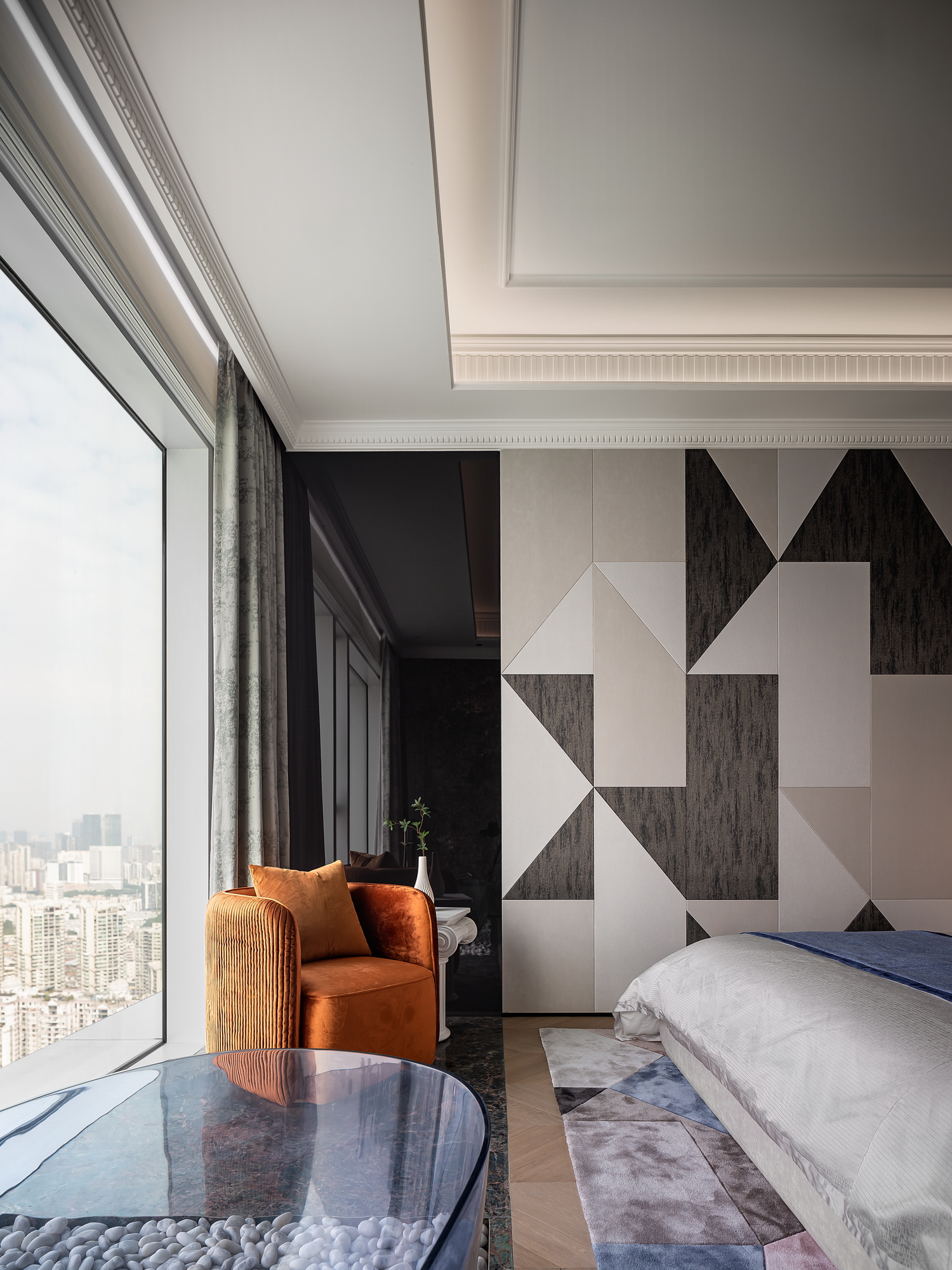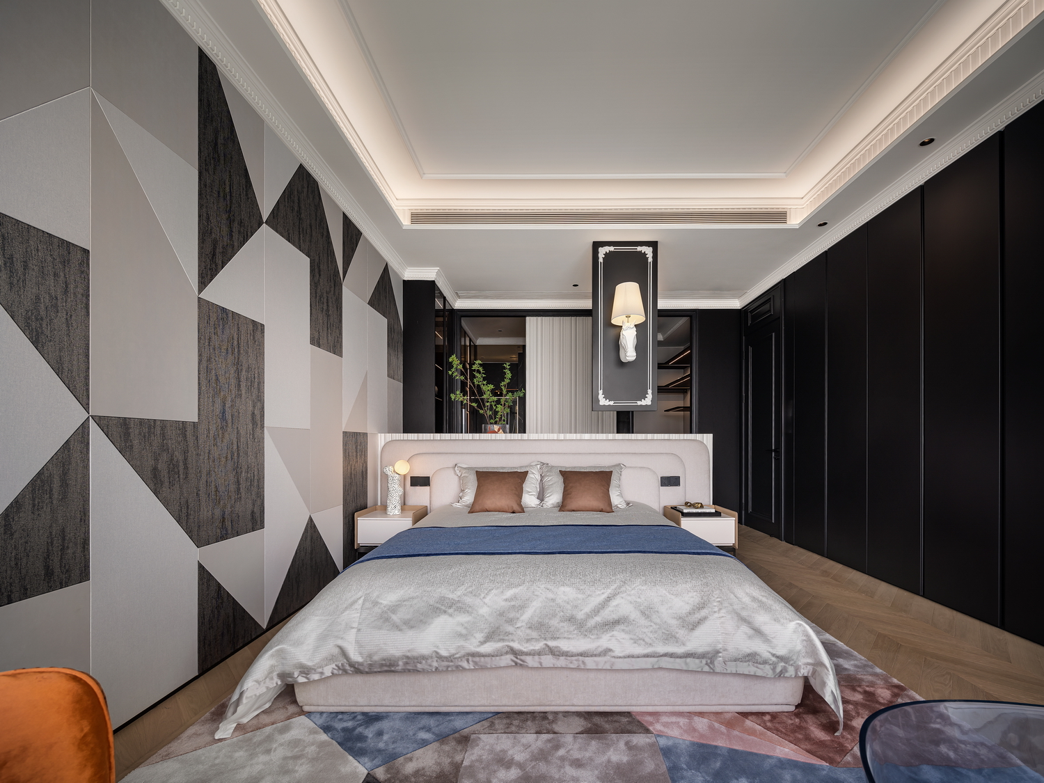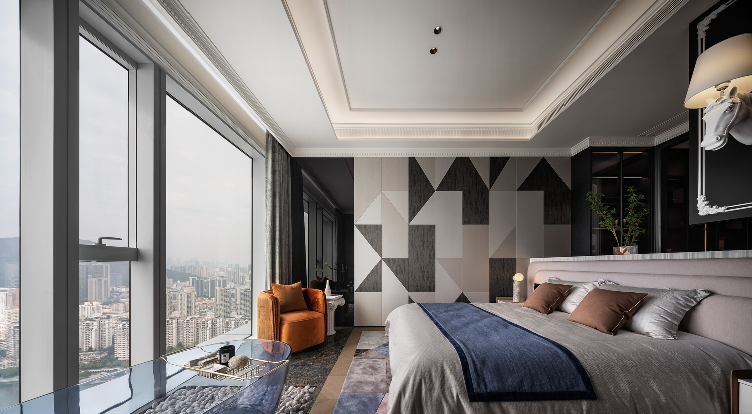 卧室是休息的港湾,也是Art Deco风格的温柔角落。床头背景墙的几何图案,与柔和的灯光相呼应,营造出宁静而奢华的氛围。简洁的床品和几件精致的装饰品,让空间在艺术感中不失温馨。 -