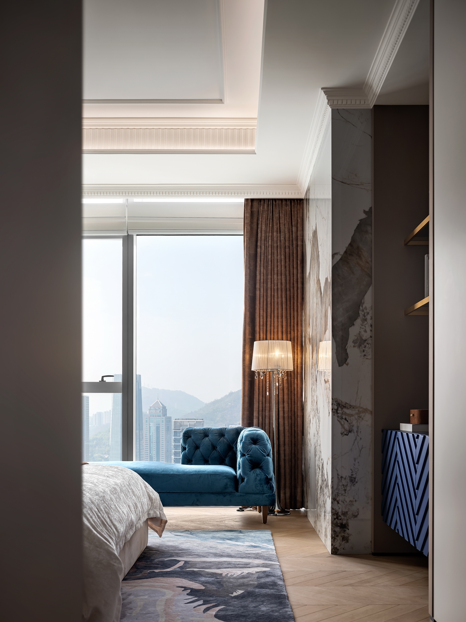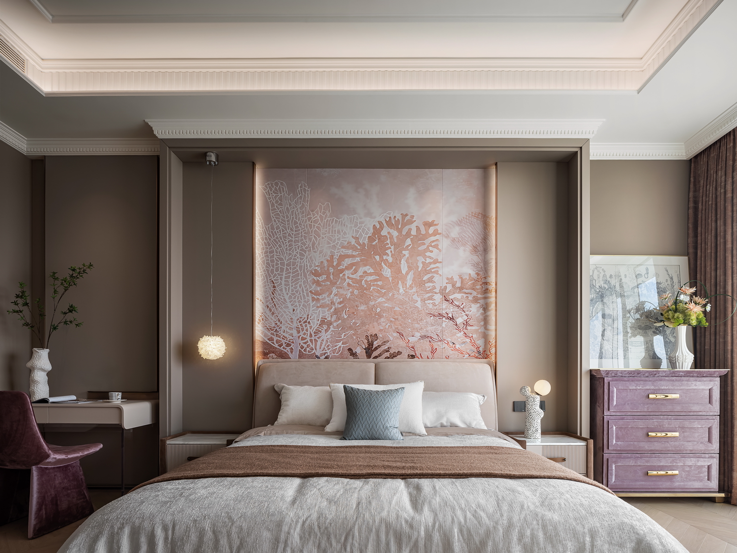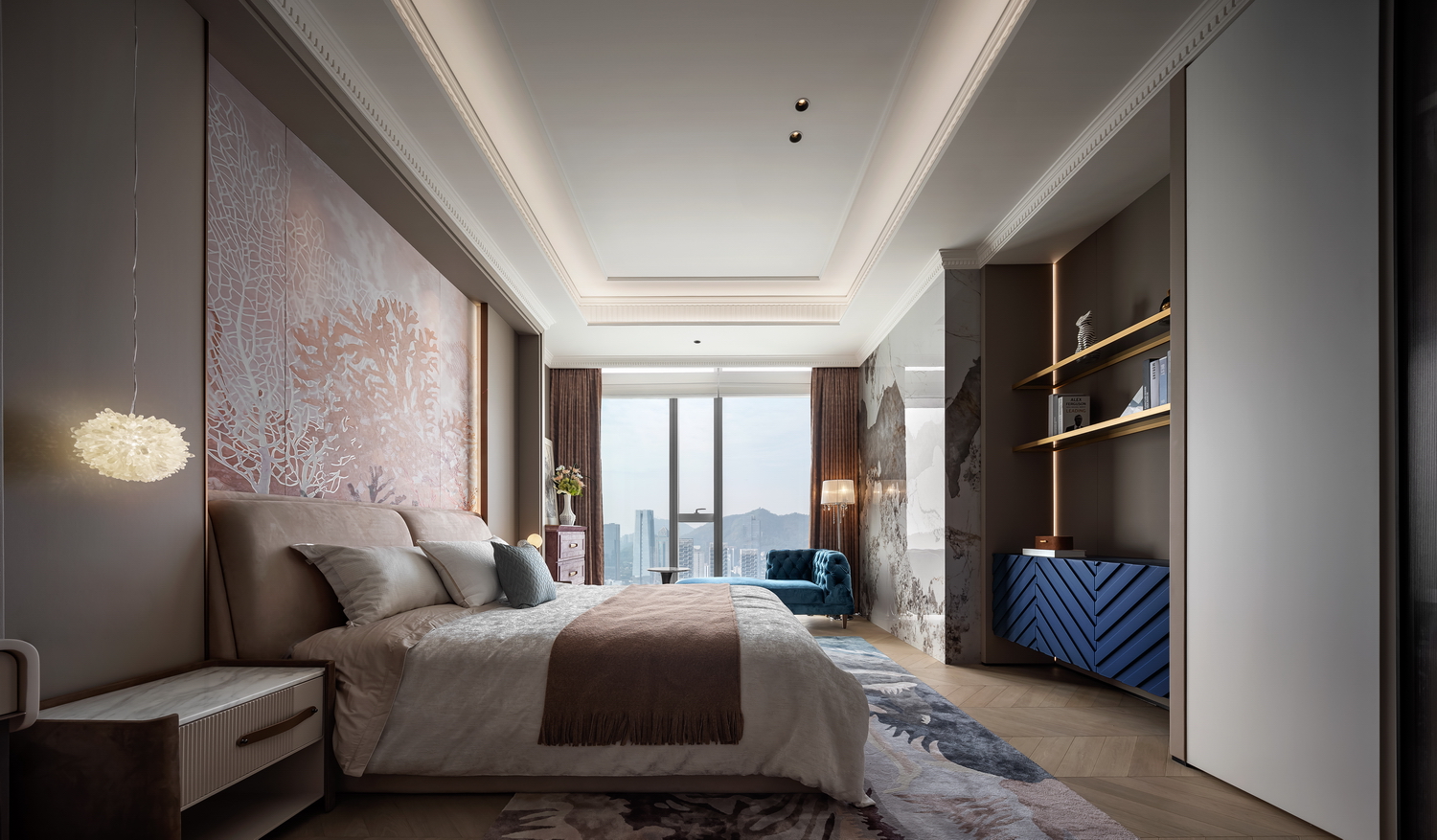 卧室是休息的港湾,也是Art Deco风格的温柔角落。床头背景墙的几何图案,与柔和的灯光相呼应,营造出宁静而奢华的氛围。简洁的床品和几件精致的装饰品,让空间在艺术感中不失温馨。 -