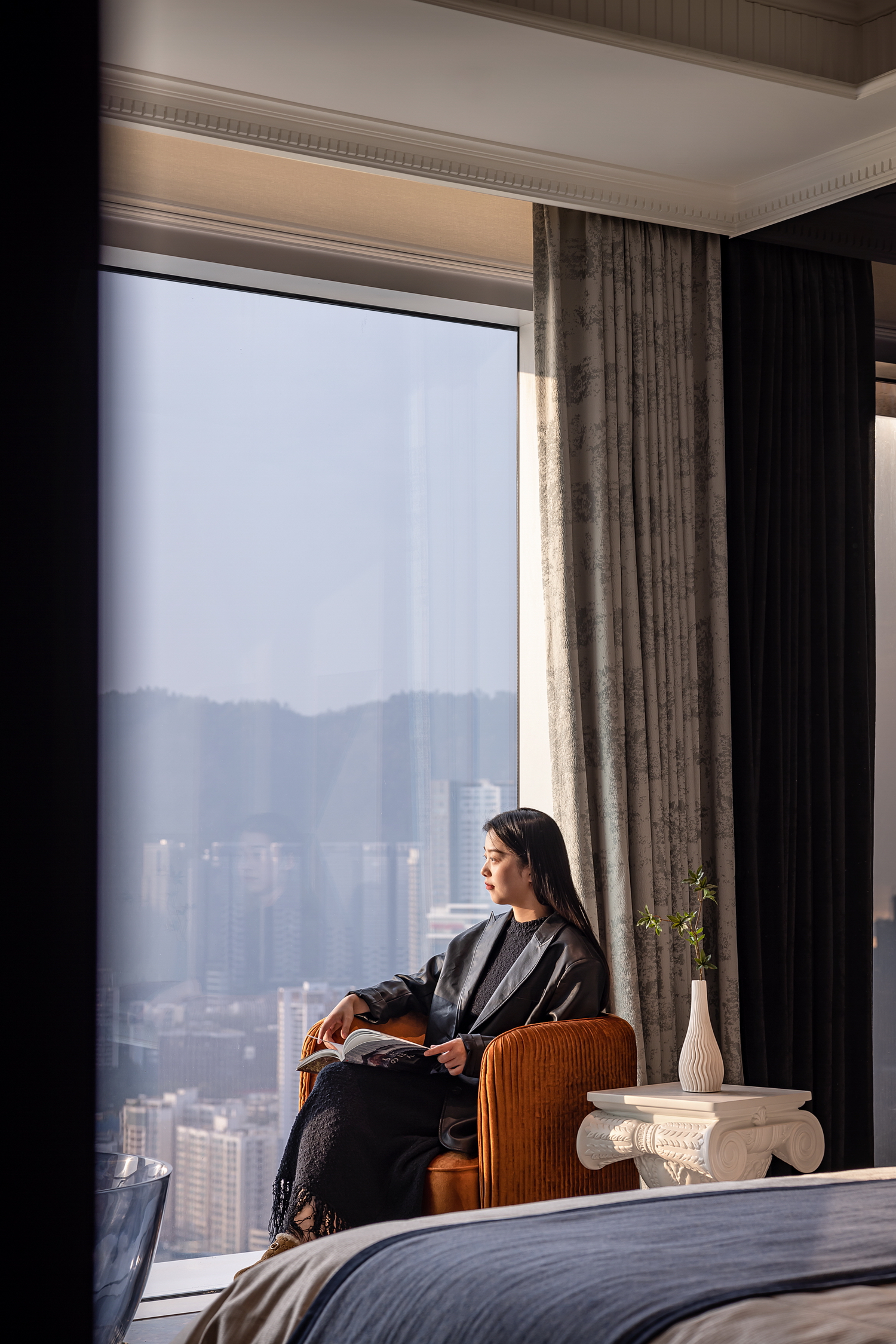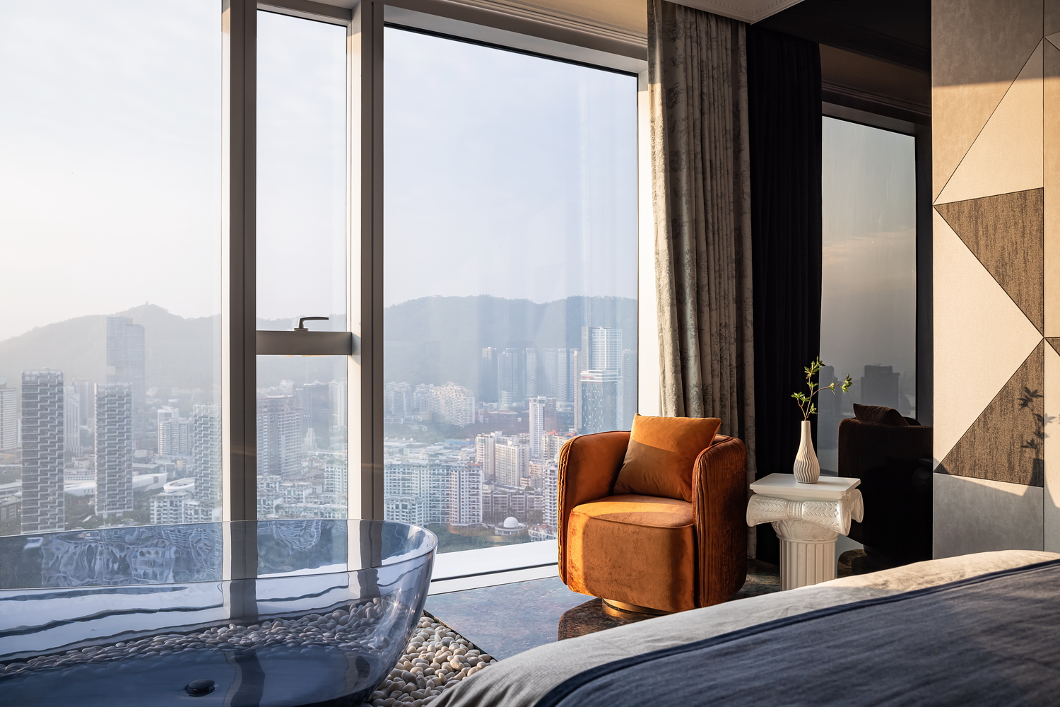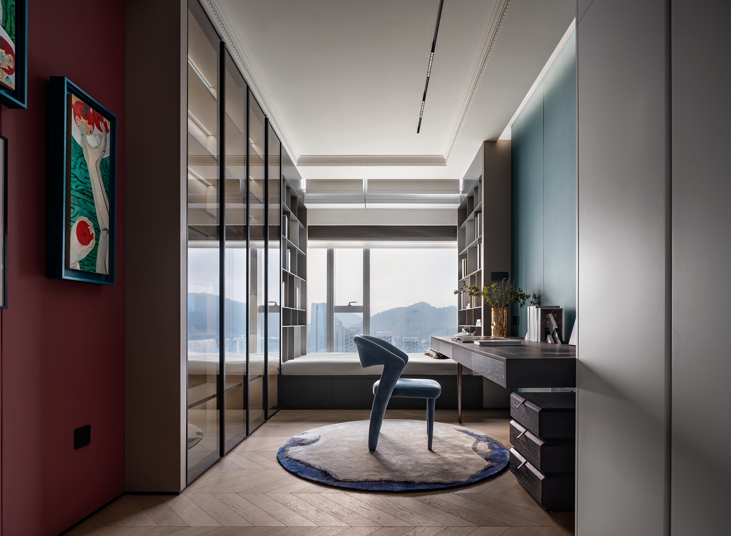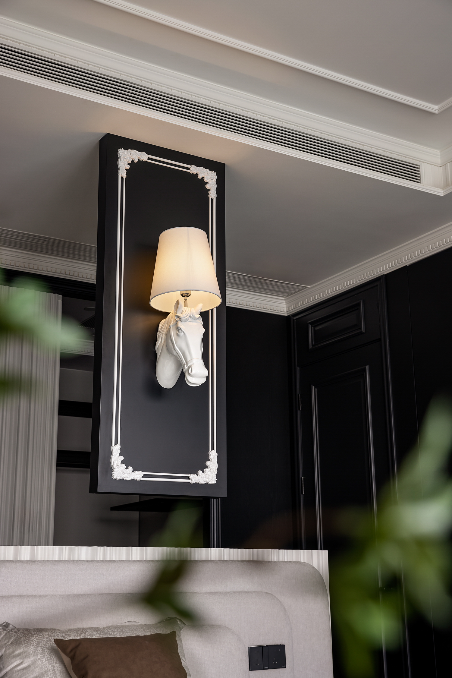 卧室是休息的港湾,也是Art Deco风格的温柔角落。床头背景墙的几何图案,与柔和的灯光相呼应,营造出宁静而奢华的氛围。简洁的床品和几件精致的装饰品,让空间在艺术感中不失温馨。 -