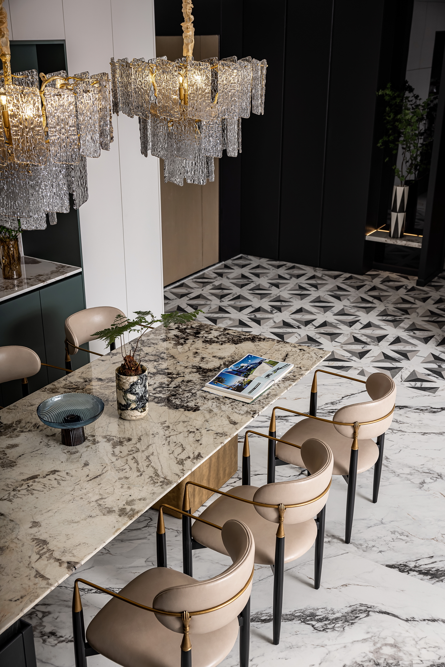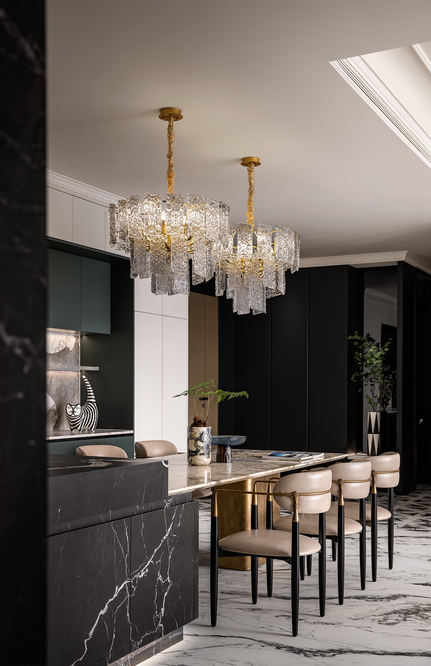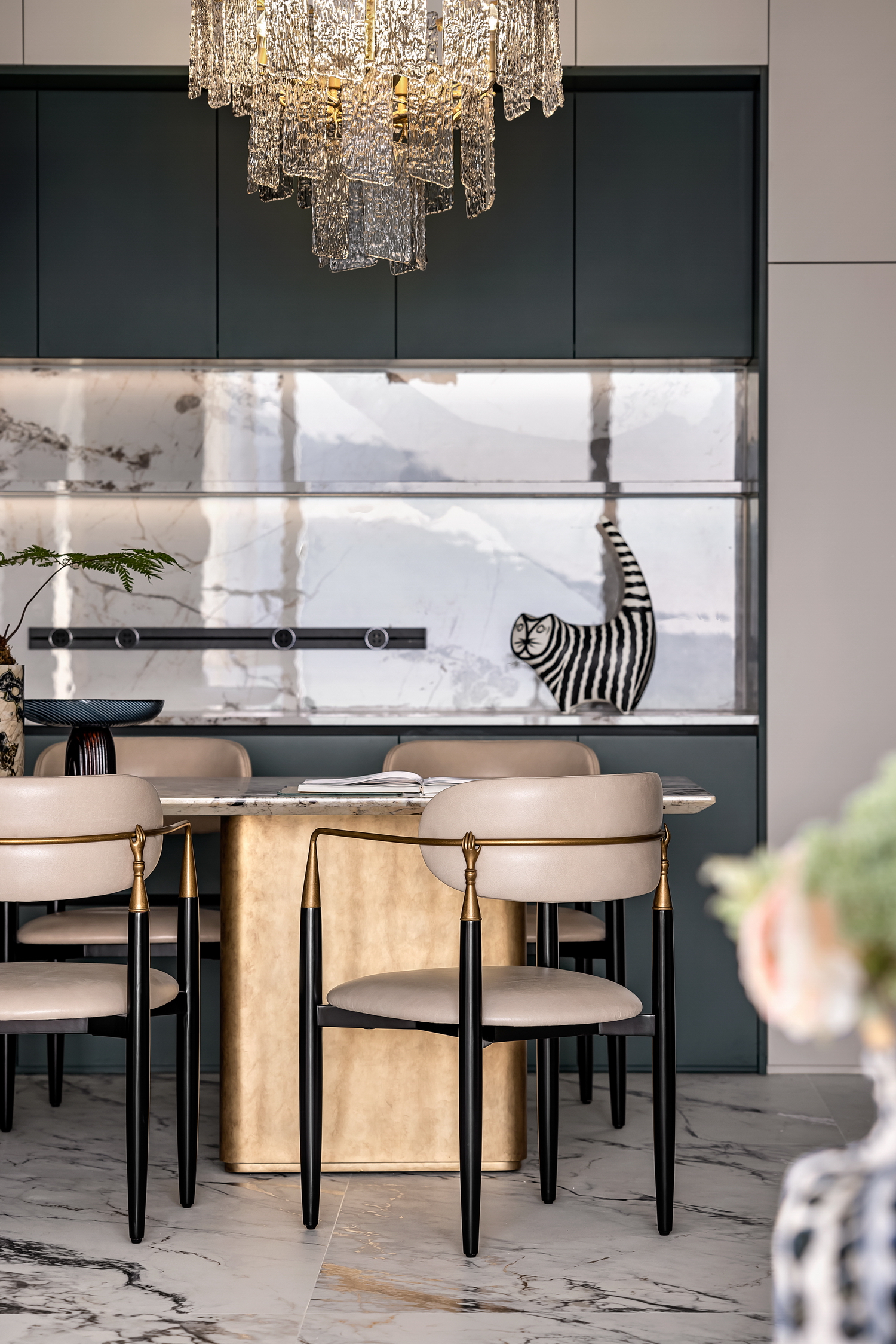 餐厅的设计同样别具一格。一张造型简洁的餐桌,搭配几把带有复古造型的餐椅,再配上二盏造型独特的吊灯,光影交错间,营造出一种优雅而舒适的用餐氛围。在这里,每一顿饭都仿佛是一场艺术的盛宴。