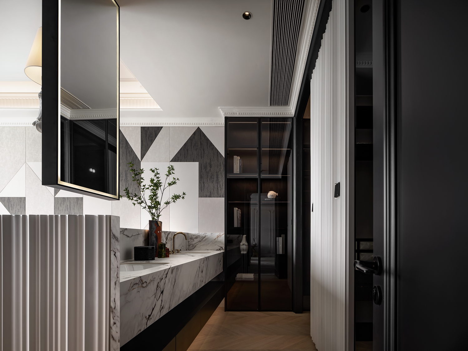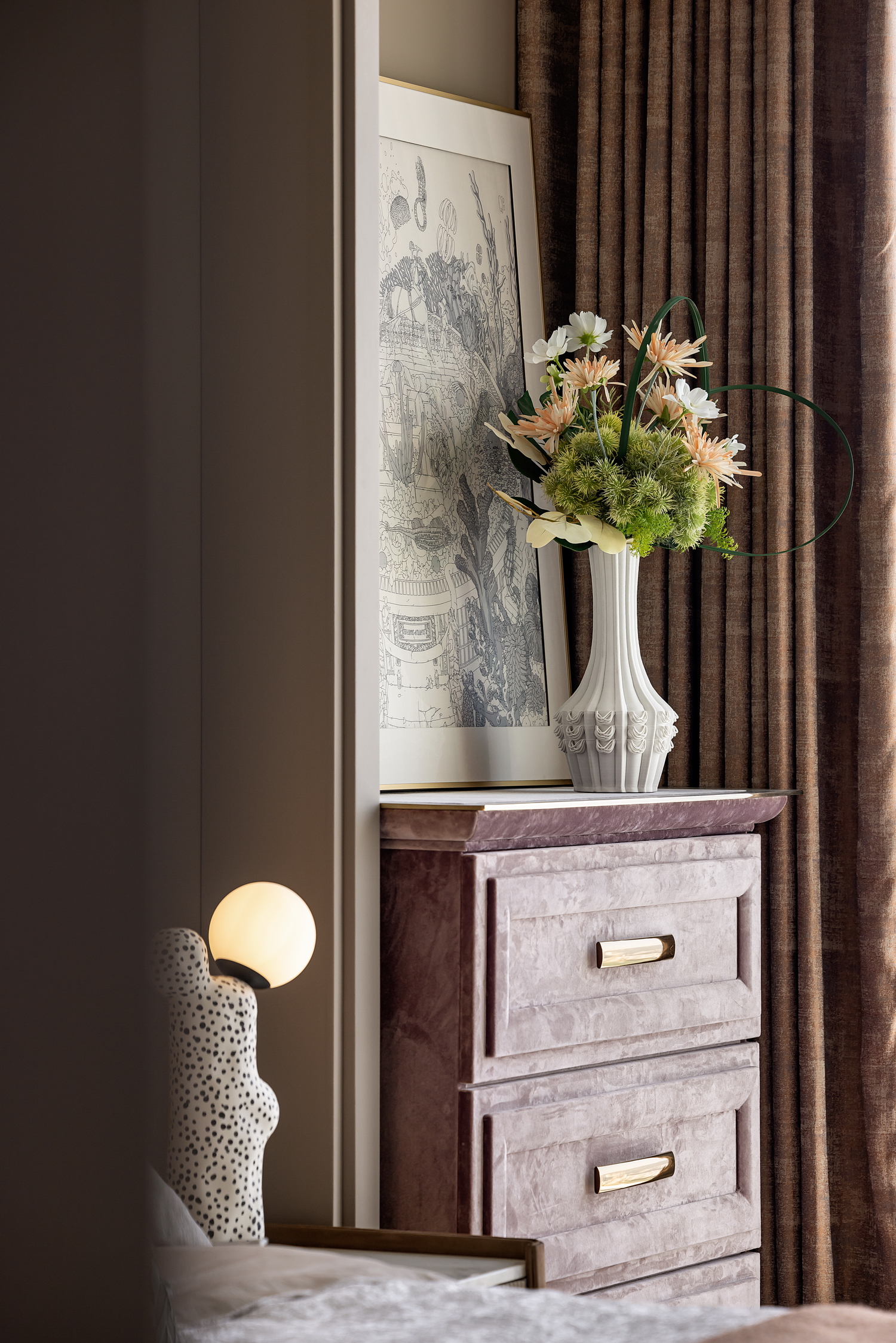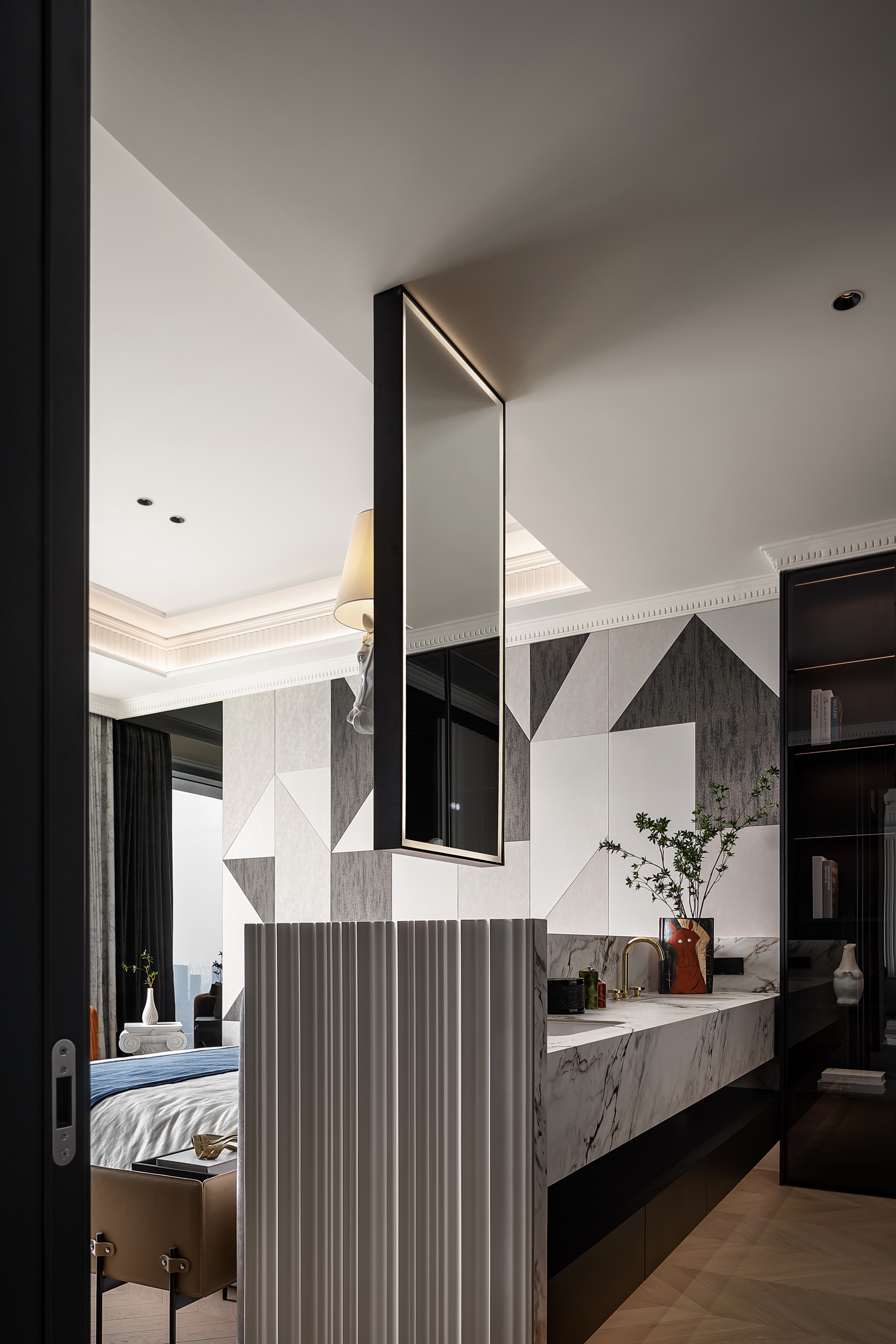 卧室是休息的港湾,也是Art Deco风格的温柔角落。床头背景墙的几何图案,与柔和的灯光相呼应,营造出宁静而奢华的氛围。简洁的床品和几件精致的装饰品,让空间在艺术感中不失温馨。