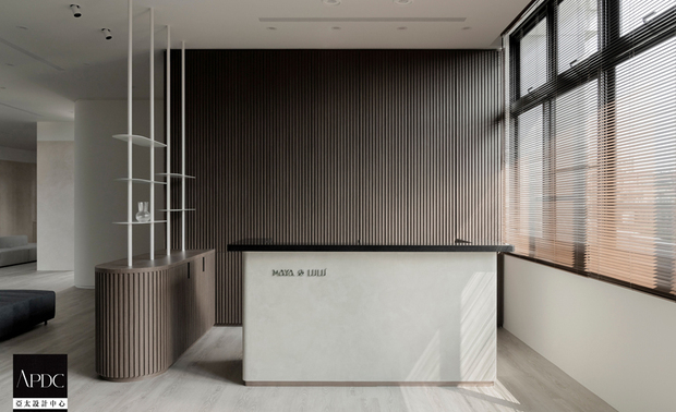 ▲入口柜体以大地色系特殊涂料铺叙沉稳底蕴,迎宾区域廊道则选用灰白色调,营造宁静舒心的过渡场域。接待柜台右侧大面窗引入自然光,与背后格栅式的实木条映照出阴影变化,衬托出自然温润质感。
