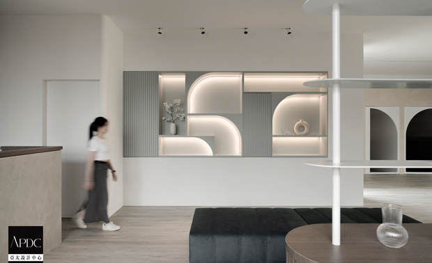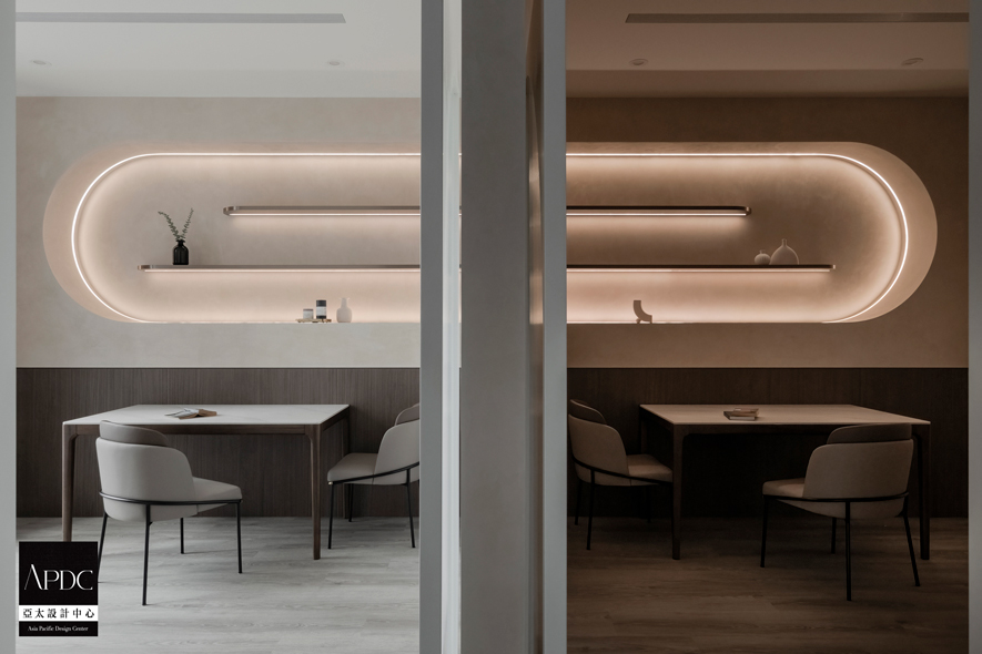 ▲洽谈区色调延续外部灰白与浅木色的设计语彙,并于牆面展示架置入俐落线框,弧形灯带交织大面窗引入的明亮日光,形塑清新愉悦之感;随着时间推移,室内渐趋昏暗,仅用灯光营造意境层迭,诠释极简美学,低调中展露品味底蕴,成为同客户畅谈的绝佳场域。